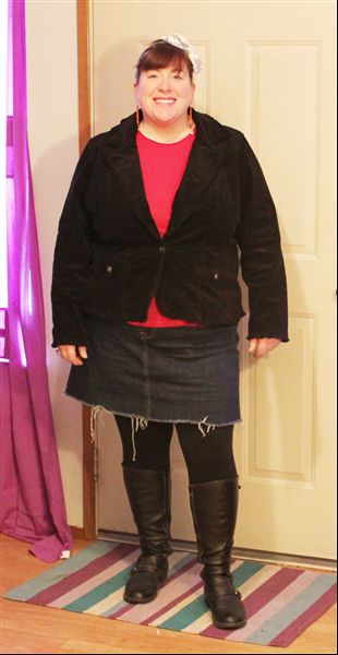 Shirt, skirt (shortened by me), leggings – Old Navy, Blazer, Boots – Ross