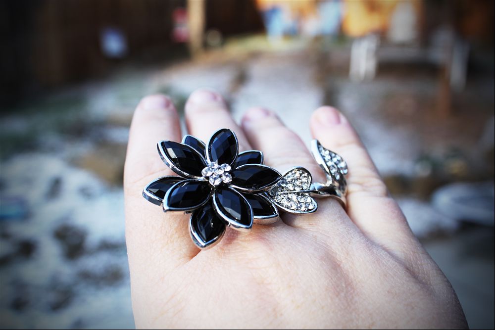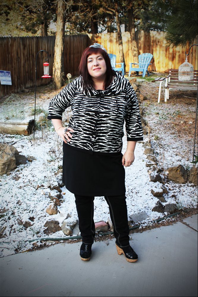 Still layering lots for me. Very black & white today. I adore the cardigan that I am wearing, I always feel so fifties retro in it. The collar is wonderful. My hair is looking pretty retro with my head band in as well. I’m wearing a two-finger ring that is very blingy, but it brightens up my day!