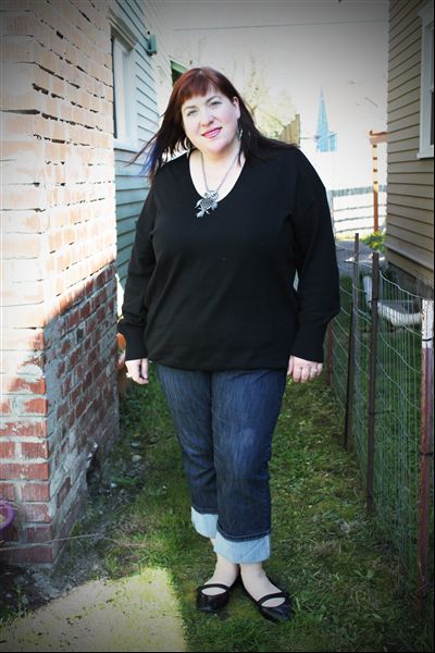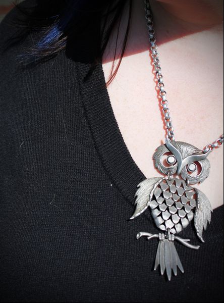 Another quick photo post. I’m wearing another of my super dooper Old Navy clearance finds – an oversize black sweater. I also have on one of my vintage owl necklaces. Love!