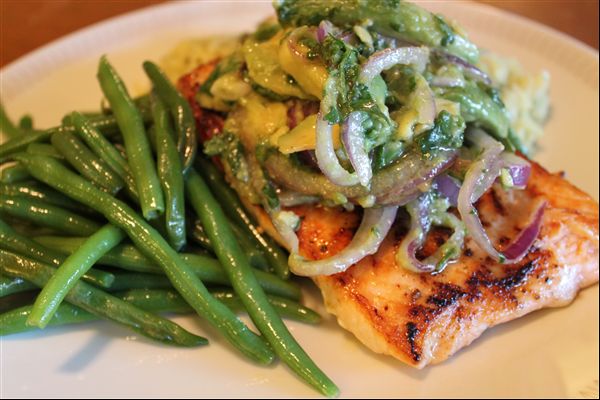 Jude was a bit shocked & horrified that I made salmon without capers tonight! How could I?!? Well, I did & it was yummy. I wanted to try a new salmon recipe & I came across this one. Up until recently, I have not been a fan of raw onion. Lately, it’s been growing on me. Onions are at their best when they are caramelized, but raw ain’t too bad. Sorry Mom! I know you don’t like raw onions, but I’m starting to.