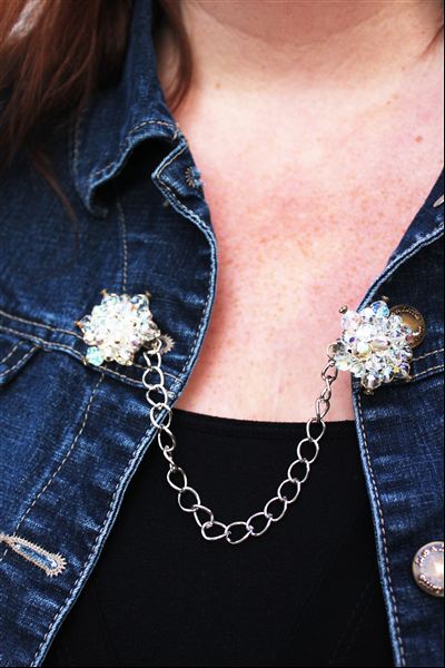 Last week I wore a denim jacket & accessorised with a DIY sweater clip. I love vintage jewelry & I think that clip on earrings are gorgeous. I do wear them as earrings, but I’m always looking for other uses for them. For the sweater clip, I simply used some chain I had on hand & attached it with jump rings to the earrings. Then I clipped the earrings on to my jacket. Super easy & I love how it looks.