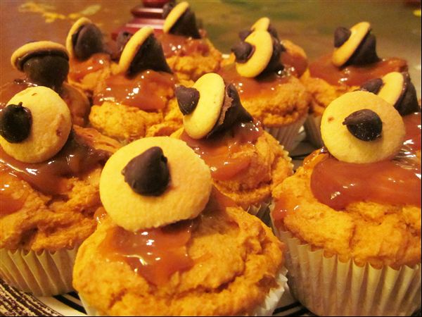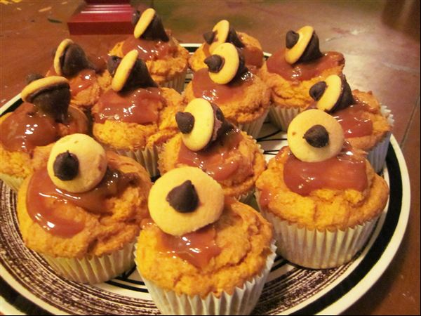 I made a couple of new sweet treats. The first is pumpkin cupcakes. I saw the idea on Pinterest to use a box cake mix and mix it with a can of pumpkin – no other ingredients – to make a cake. I decided to try it out. I used a yellow cake mix, canned pumpkin & because I wanted to accentuate the pumpkin flavour, I added nutmeg, cinnamon, all spice & ground cloves. I chose to do cupcakes & topped them with caramel sauce & an acorn (made previously, here). I thought they turned out really well – they were moist & very appropriate for Fall. I loved the caramel sauce too.