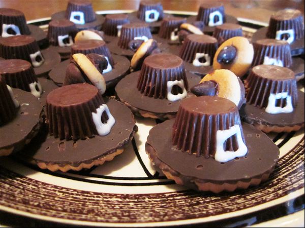 Finally, I made some fun little pilgrim hat cookies, seen here. I used fudge stripe cookies & mini Reeses peanut butter cups. I attached them together & drew on them with writing icing.