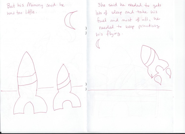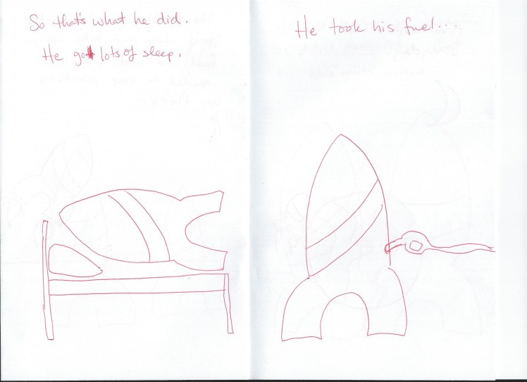 Jude loves to write and illustrate books. I love seeing his imagination take off and wondering what he will come up with next. I encourage him to do it and help him with the logistics when he wants to write. So, when he challenged me to write a story, I could hardly refuse. I wrote and illustrated the following book in about ten minutes with a ball point pen and some copy paper. I wasn’t too sure about it at first, but once I started, it was heaps of fun.