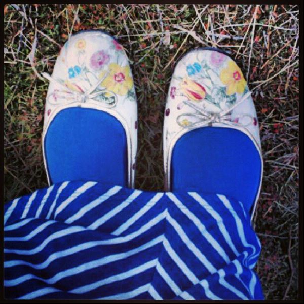I celebrated by wearing my floral flats and bright blue tights with some stripes. I totally blanked on getting outfit photos, but I grabbed this shot of my shoes.