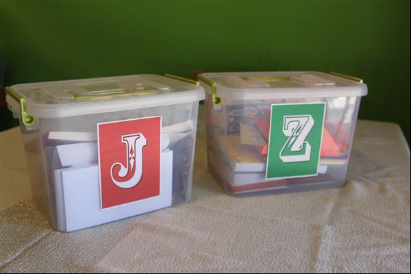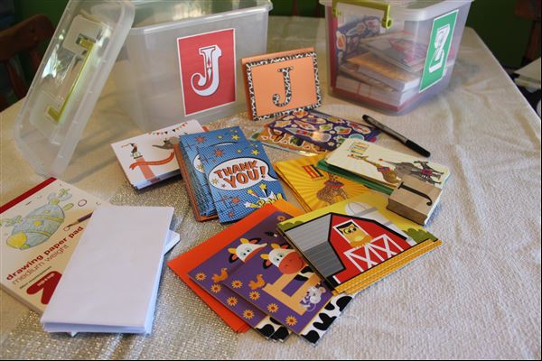 Like I said, it’s not always easy to make the time, but I figure let’s make it as easy as possible when inspiration strikes and when it’s time for a thank you. So I came up with the idea of a Correspondence Kit for each boy. I purchased a small plastic container with a handle for each of them. I printed out their initials on label paper and added it to the outside.