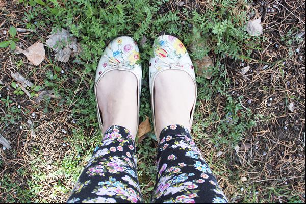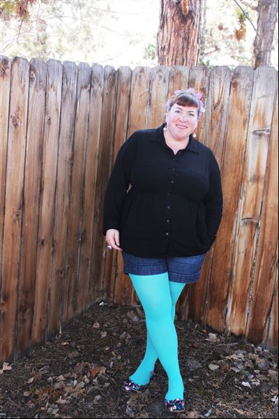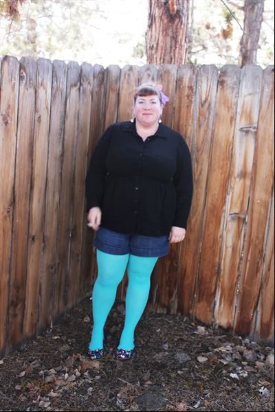 Outfit Details: Shoes – Ross, Tights – Forever 21, Shorts – Torrid, Shirt – Torrid, Earrings – Walmart, Hair Flower – Ross