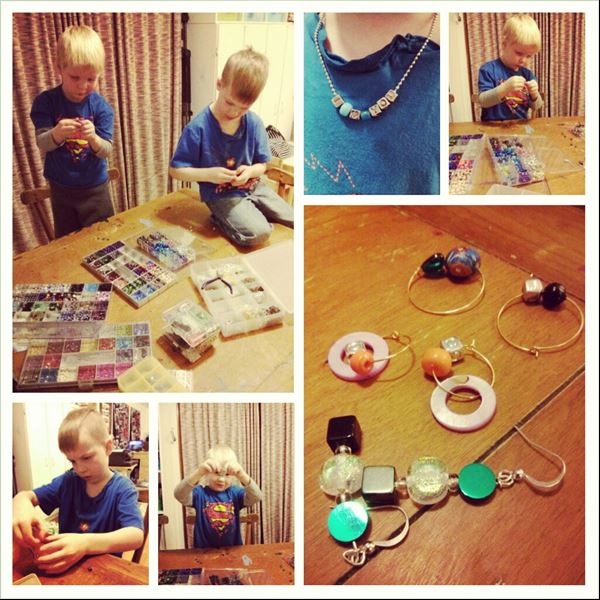 Anytime I get craft supplies out, my boys want to join in and start creating. In November I did a big craft clear out and got rid of heaps of stuff that wasn’t being used and organized the rest. All of my crafting supplies are stored in the garage since I don’t have a craft room. While I was organizing, the boys saw my jewelry making supplies and were asking repeatedly to make jewelry with me. So one evening while Colin was out, we set to it. It is so fun creating with my boys – I love to see what they come up with.