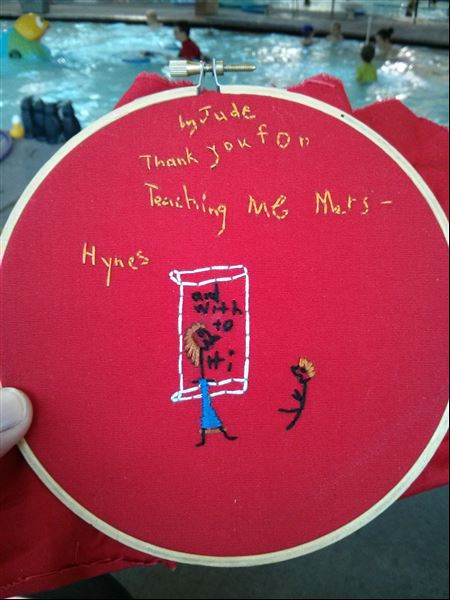 For Jude’s first grade teacher, I had Jude making a drawing with a note and then I traced it on to fabric and then embroidered it for her. I think it’s a fun, simple and meaningful gift.