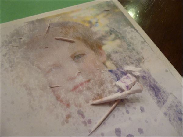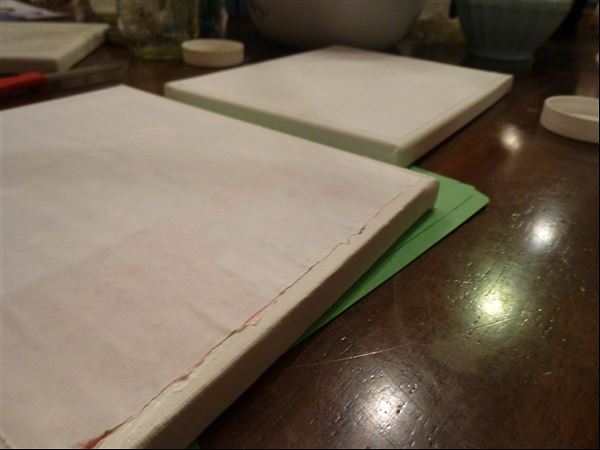 Before the party I copied two photos onto paper using my ink jet printer. The canvases were 8×10. The first step was to trim the photos down to the appropriate size – I did a rough tear because I didn’t want to have a smooth edge.
