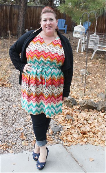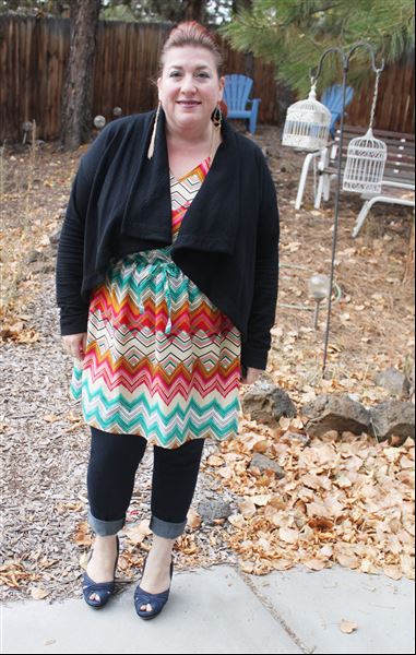 Outfit Details: Dress – Lane Bryant, Cardigan – Target, Jeans – Torrid, Earrings – Forever 21, Shoes – Qupid via Goodwill