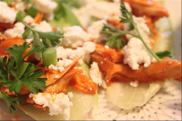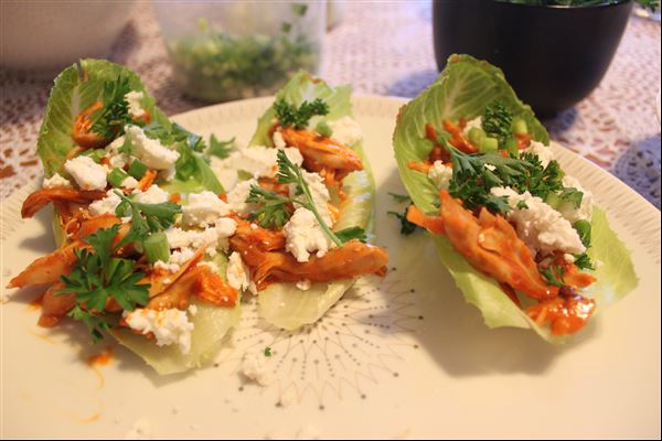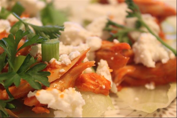 I have made Chinese-style lettuce wraps, Mexican-style lettuce wraps and these, Buffalo chicken wraps. These were so good and the lettuce and goat cheese were a nice balance to the heat of the Buffalo sauce.
