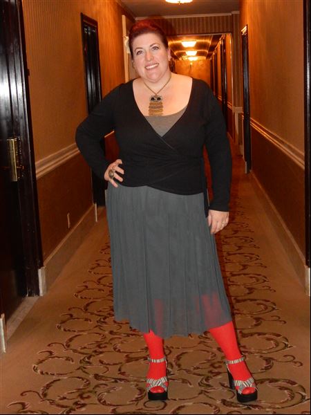 So, what does one wear to meet an amazing designer that you really admire? I’m usually a pretty quick dresser, I don’t take a lot of time choosing outfits or trying on multiple things, but that was not the case this time. I have no idea how many things I tried on. It was super fun though because it had me reaching deeper into my wardrobe than I have in a while and trying different things. I wanted to be comfortable as we would be walking around in downtown Portland, I wanted to look cool and interesting, but I didn’t want to look like I was trying too hard. I have no idea if I succeeded on all counts, but I was comfortable and Michelle didn’t look at me with pity or anything. I wore a knit dress with a tulle skirt from Target, an ancient ballet-style top from Target, red tights from Forever 21, shoes from Blowfish and a vintage, articulated owl necklace.