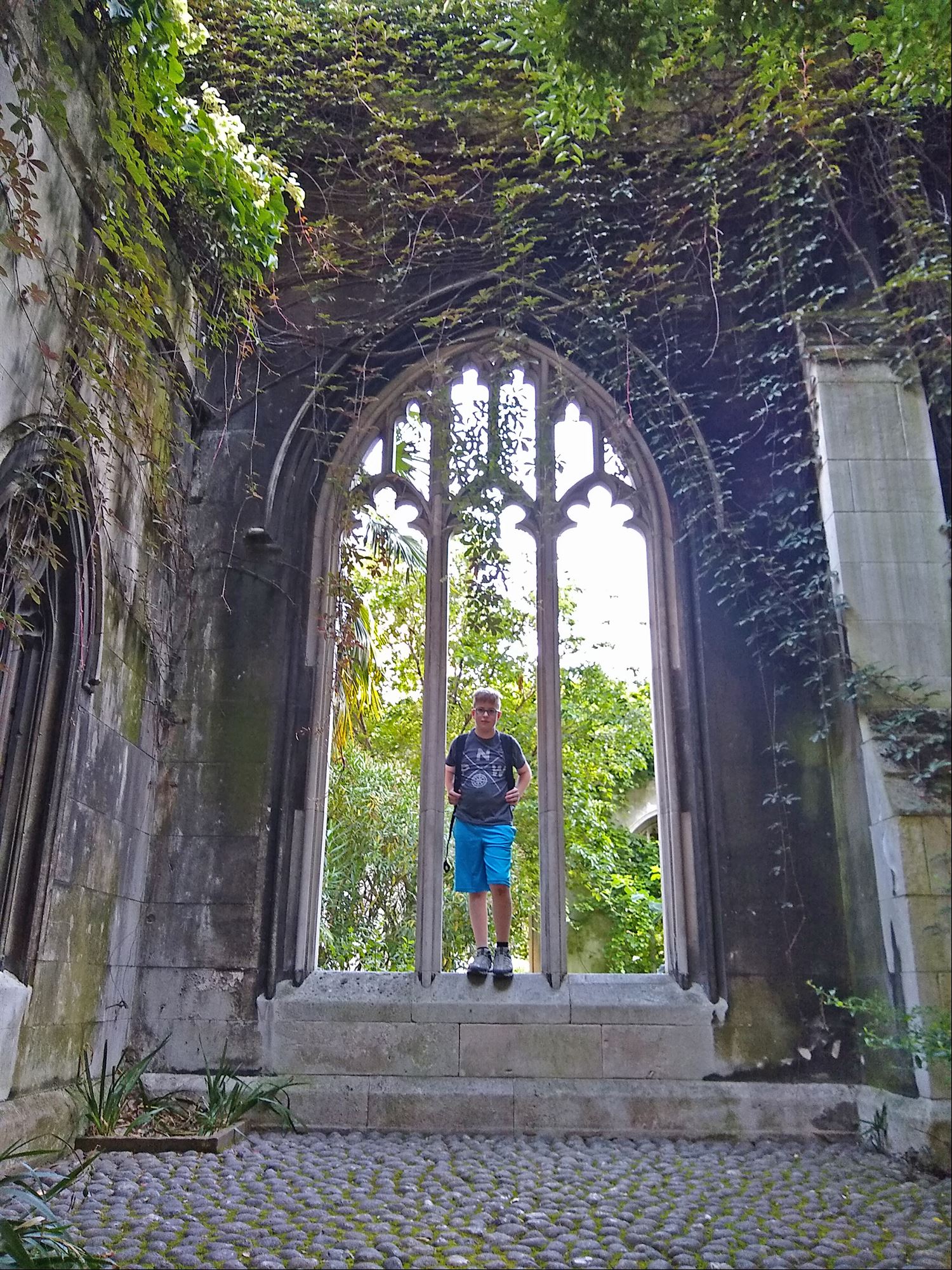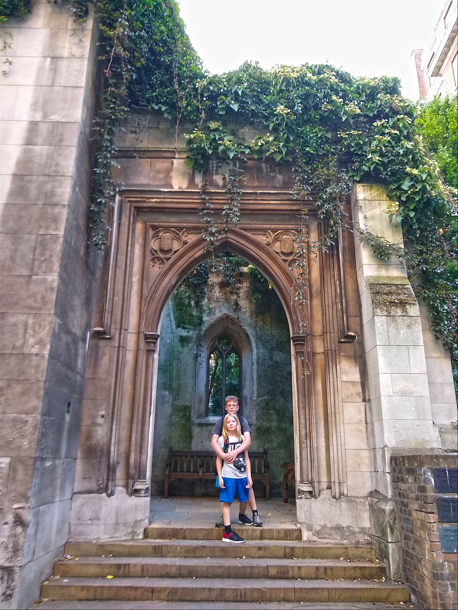 Then we wandered through The City towards St Dunstan-in-the-East. The City on a Sunday evening is perfect to see the sights, and enjoy the architecture and art as there are no crowds. St Dunstan was one of my Pinterest finds and it did not disappoint. It’s a garden inside the ruins of an old church. We had it to ourselves for most of the time we were there and it closed right after we left. It was a bit magical.