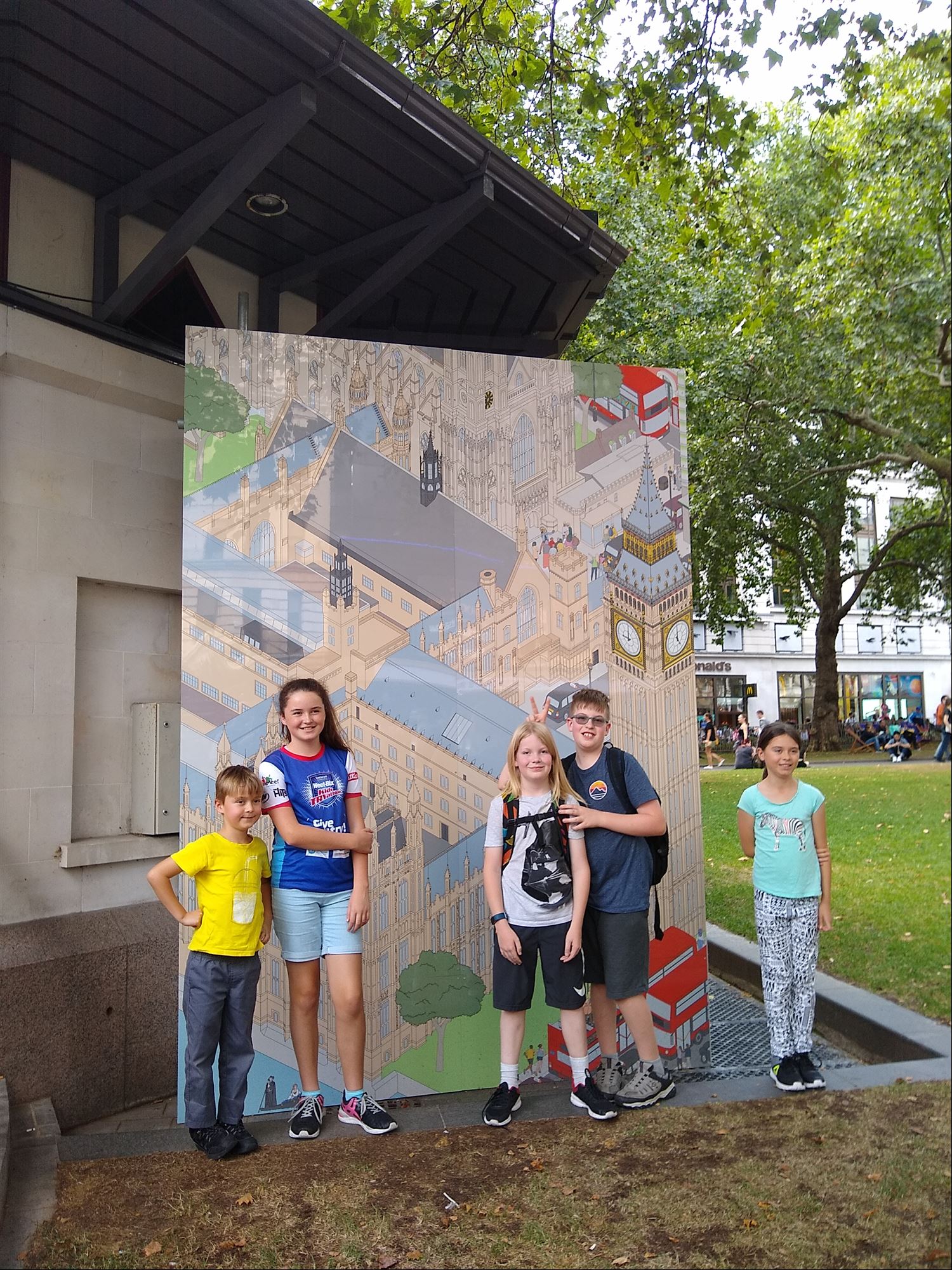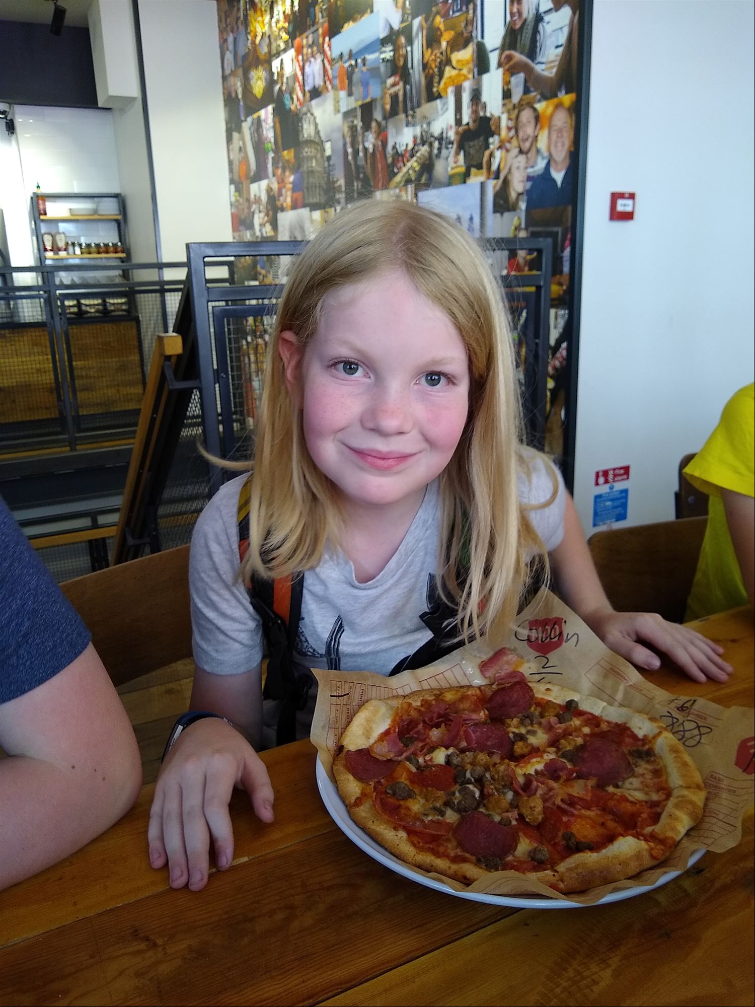 Then we were on the bus to Leicster Square. We got to ride one of the newer double decker buses that is made to look like one of the old buses. Zane had chosen MOD Pizza for his birthday meal. It did not disappoint and we really enjoyed our meal. The NZ Blacketts gave Zane a new game called Saboteur for his birthday.
