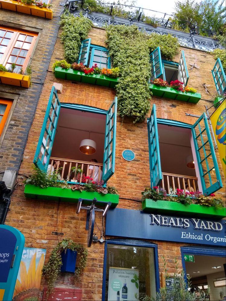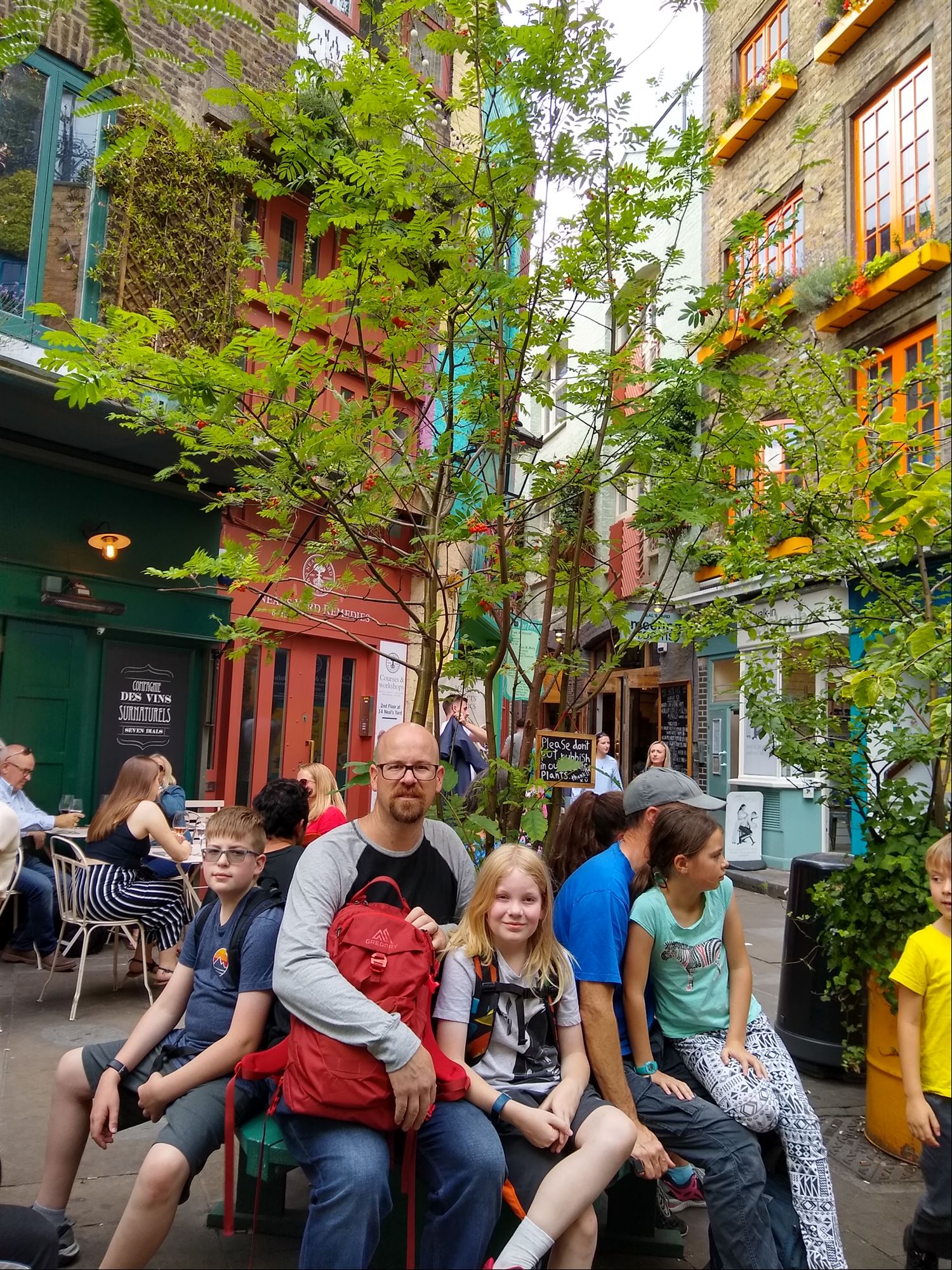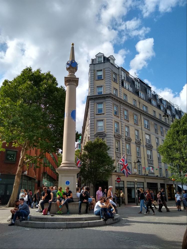 After lunch we headed to Covent Garden to have a look around. They have a great market and the boys saw some cool clocks including a Fibonacci clock that was really interesting. We didn’t spend much time here and carried on to a couple of spots that I had read about on Pinterest in the Covent Garden area. The first one was Seven Dials which is basically a little roundabout with a spire in the middle of it and seven streets coming off of it. It was noteworthy, but not worth spending much time there. Then it was on to Neal’s Yard. This turned out to be a really sweet little spot, a courtyard surrounded by brightly painted shops. It was nice to sit down and enjoy a few quiet moments and then plan the rest of the day. Spotted a Blue Plaque and discovered that Monty Python had their production offices here from 1976-1987.