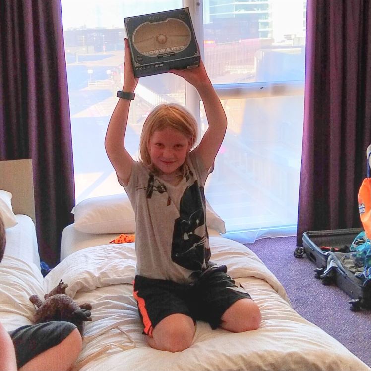 Met up with the NZ Blacketts for a look at Platform 9 ¾ and the Harry Potter Store. Zane hasn’t read the books or seen the movies yet, but he’s played the Lego Video Game so he was quite keen to check it out. You can get your photo taken at the Platform 9 ¾ cart in the wall thing, but it was an hour long wait and he wasn’t quite that keen to do it. We explored the shop though which was crowded, but fun to see all the HP stuff. Zane spotted something that he really wanted, but it was quite expensive. Colin quickly looked online and found that we could get it elsewhere for half the price.