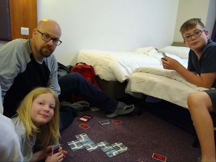 Back at the hotel, after much ceremony, we gave Zane his Harry Potter Flying Snitch and he was thrilled. The boys practiced their magic tricks and then we played a game of The Saboteur.