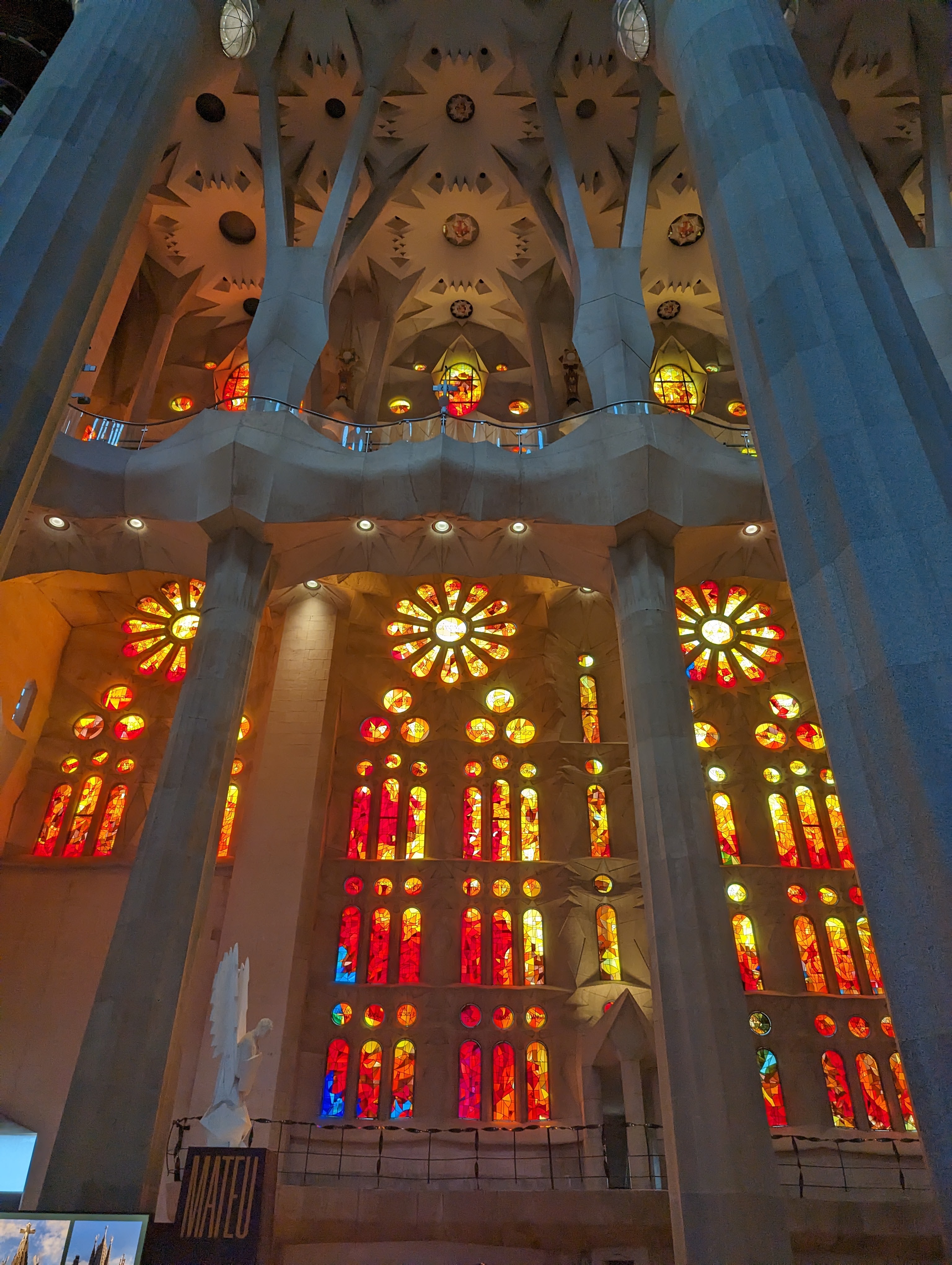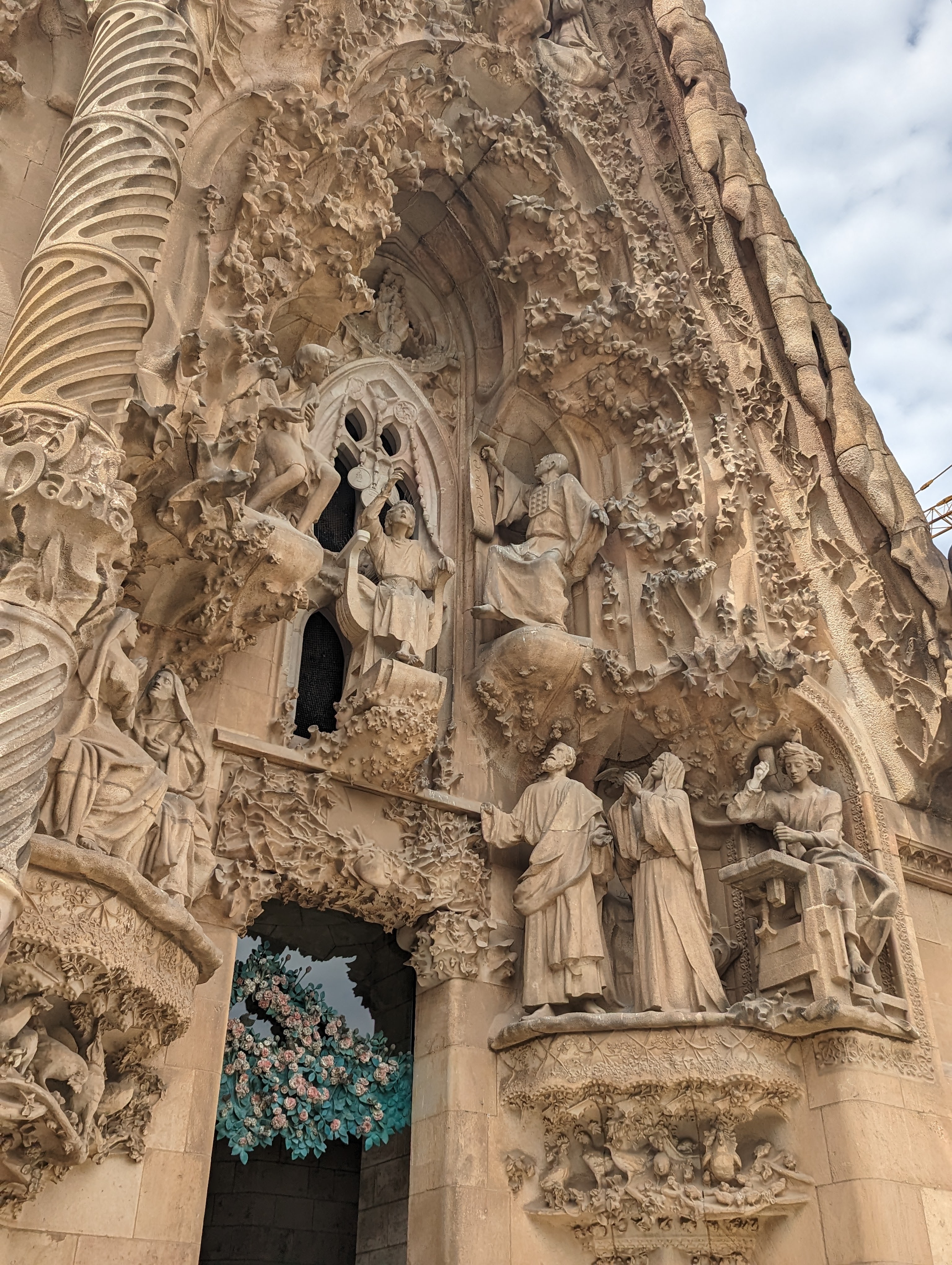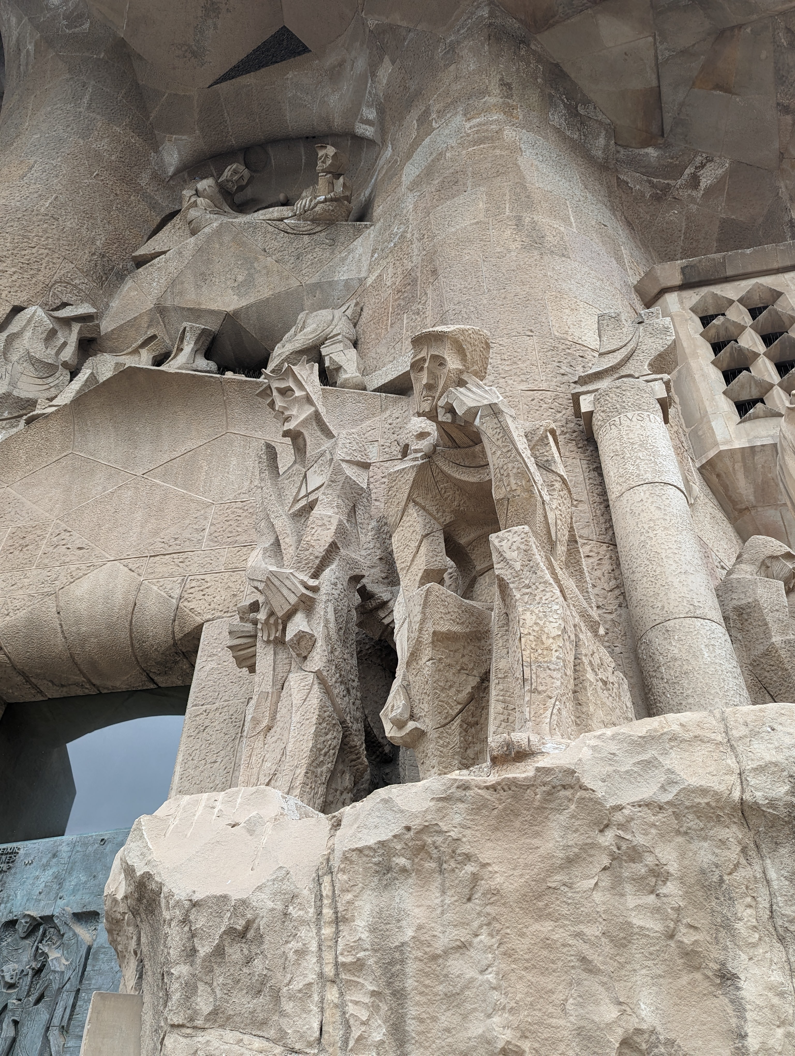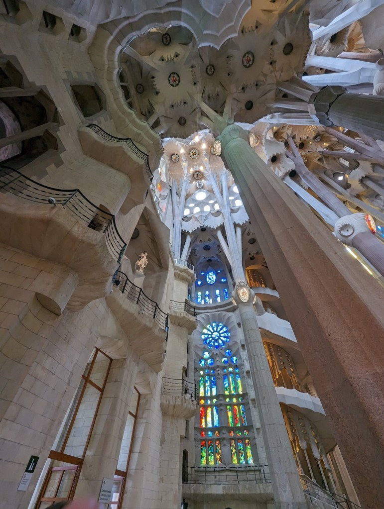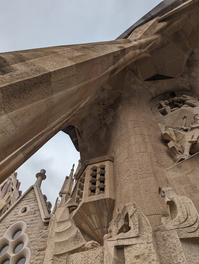 We headed off to Sagrada Familia. We were a bit short on time to get there, so we race walked thru the city. Amazing to see the temple as we approached. It was super crowded. Went thru security and then made it to the front. We started our audio tour. Love having someone give more information. The building is overwhelming. The Nativity entrance is so beautiful and multi-faceted. Flowers cover the doors. Scenes from Jesus’ early life. Animals, nature. The sculptures of people are based on real people that Gaudi used as models, people from his neighborhood. Each face looks real in the sense of truly human.
