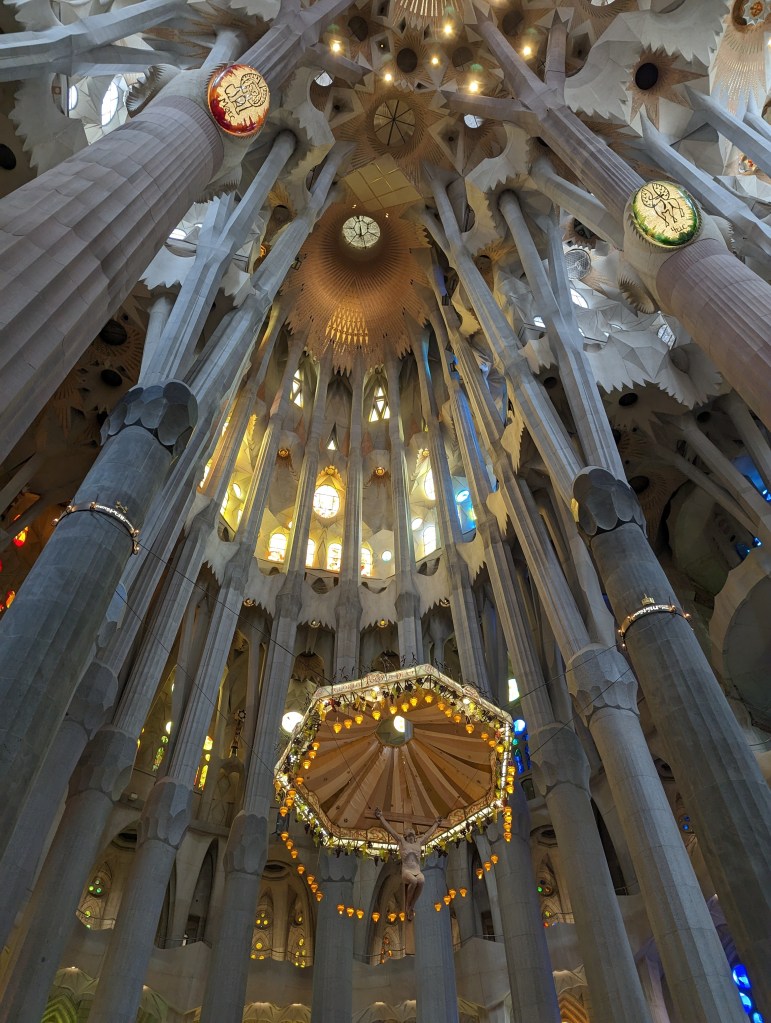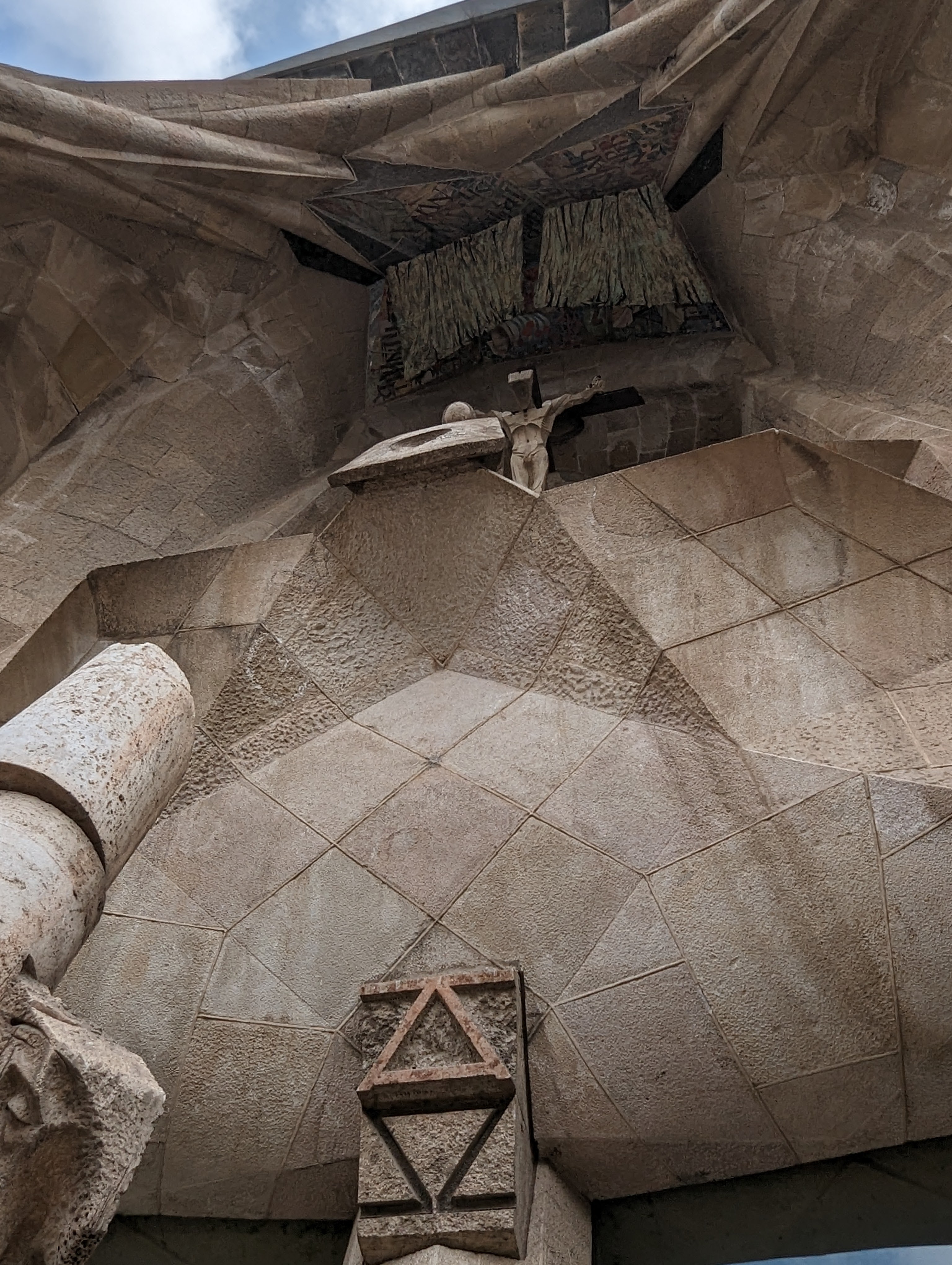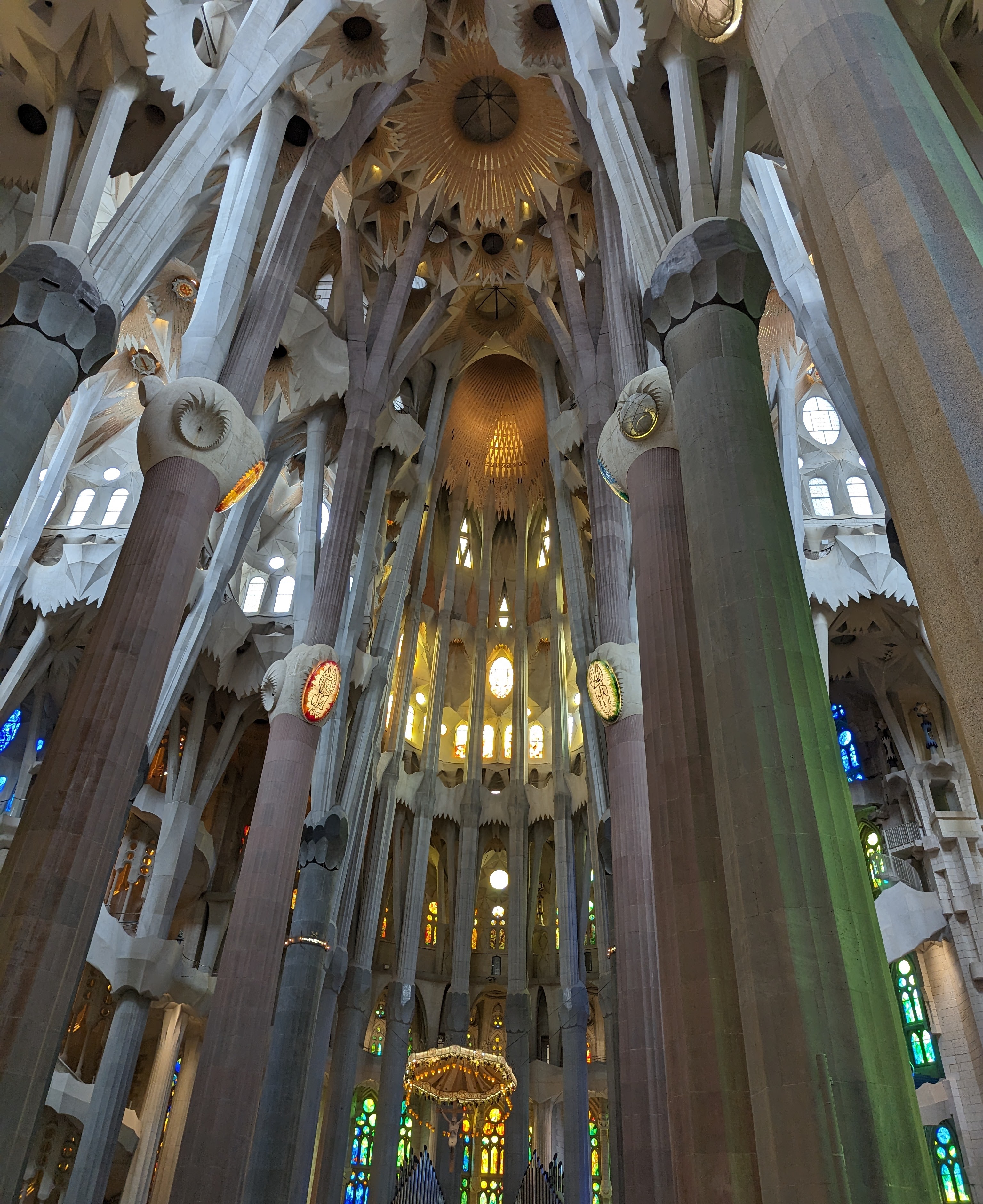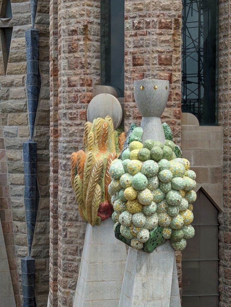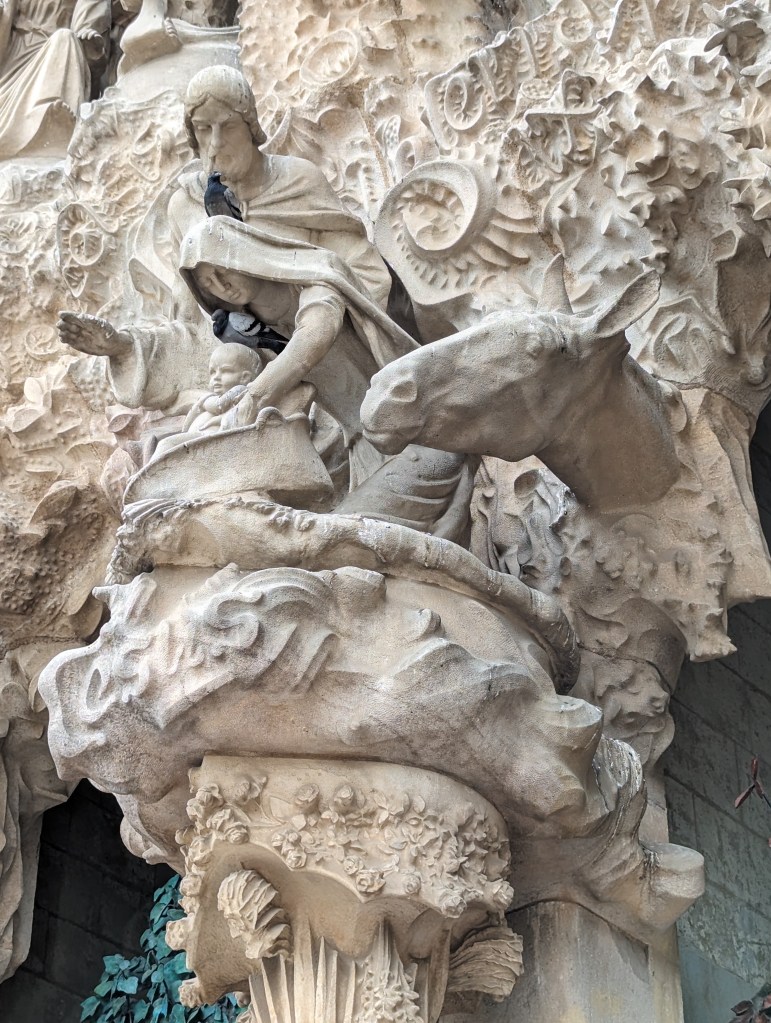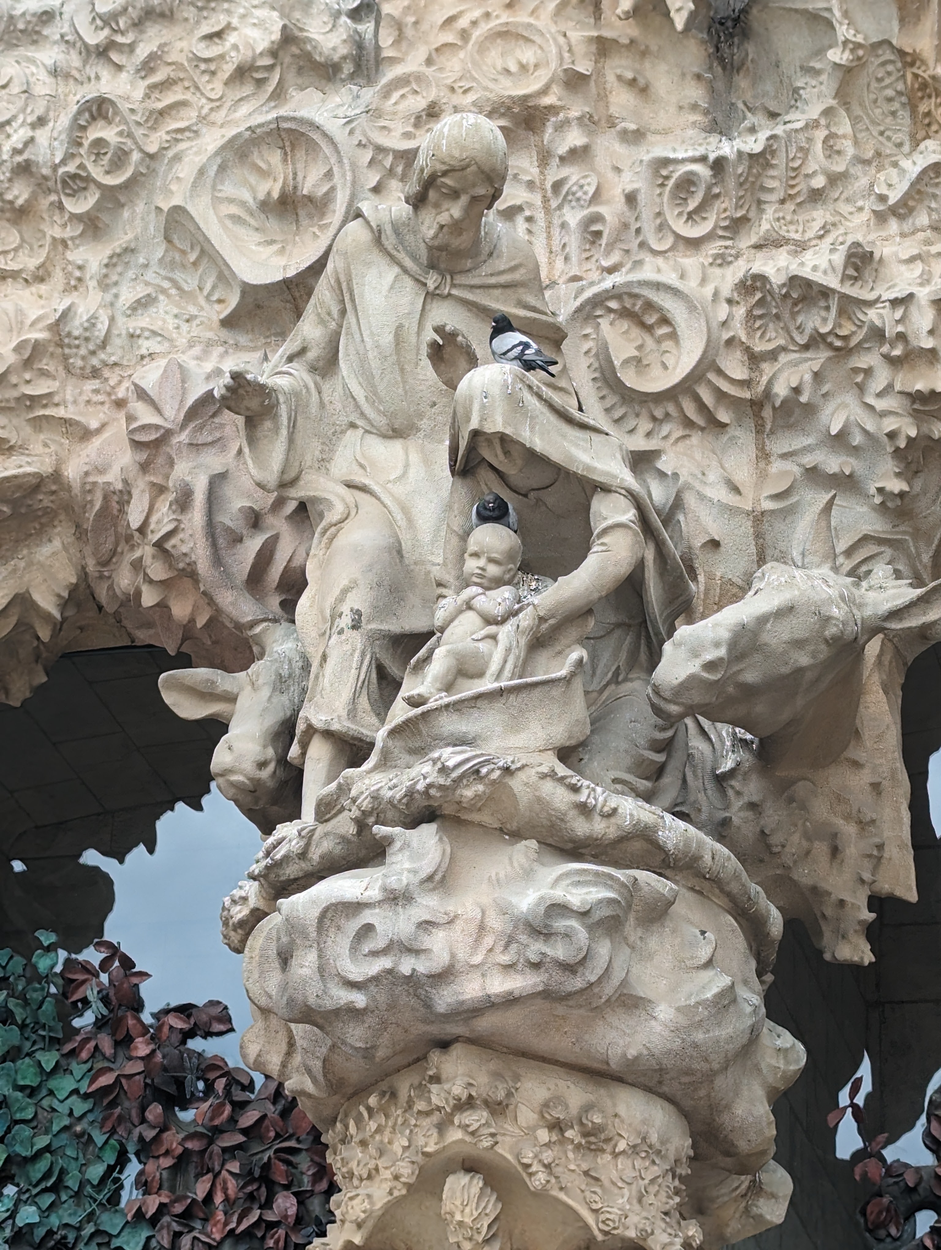We headed off to Sagrada Familia. We were a bit short on time to get there, so we race walked thru the city. Amazing to see the temple as we approached. It was super crowded. Went thru security and then made it to the front. We started our audio tour. Love having someone give more information. The building is overwhelming. The Nativity entrance is so beautiful and multi-faceted. Flowers cover the doors. Scenes from Jesus’ early life. Animals, nature. The sculptures of people are based on real people that Gaudi used as models, people from his neighborhood. Each face looks real in the sense of truly human.