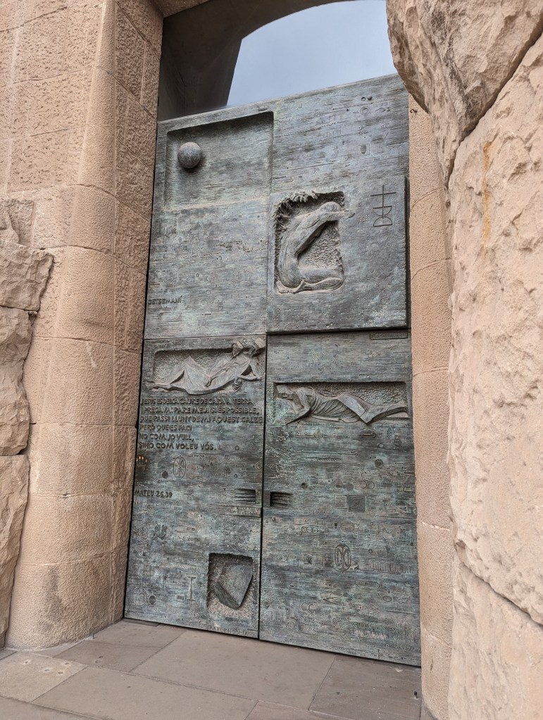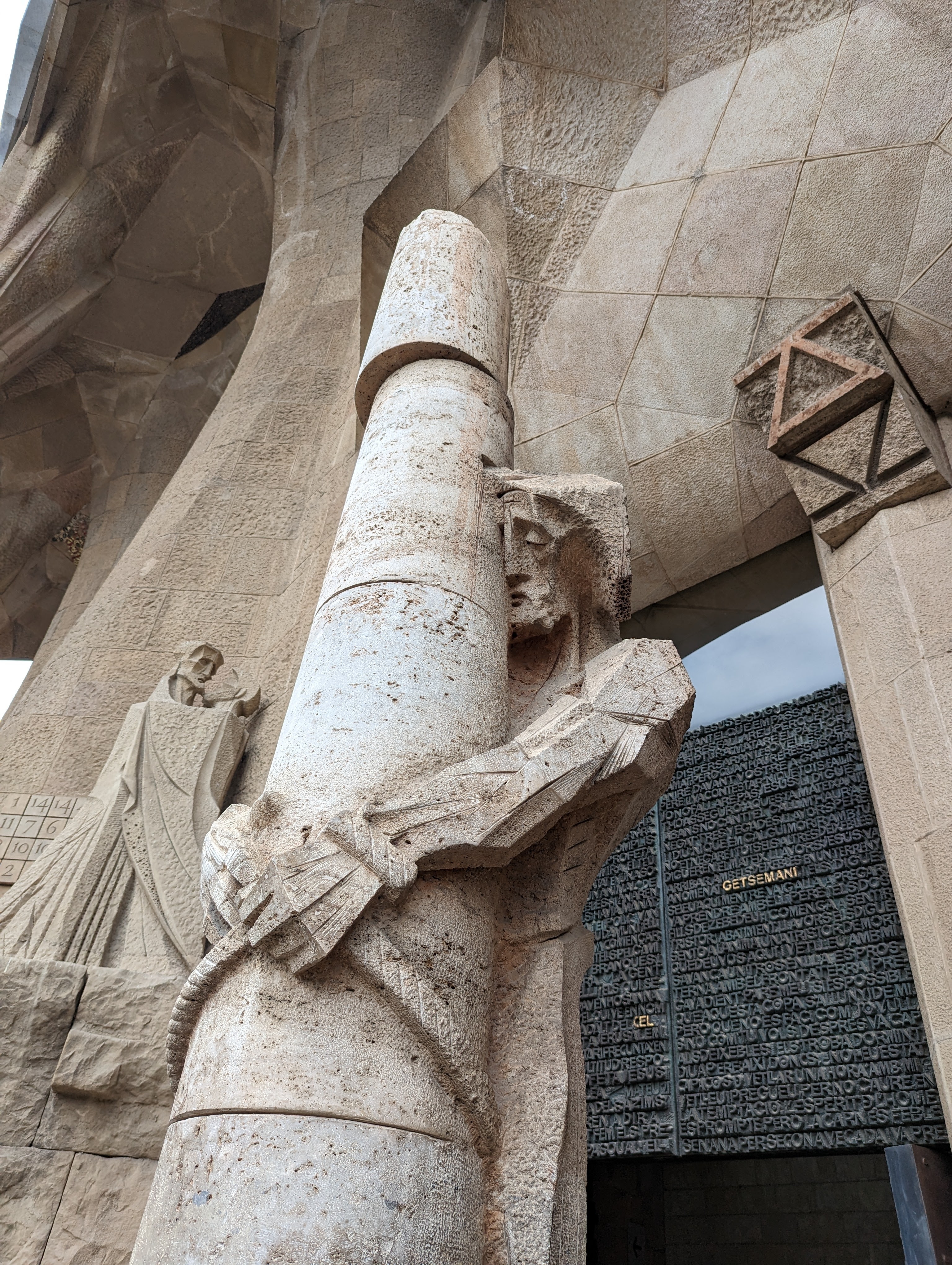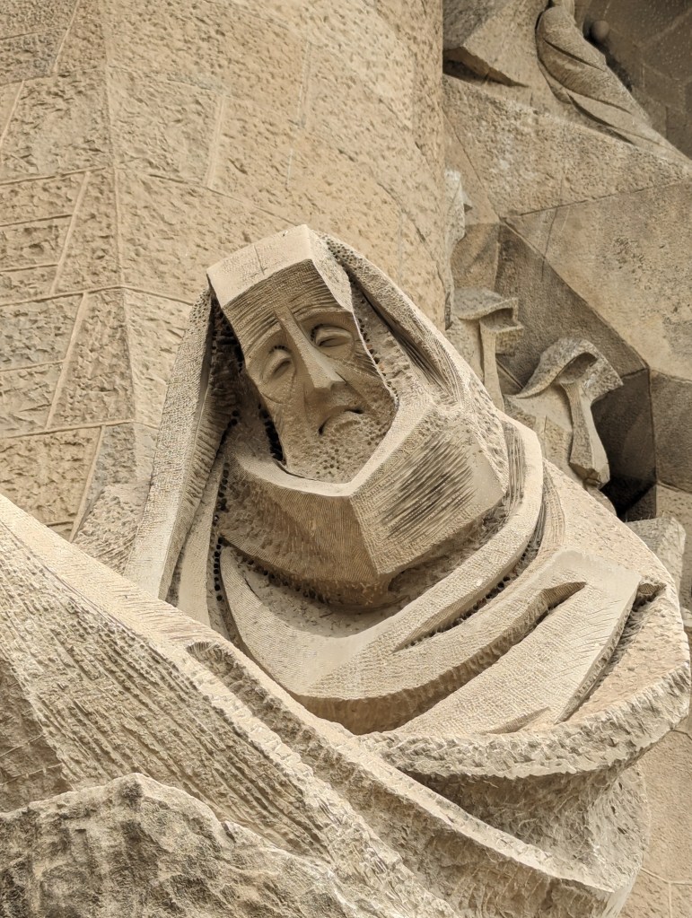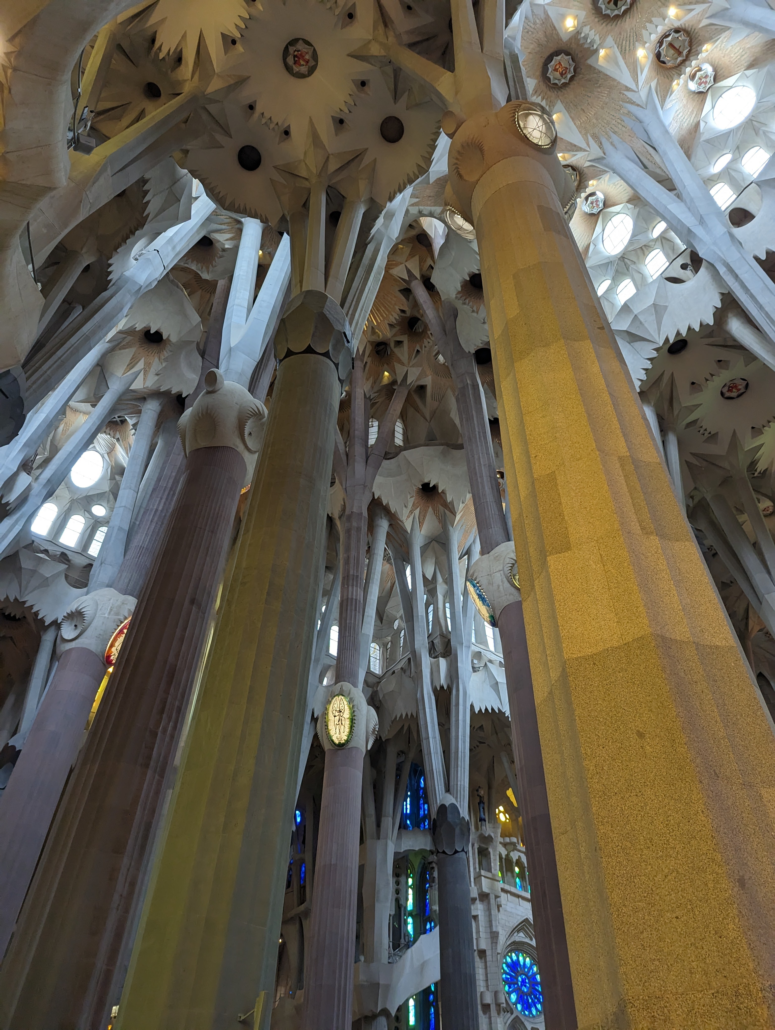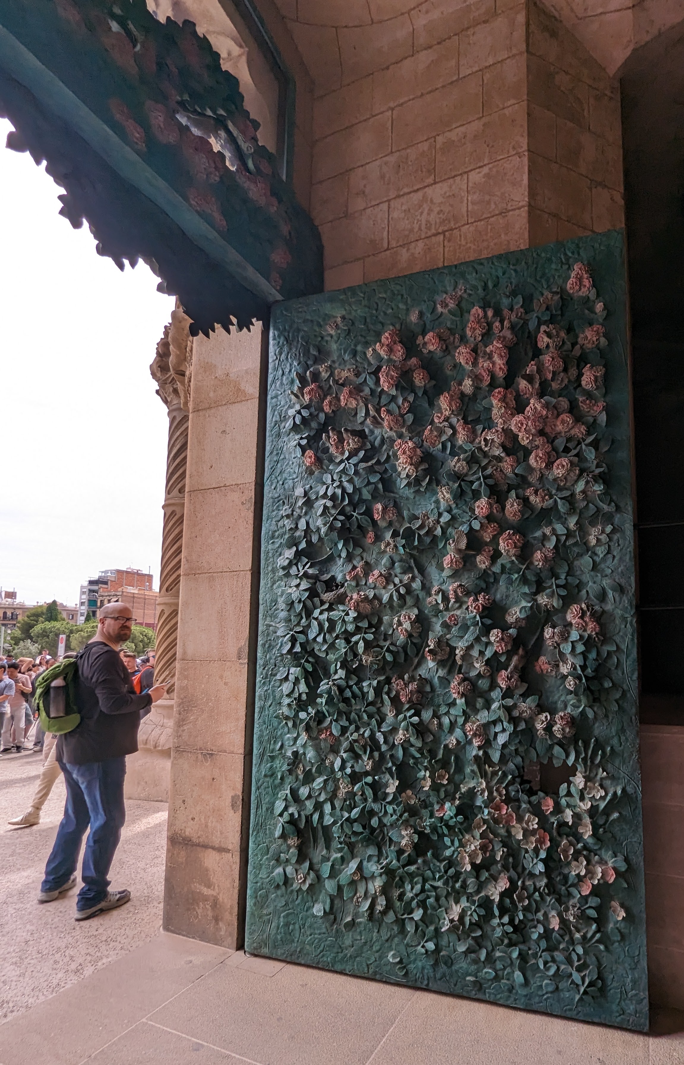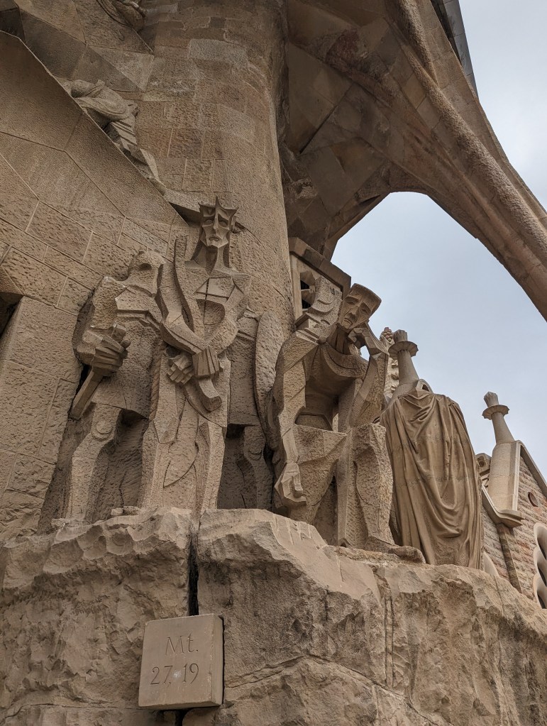 We headed off to Sagrada Familia. We were a bit short on time to get there, so we race walked thru the city. Amazing to see the temple as we approached. It was super crowded. Went thru security and then made it to the front. We started our audio tour. Love having someone give more information. The building is overwhelming. The Nativity entrance is so beautiful and multi-faceted. Flowers cover the doors. Scenes from Jesus’ early life. Animals, nature. The sculptures of people are based on real people that Gaudi used as models, people from his neighborhood. Each face looks real in the sense of truly human.