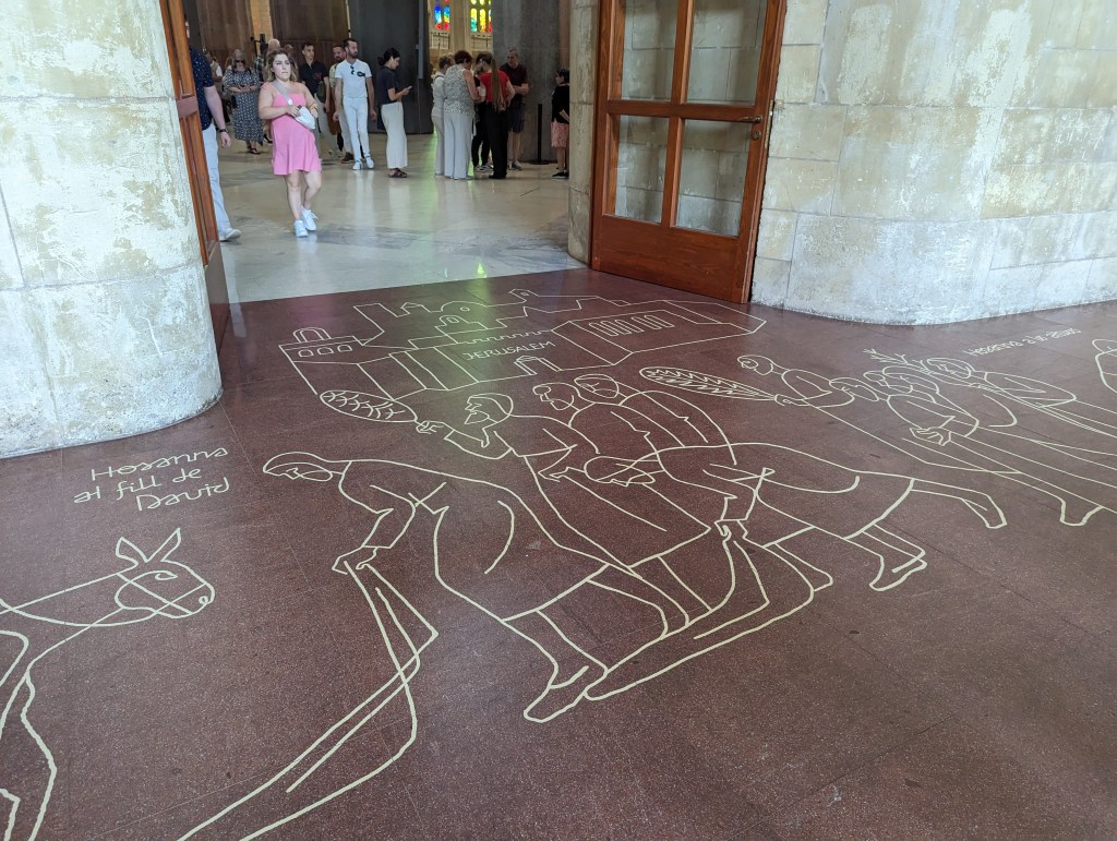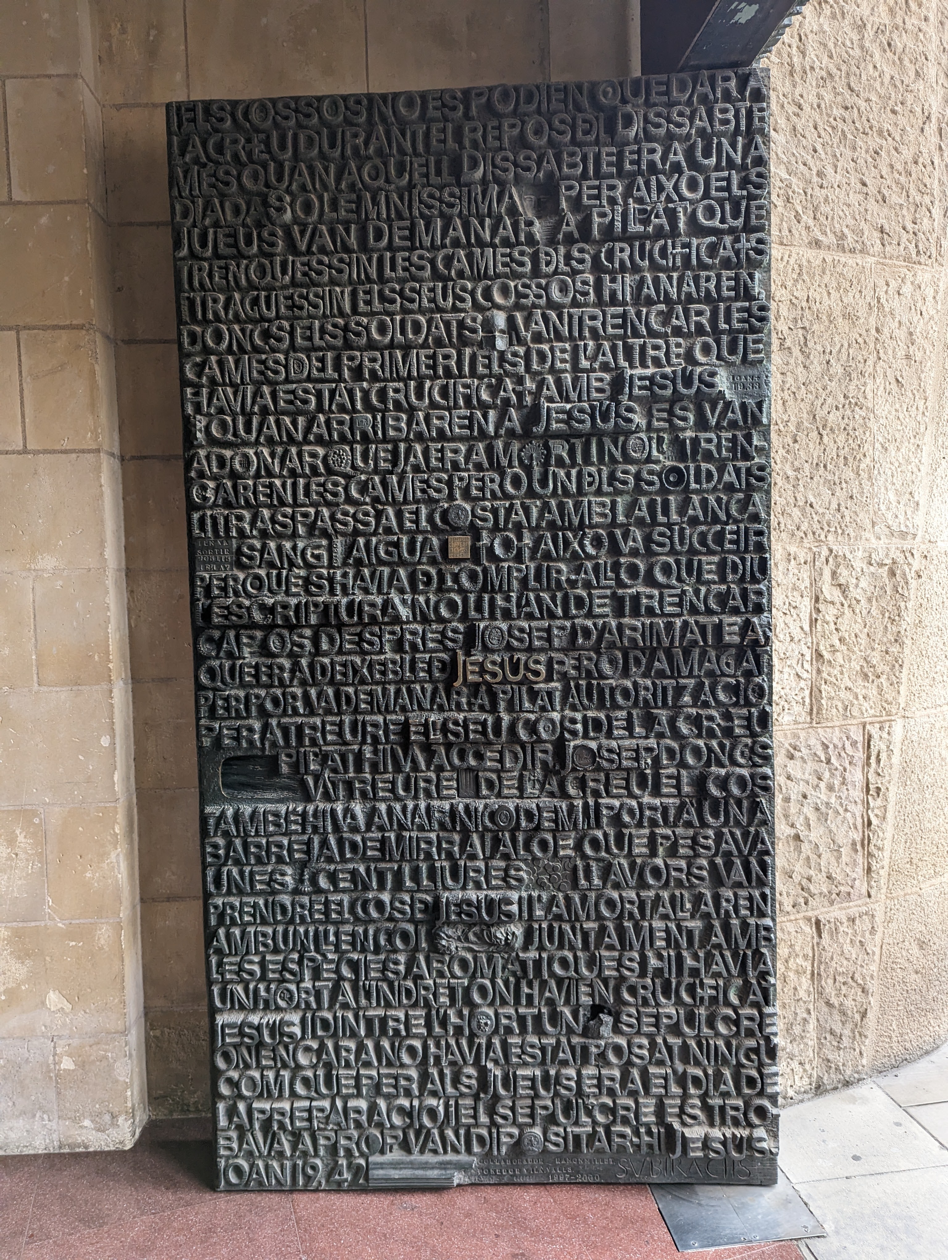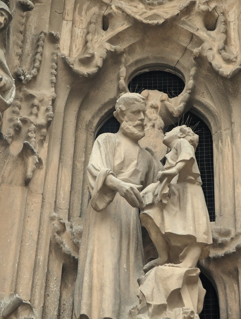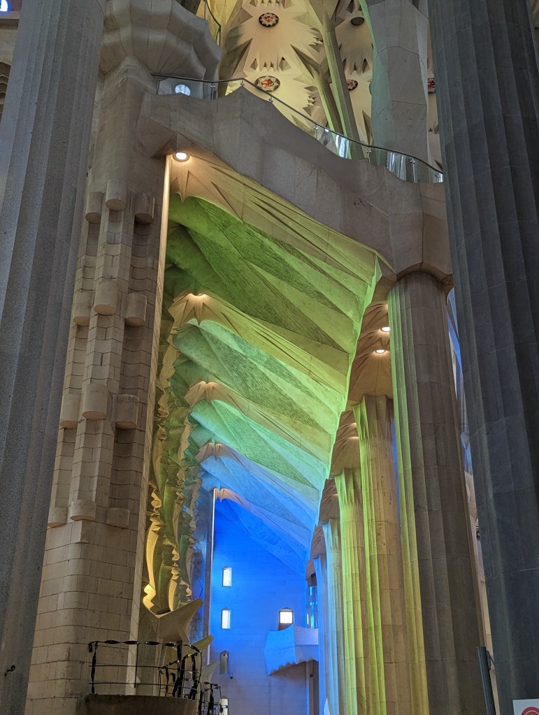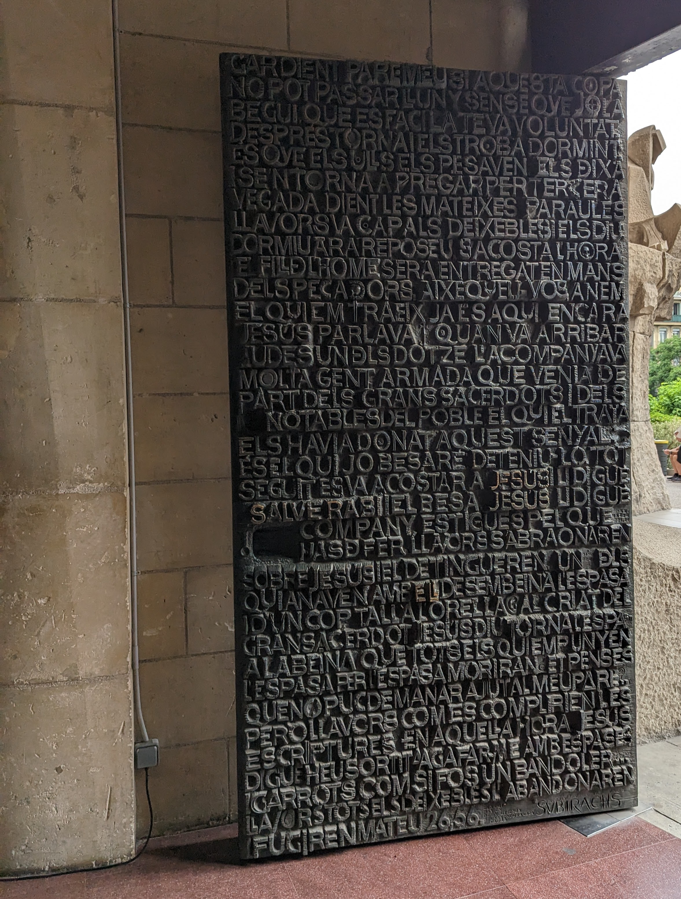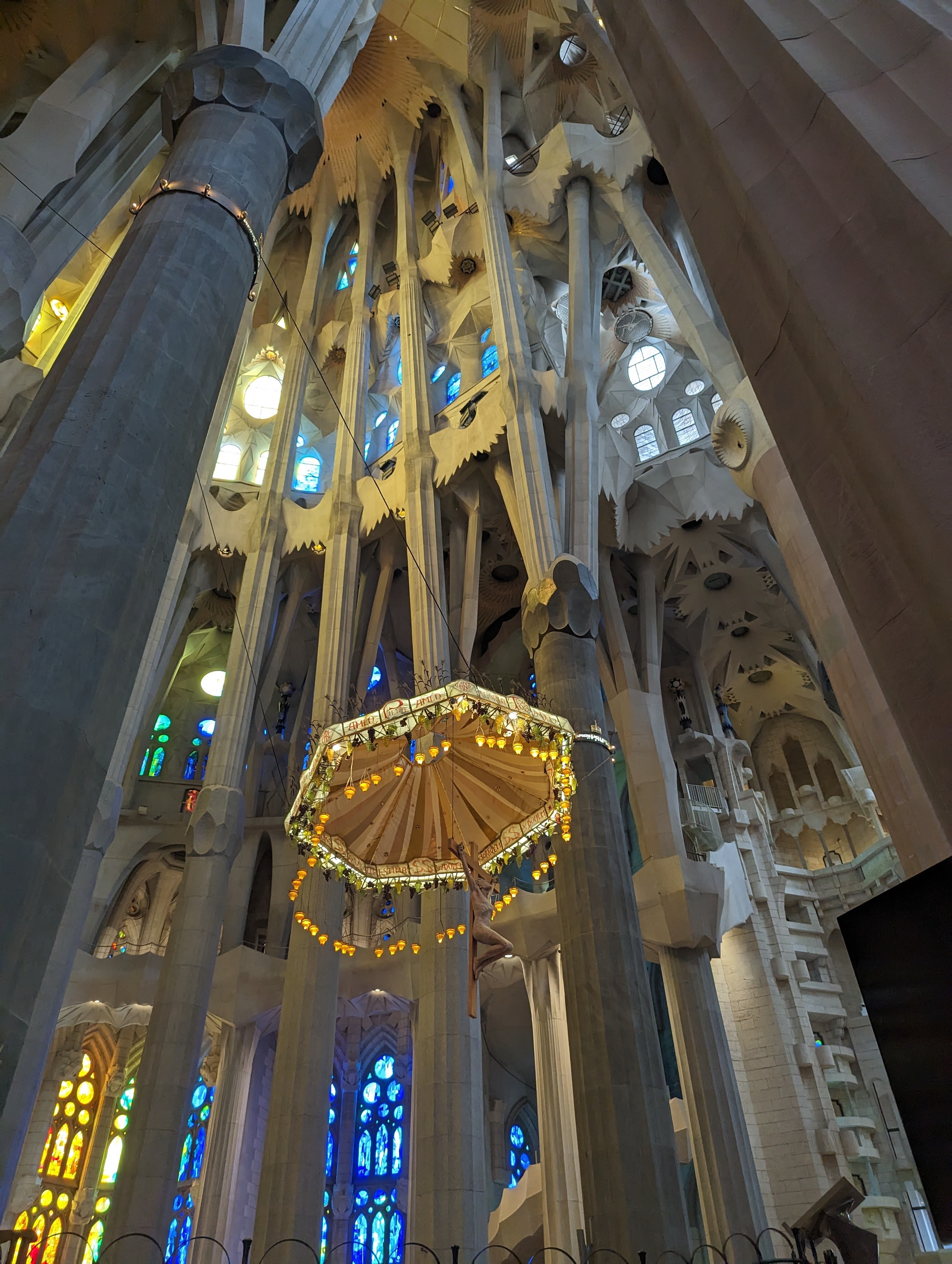 We headed off to Sagrada Familia. We were a bit short on time to get there, so we race walked thru the city. Amazing to see the temple as we approached. It was super crowded. Went thru security and then made it to the front. We started our audio tour. Love having someone give more information. The building is overwhelming. The Nativity entrance is so beautiful and multi-faceted. Flowers cover the doors. Scenes from Jesus’ early life. Animals, nature. The sculptures of people are based on real people that Gaudi used as models, people from his neighborhood. Each face looks real in the sense of truly human.