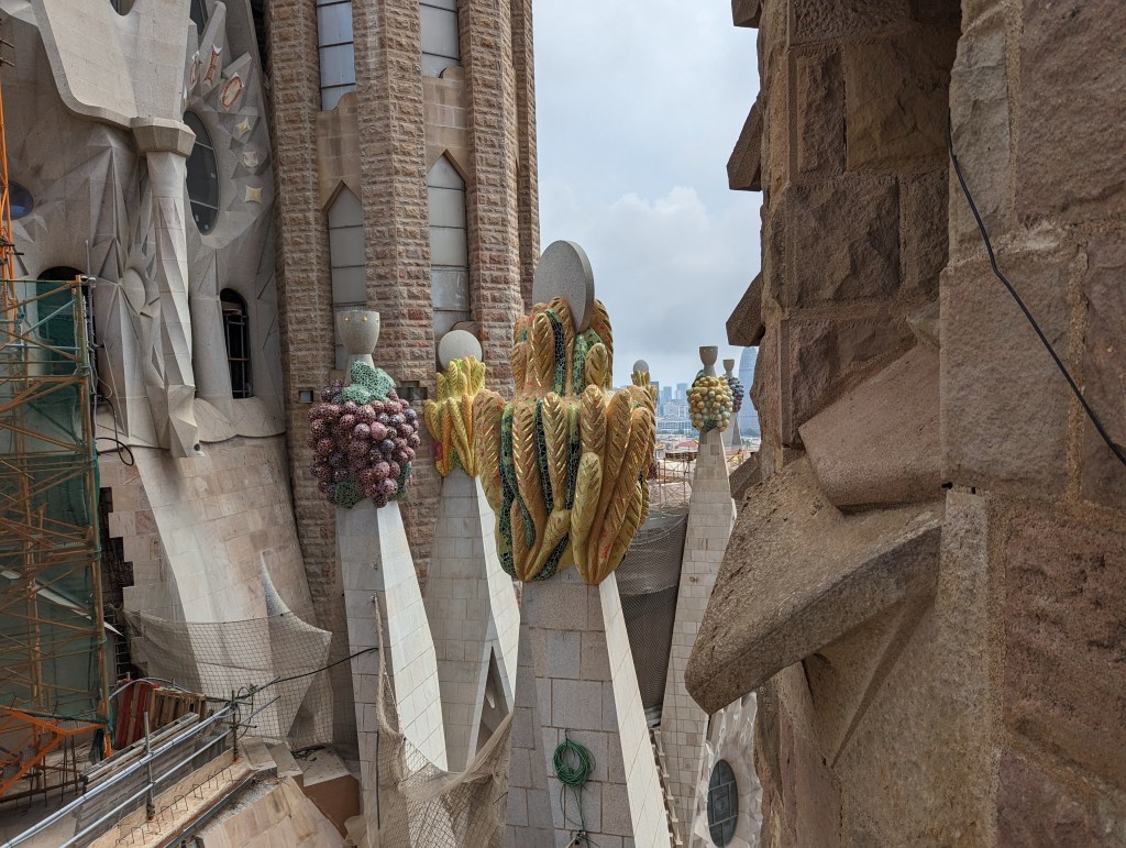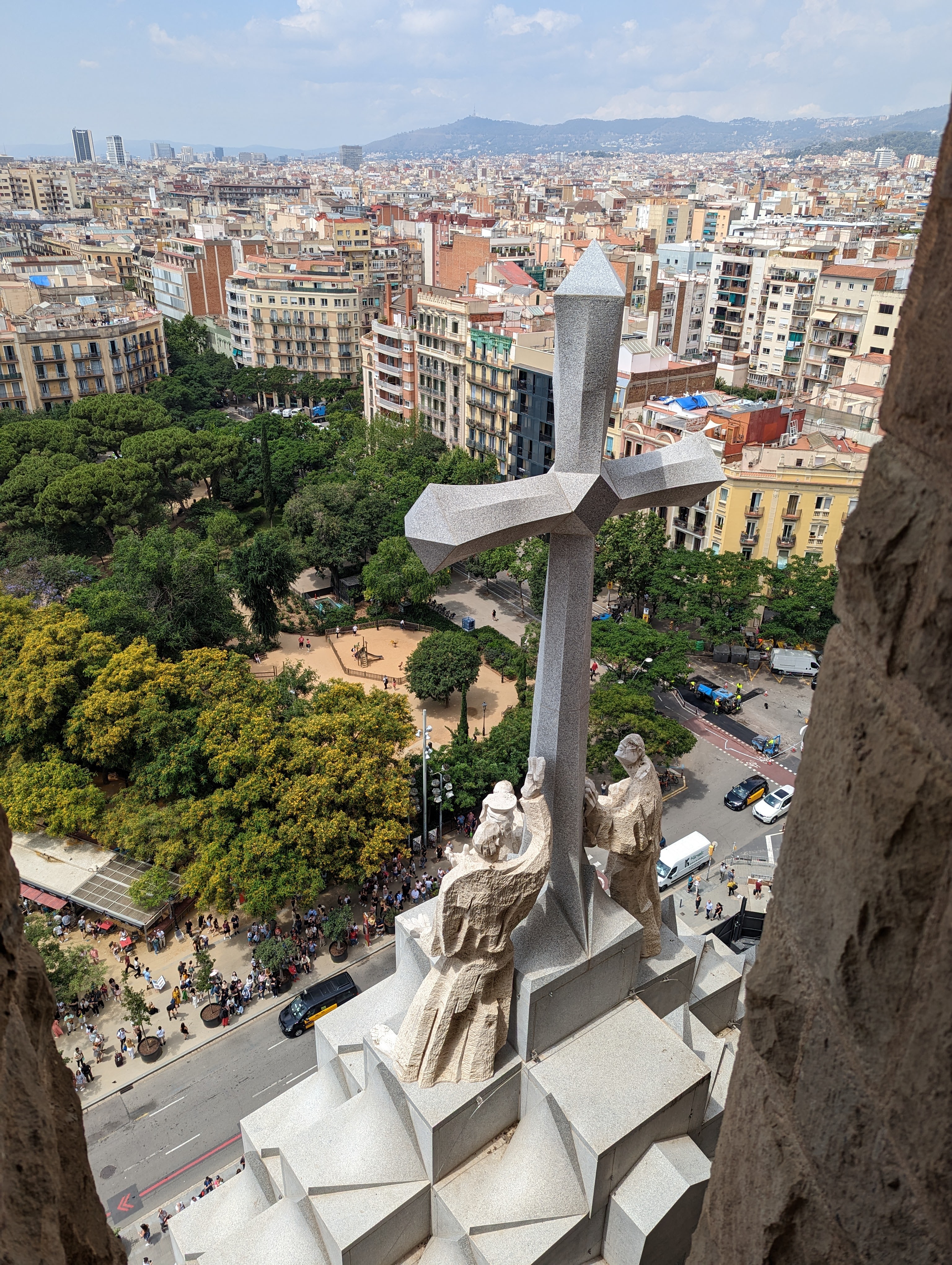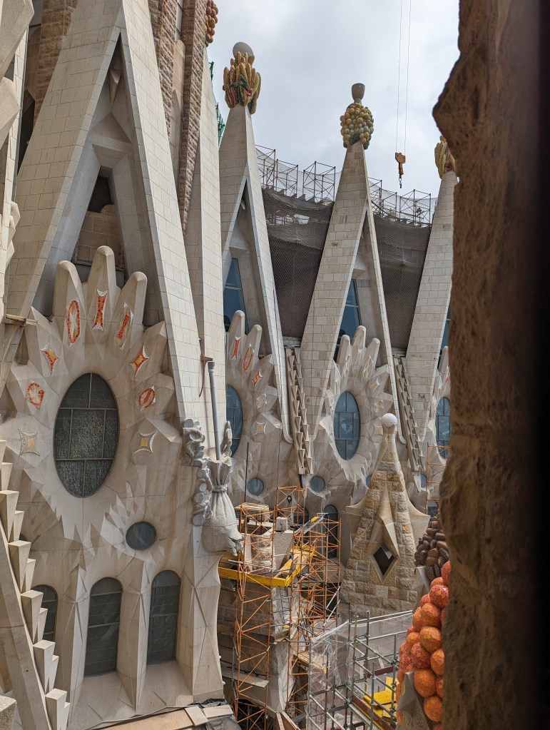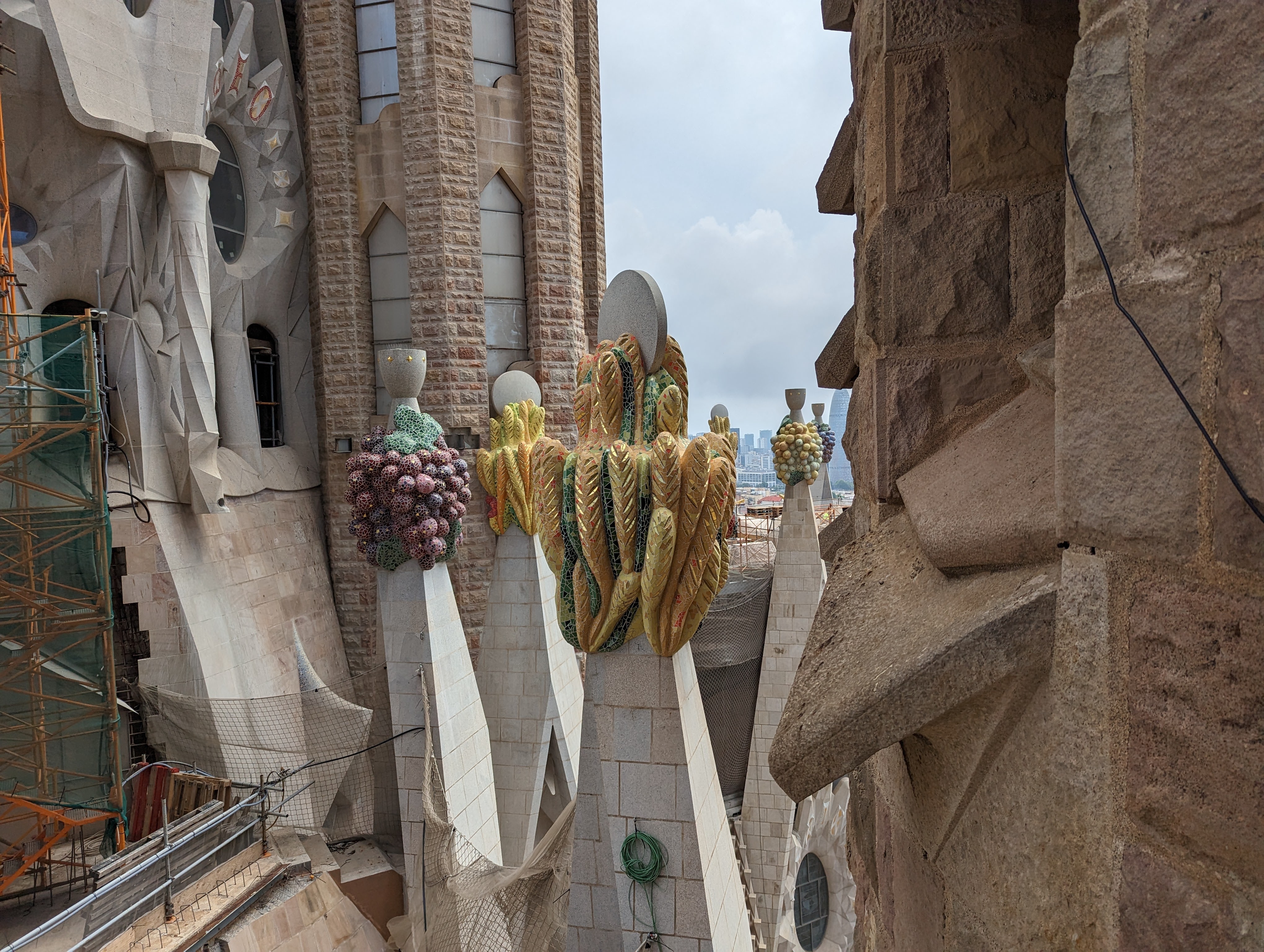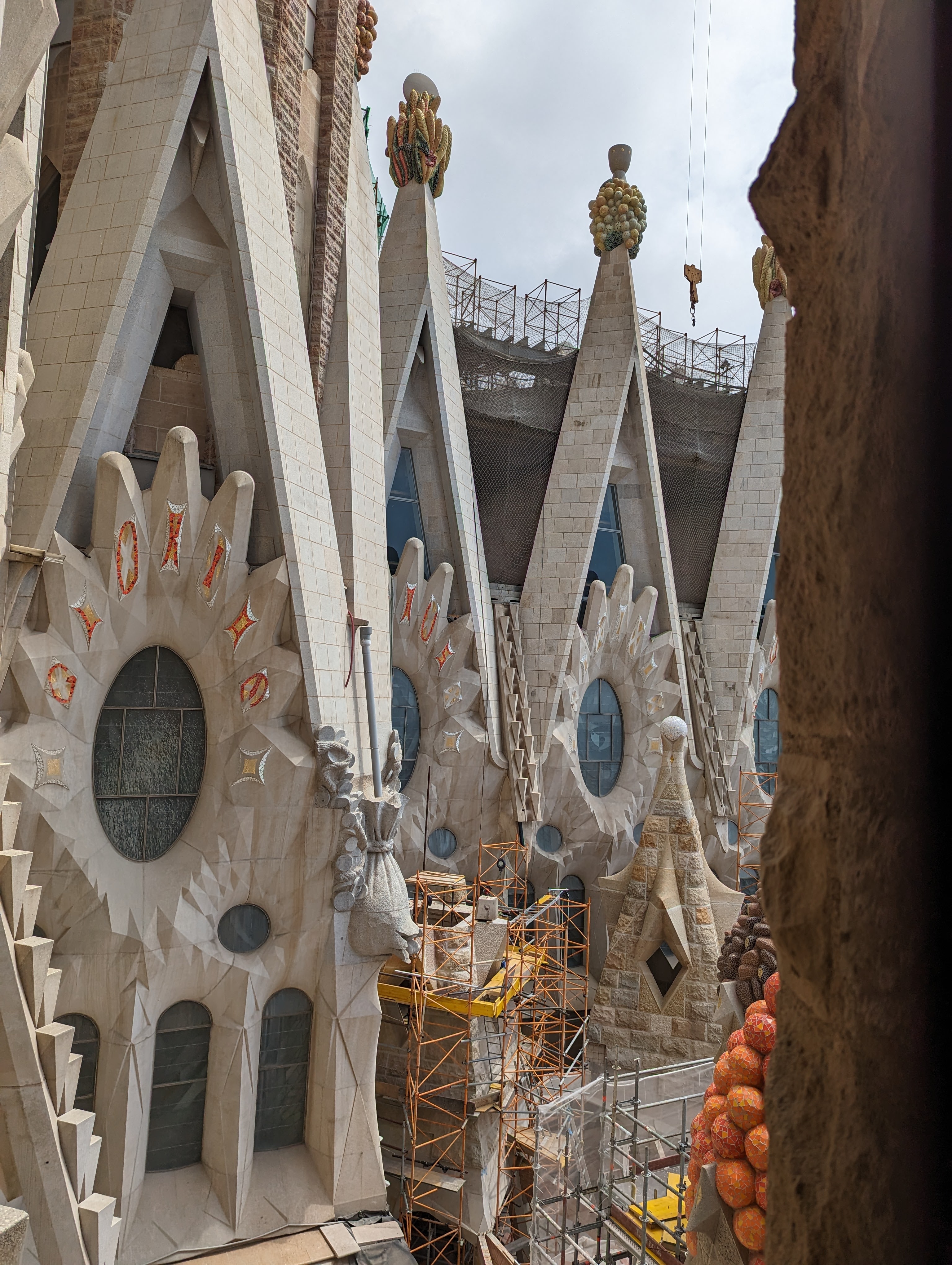 We took a break from our audio tour and got in line for going up the Passion Tower. We rode the elevator to the top (when Colin and I were here 25 years ago, we walked up). The views from the top were incredible, seeing the Towers up close, seeing the work still happening, seeing the City from above.