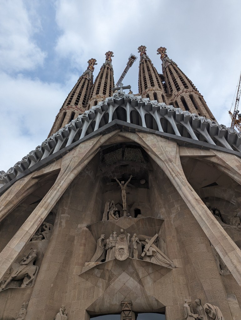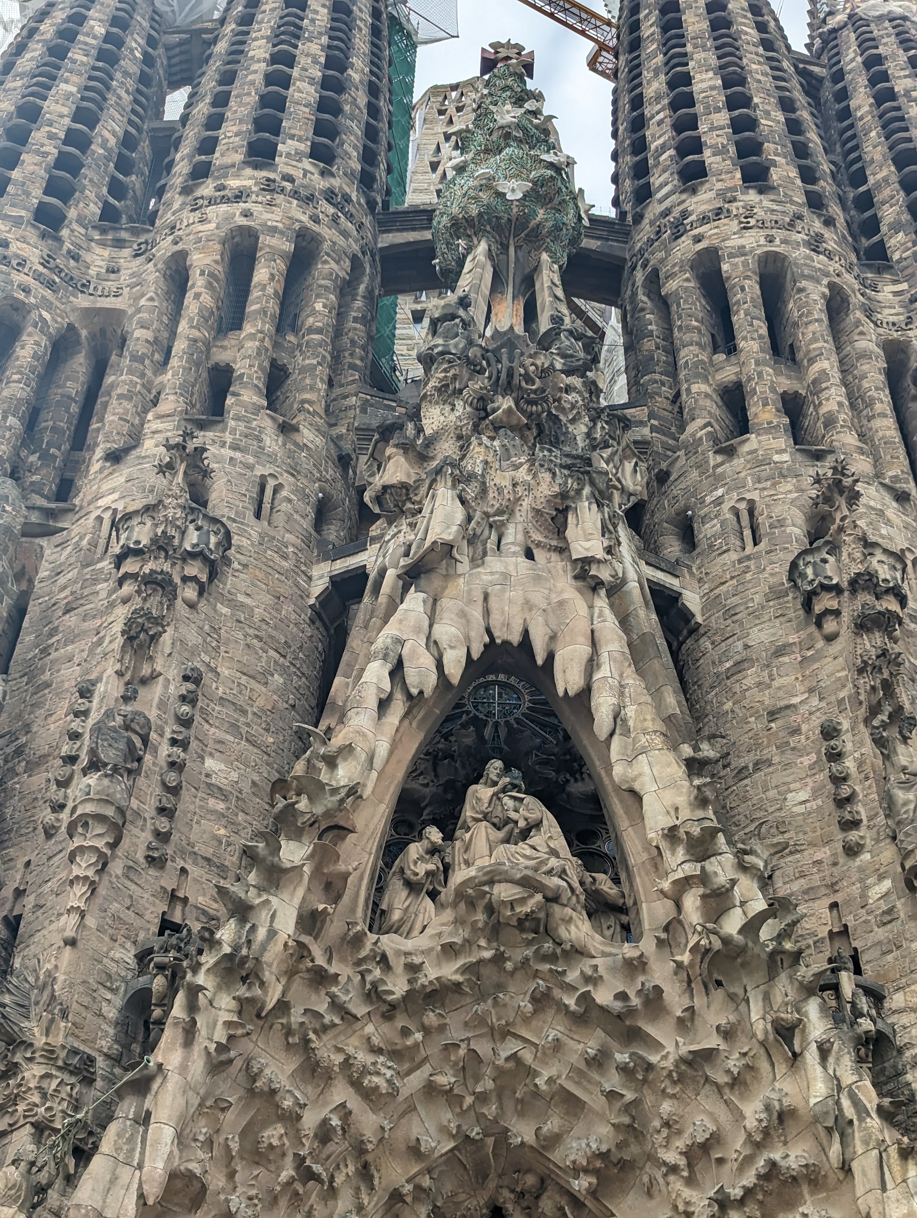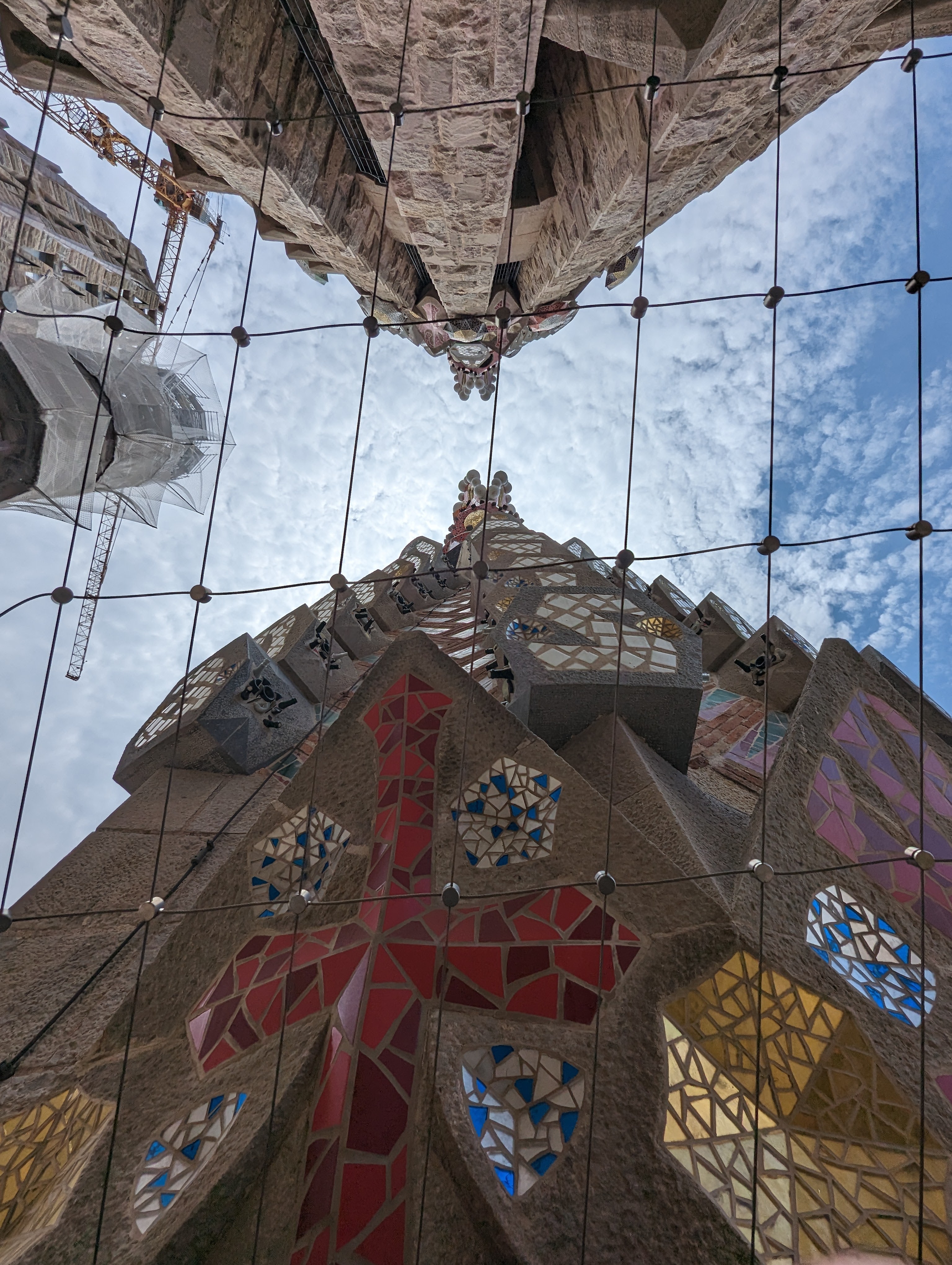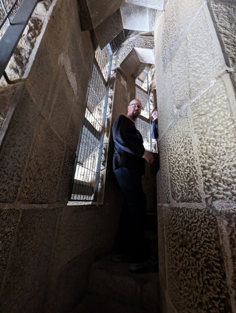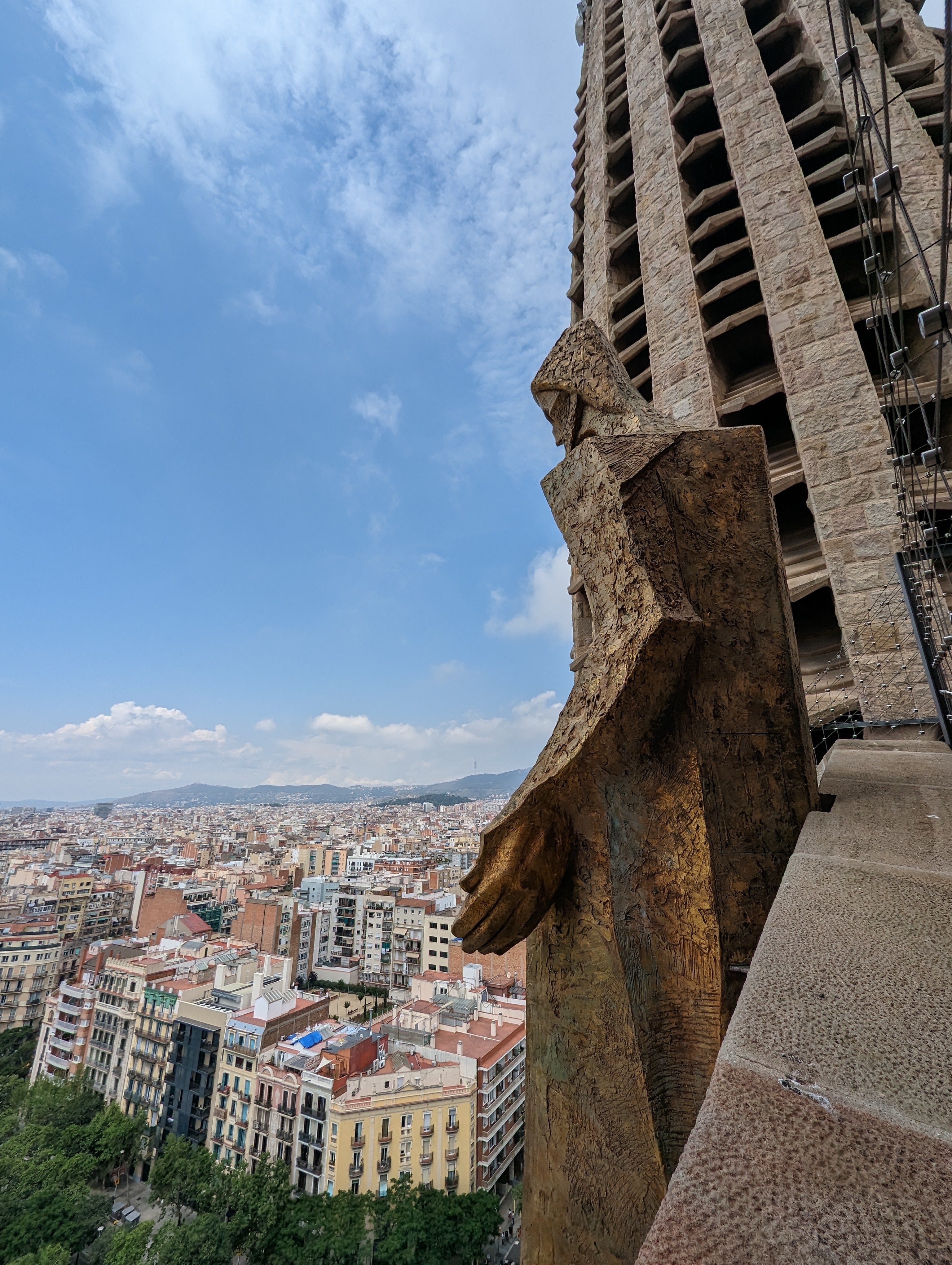 We took a break from our audio tour and got in line for going up the Passion Tower. We rode the elevator to the top (when Colin and I were here 25 years ago, we walked up). The views from the top were incredible, seeing the Towers up close, seeing the work still happening, seeing the City from above.