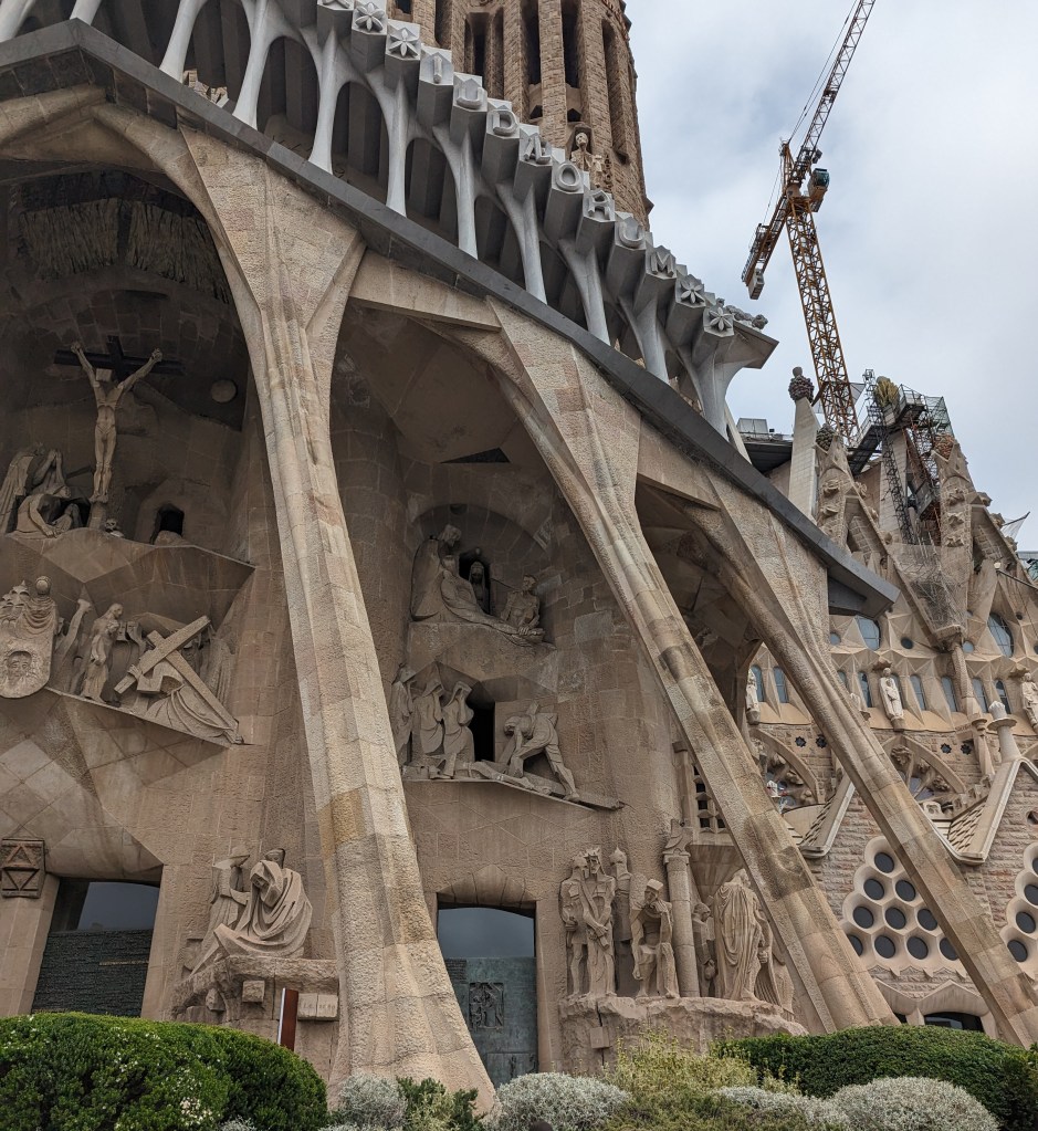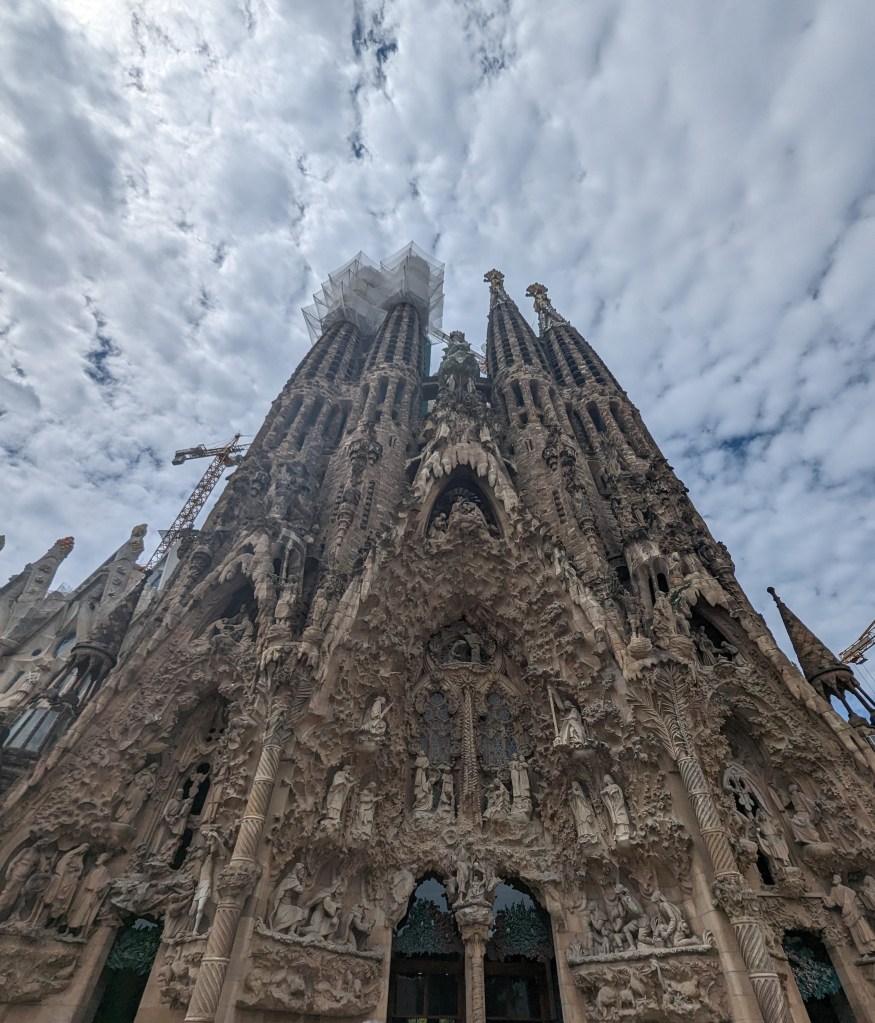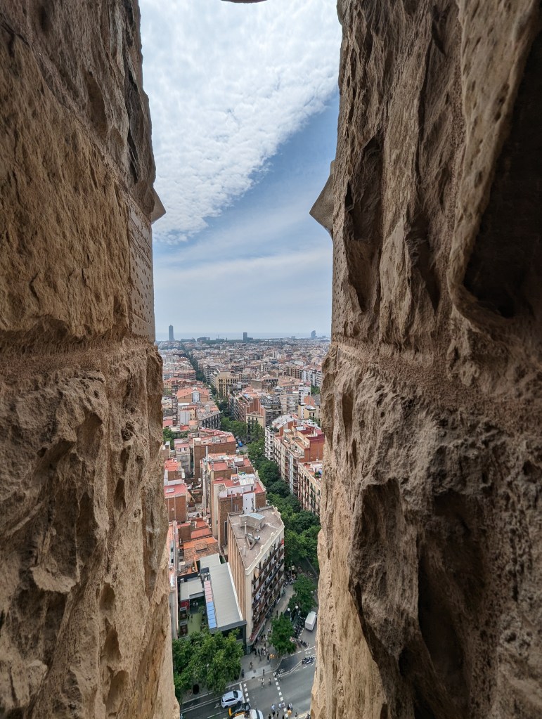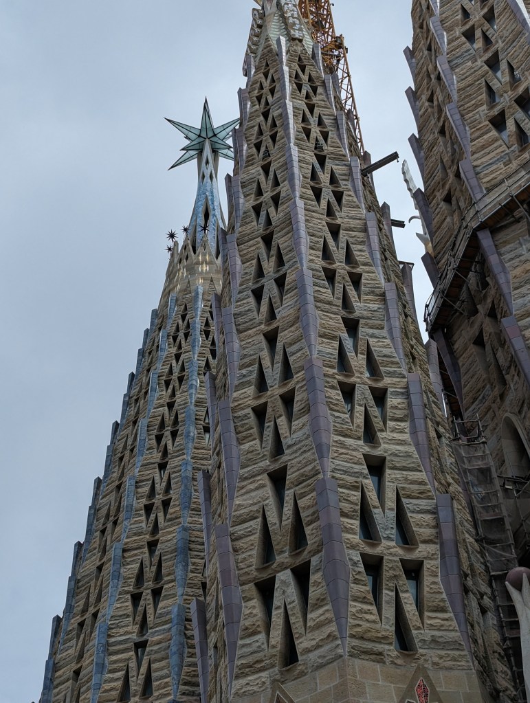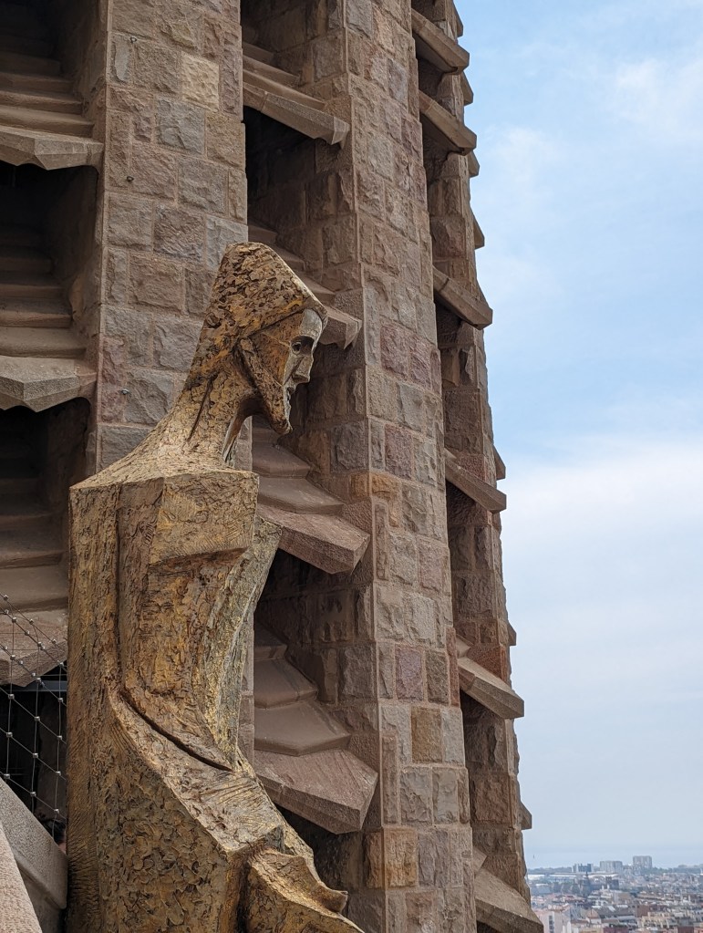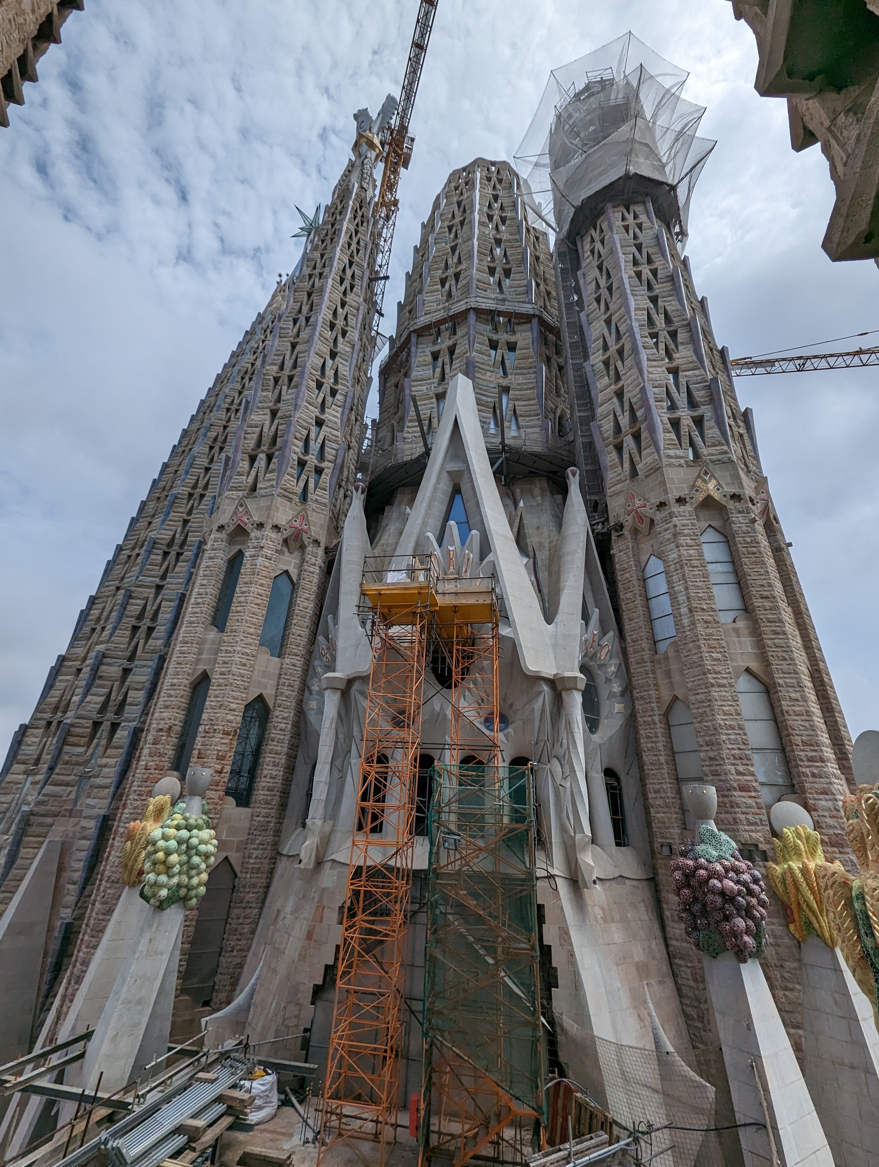 We took a break from our audio tour and got in line for going up the Passion Tower. We rode the elevator to the top (when Colin and I were here 25 years ago, we walked up). The views from the top were incredible, seeing the Towers up close, seeing the work still happening, seeing the City from above.