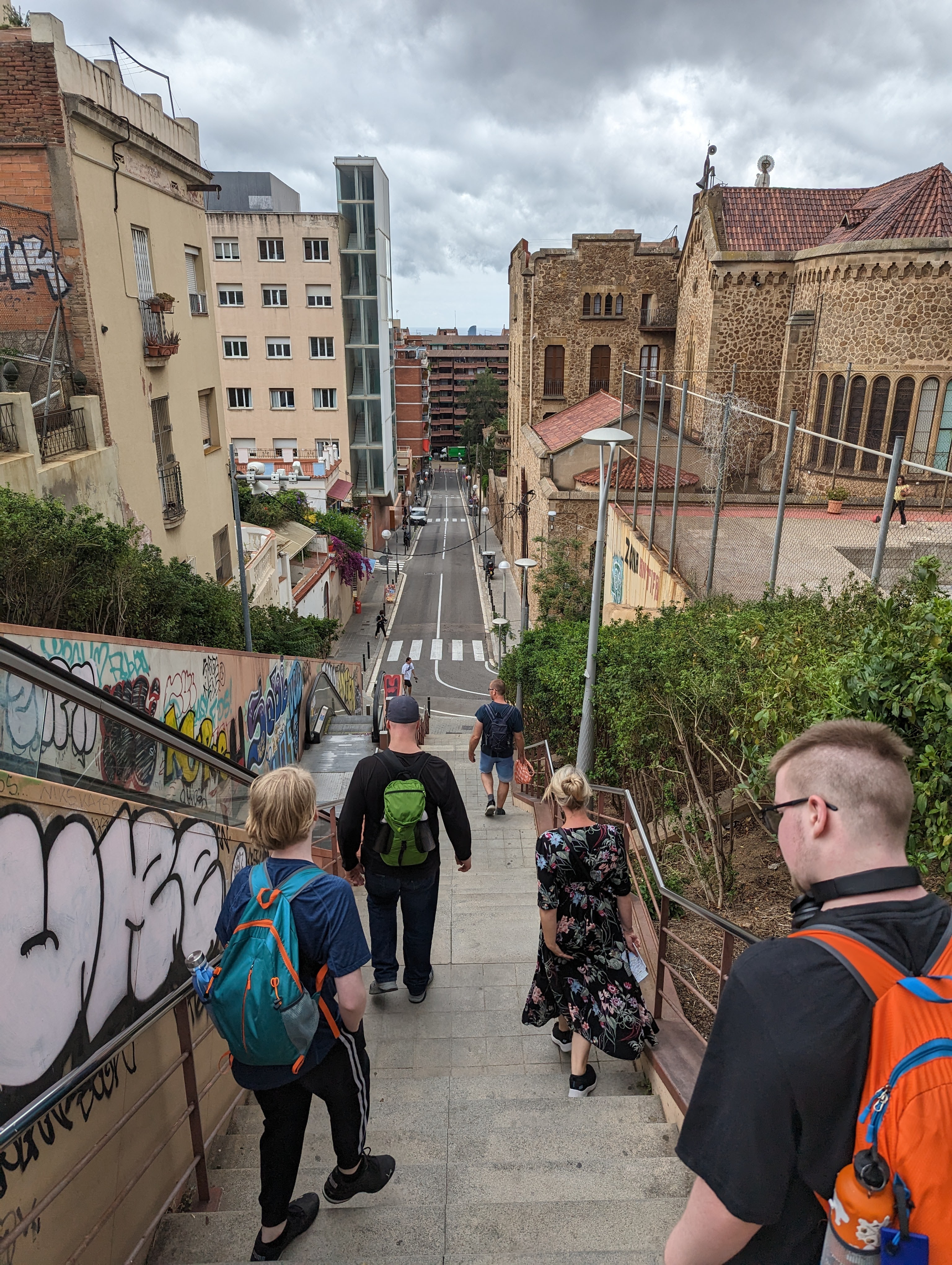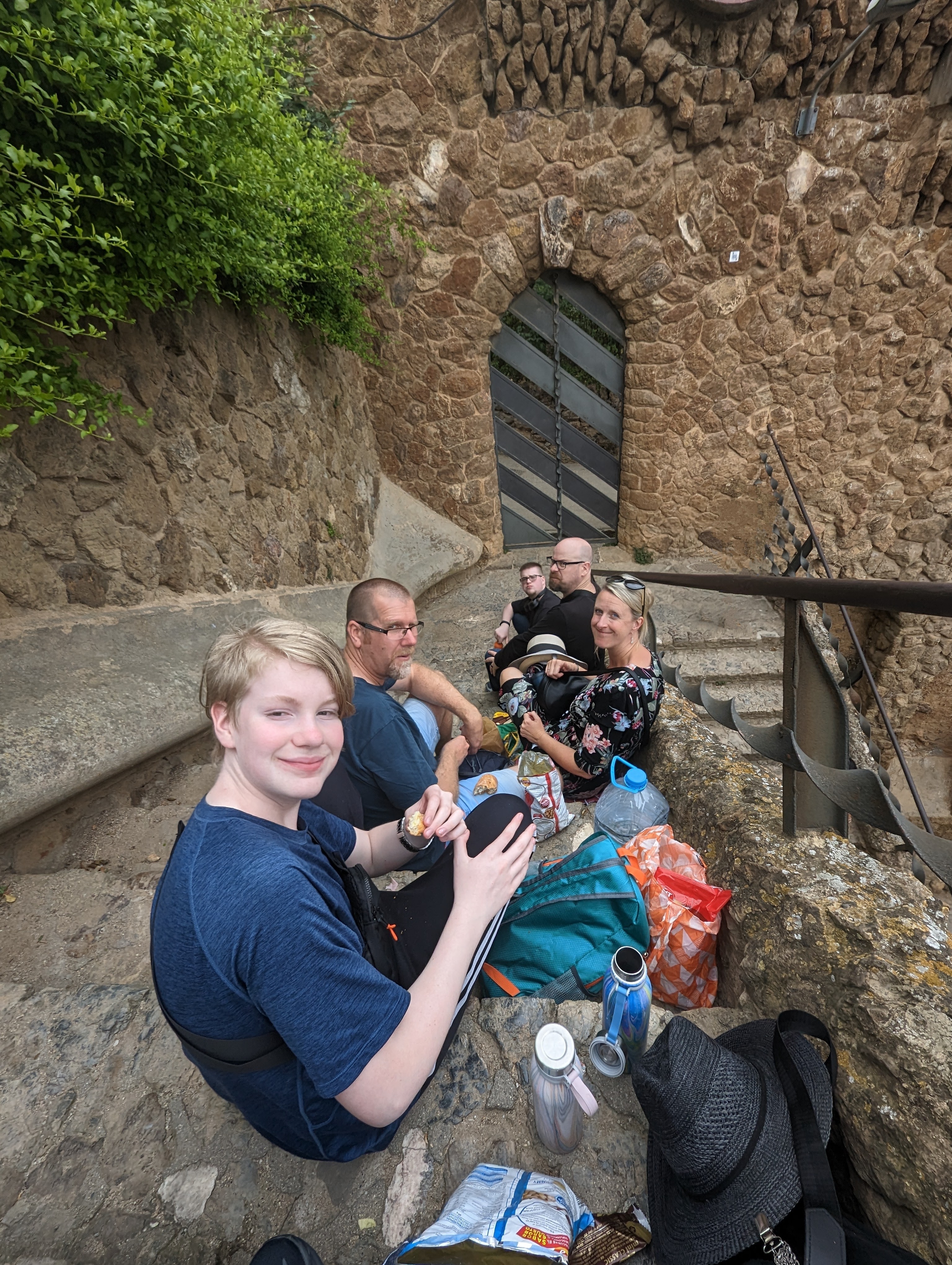We decided to head to Park Guell. We wanted to find a supermarket to get stuff for a picnic at the park. We saw that there were several “super mercados” along the way. Turns out that super mercado can mean a corner shop, not necessarily a full grocery store. The park is at the top of a hill so we did a lot of climbing – we were all tired and hot. The Sagrada Familia was spiritually, emotionally, mentally, and physically rich. I was so thirsty. We found a few things in a shop and finally made it to the Park only to find out that they were sold out of tickets. So we found some stairs to sit on right outside of the park and proceeded with our picnic. We were pretty bummed, but I think it was a blessing in disguise as we were all so worn out, the Park would have been too much to take in and appreciate.