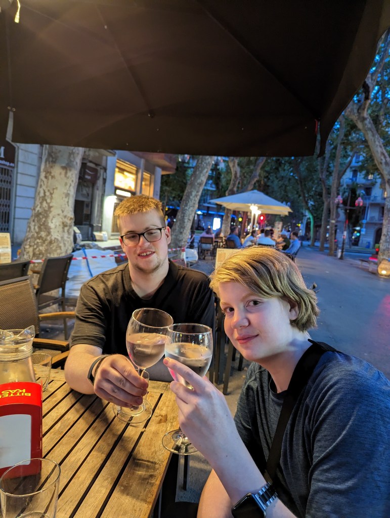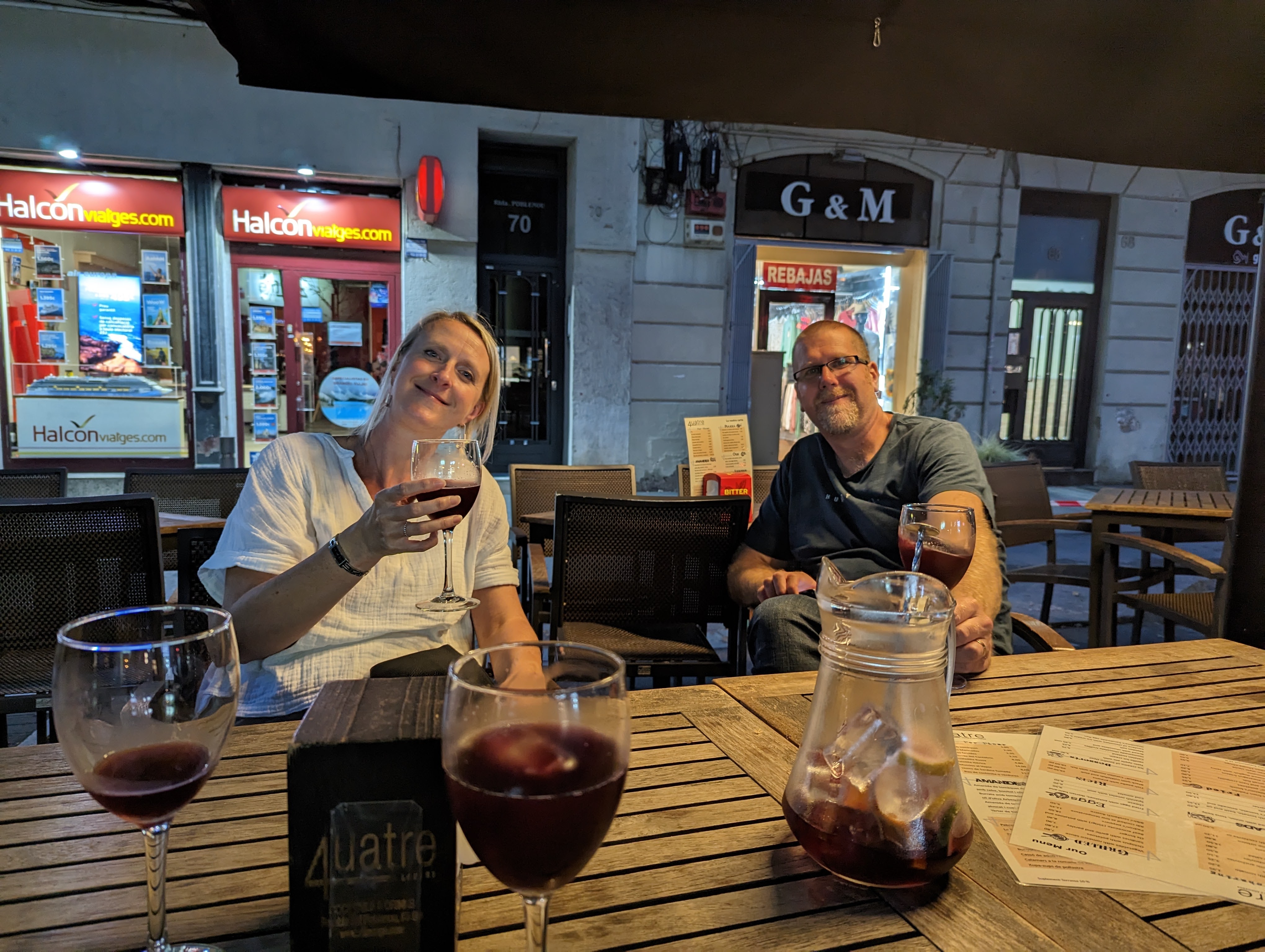 We headed back to our hotel and took some time to rest in our rooms before meeting up again. We rambled around a bit. We ended up at a Westfield Shopping Mall, as you do. We had a lovely and unusual dinner of sandwiches and pastries from a shop using an app that Graeme has called Too Good To Go which lets shops and restaurants offer surprise bags of food that would normally be thrown out. For 6 euros we got at least 6 yummy sandwiches to share. We also got a slice of pizza, some gourmet cookies and, of course, empanadas. Then we found a bar with outside seating to sit and drink some Sangria. Lots of laughter and chatting, sharing memories, deep conversations.