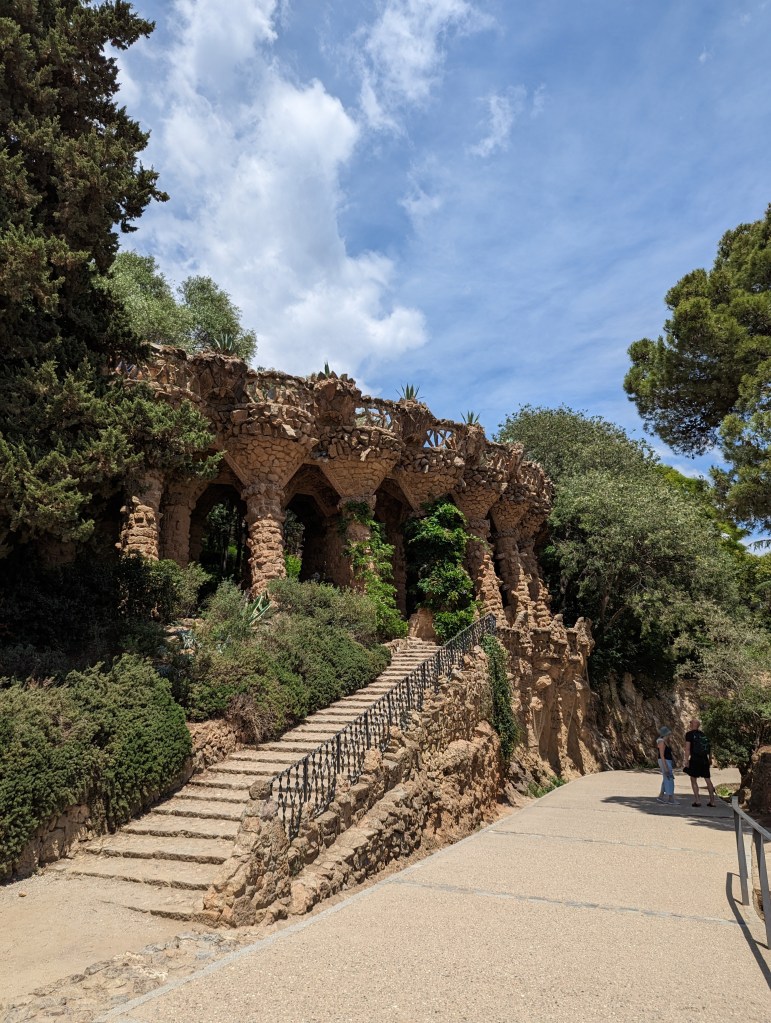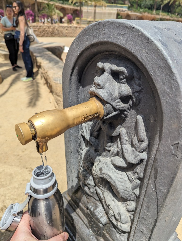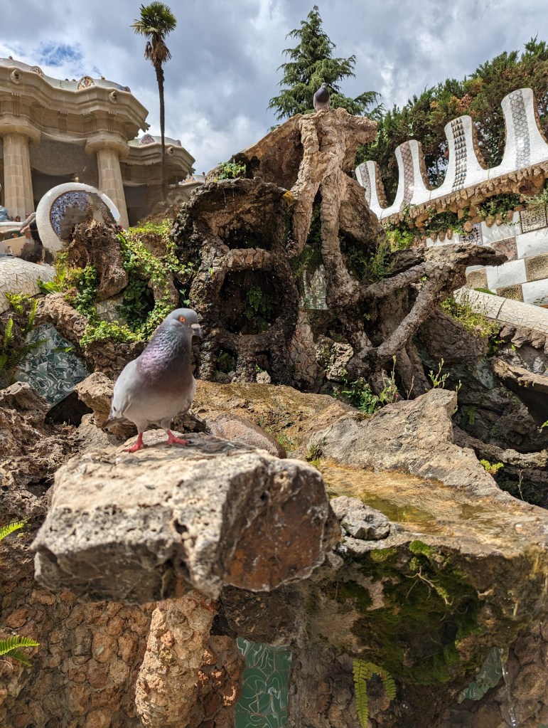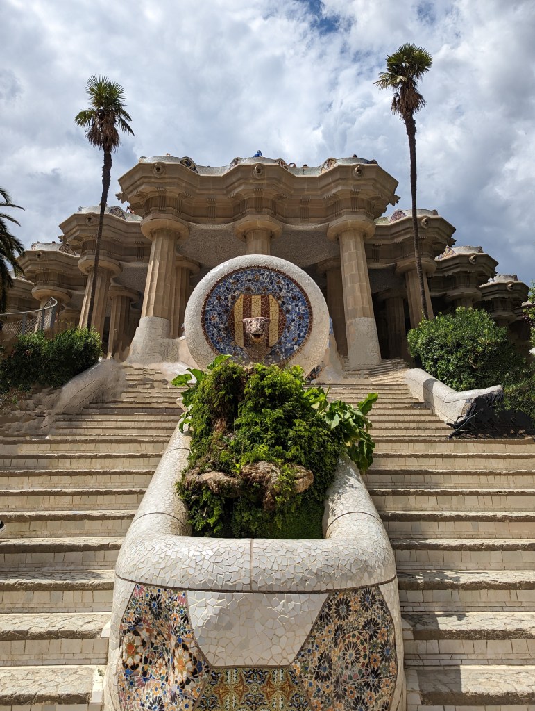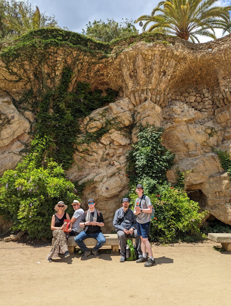 Went back and finished packing. G&B accidentally booked their room for an extra night so we left all our things in their room. We headed back to Park Guell which we bought tickets for this time. When we came off the mountain yesterday, we found a way that had escalators going up, so we were hoping to find those, but ended up hiking up the hill again through the neighborhoods, and seemingly endless staircases. So hot and sweaty when we finally made it. The Park is beautiful – amazing views of the City. Flora and Fauna. Gaudi’s hand can be seen throughout. Found a water source and we all got a bit wet, drank a lot, refilled our bottles, and had a tiny water fight. We saw a lot of parakeets and their nests in the palms. The flowers were so bright and beautiful. Gaudi’s mosaics, rolling benches, colonnades, pillars, fountains, buildings.