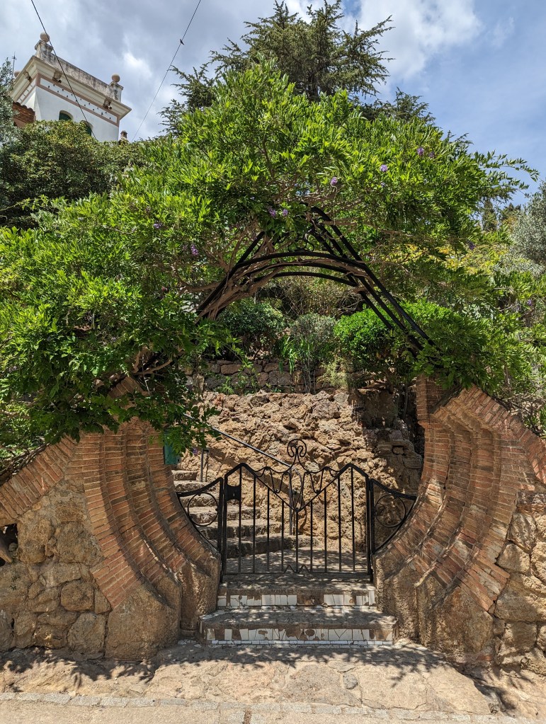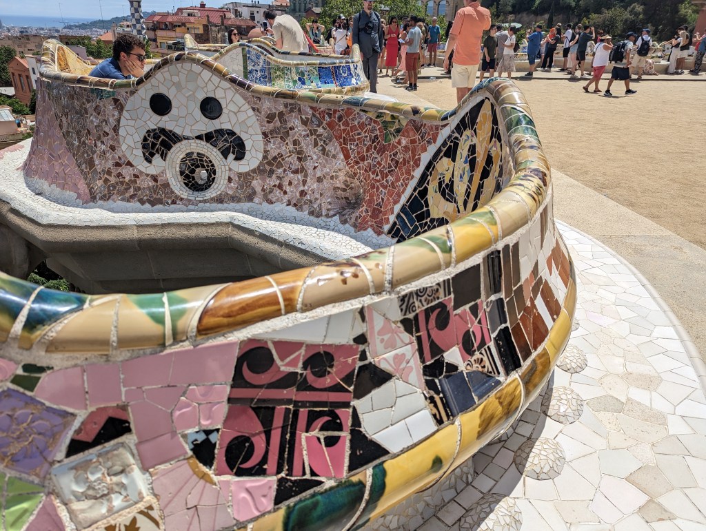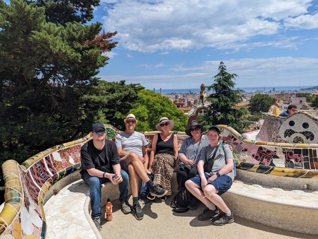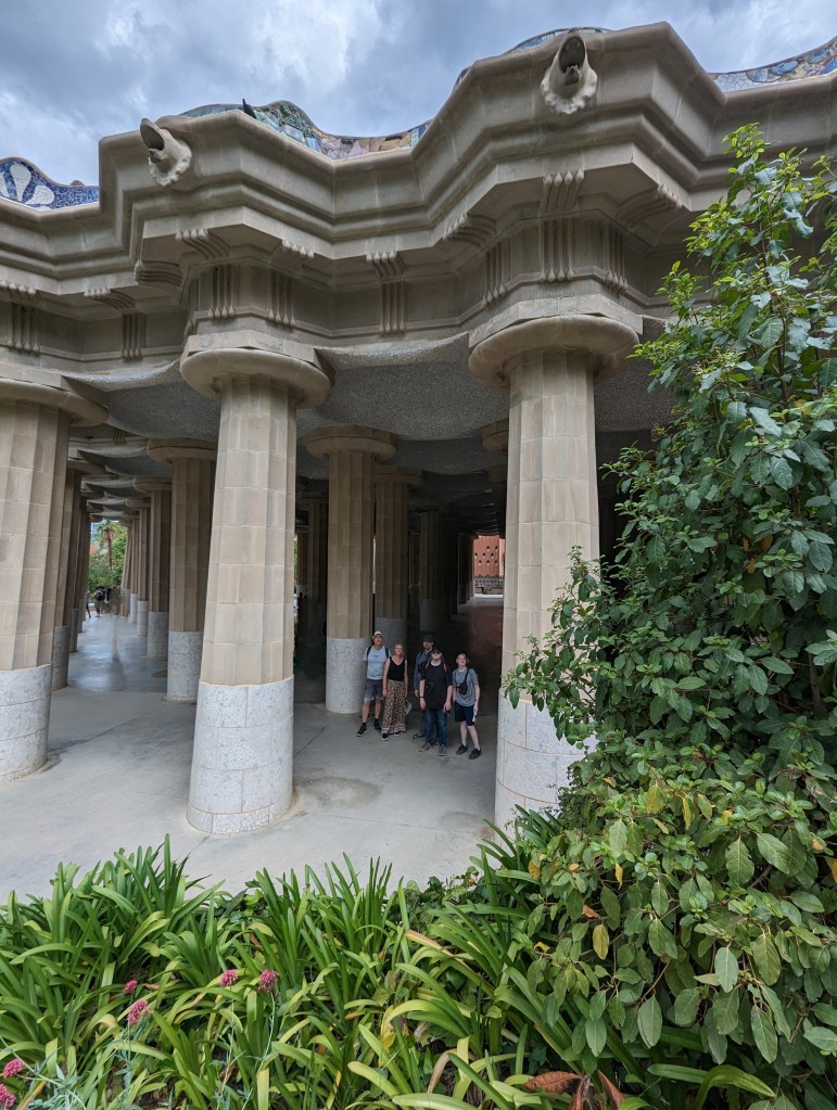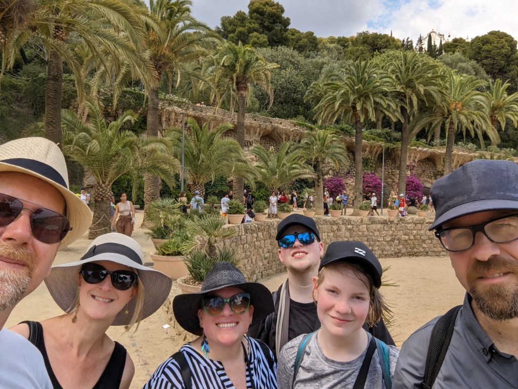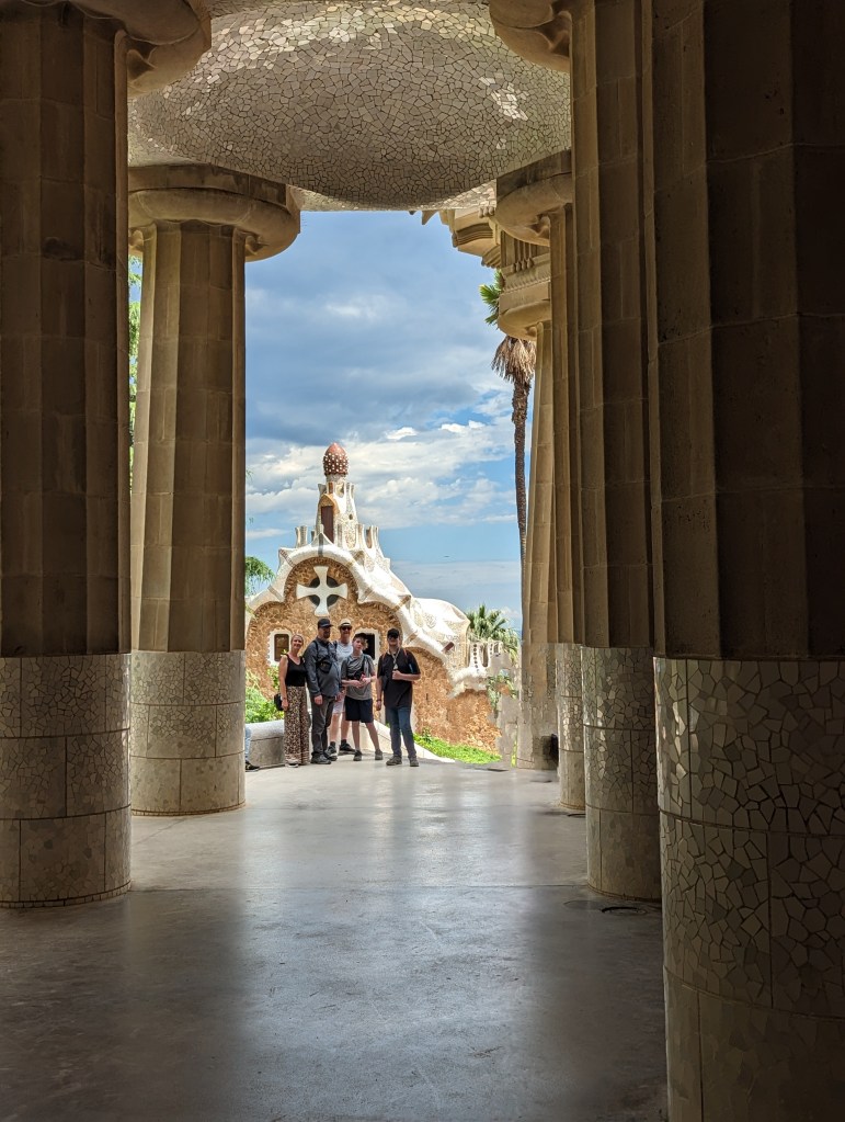 Went back and finished packing. G&B accidentally booked their room for an extra night so we left all our things in their room. We headed back to Park Guell which we bought tickets for this time. When we came off the mountain yesterday, we found a way that had escalators going up, so we were hoping to find those, but ended up hiking up the hill again through the neighborhoods, and seemingly endless staircases. So hot and sweaty when we finally made it. The Park is beautiful – amazing views of the City. Flora and Fauna. Gaudi’s hand can be seen throughout. Found a water source and we all got a bit wet, drank a lot, refilled our bottles, and had a tiny water fight. We saw a lot of parakeets and their nests in the palms. The flowers were so bright and beautiful. Gaudi’s mosaics, rolling benches, colonnades, pillars, fountains, buildings.