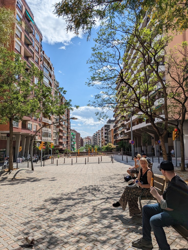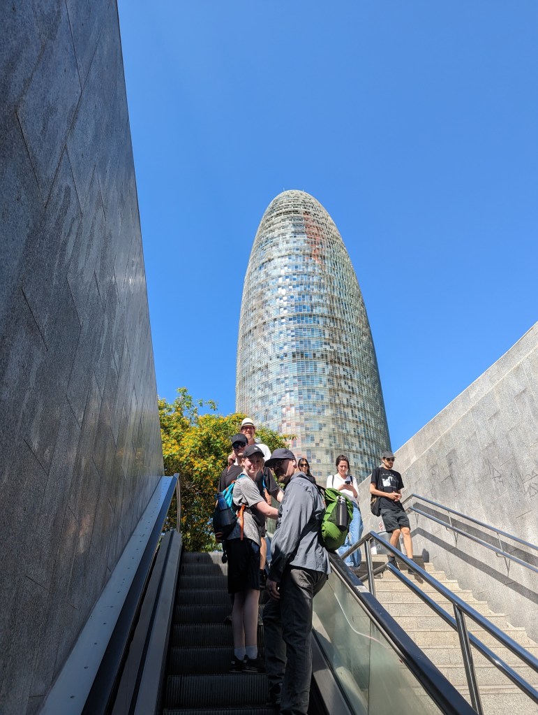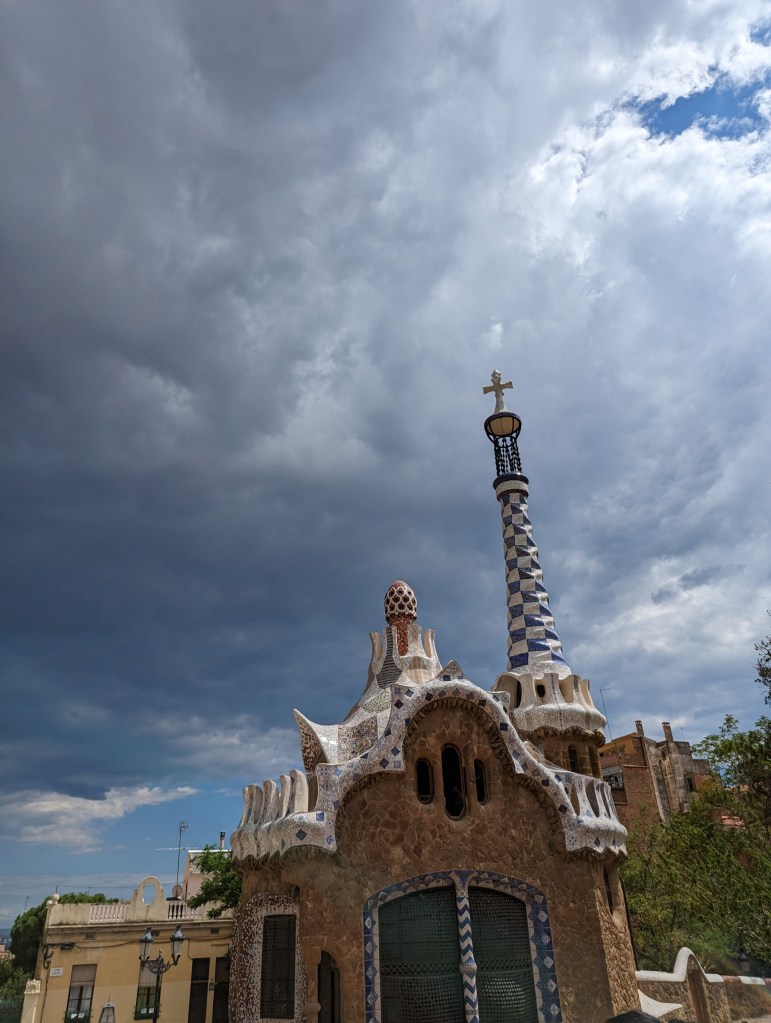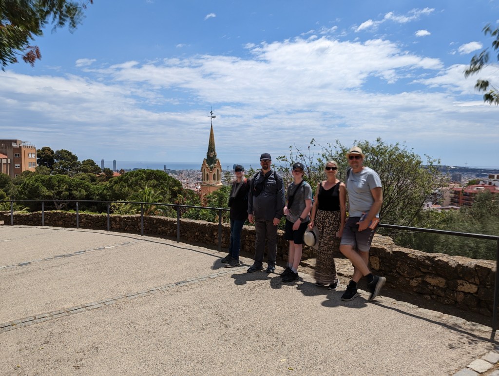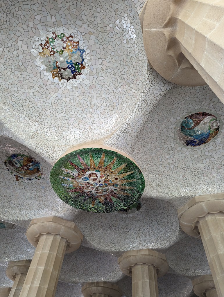Went back and finished packing. G&B accidentally booked their room for an extra night so we left all our things in their room. We headed back to Park Guell which we bought tickets for this time. When we came off the mountain yesterday, we found a way that had escalators going up, so we were hoping to find those, but ended up hiking up the hill again through the neighborhoods, and seemingly endless staircases. So hot and sweaty when we finally made it. The Park is beautiful – amazing views of the City. Flora and Fauna. Gaudi’s hand can be seen throughout. Found a water source and we all got a bit wet, drank a lot, refilled our bottles, and had a tiny water fight. We saw a lot of parakeets and their nests in the palms. The flowers were so bright and beautiful. Gaudi’s mosaics, rolling benches, colonnades, pillars, fountains, buildings.
