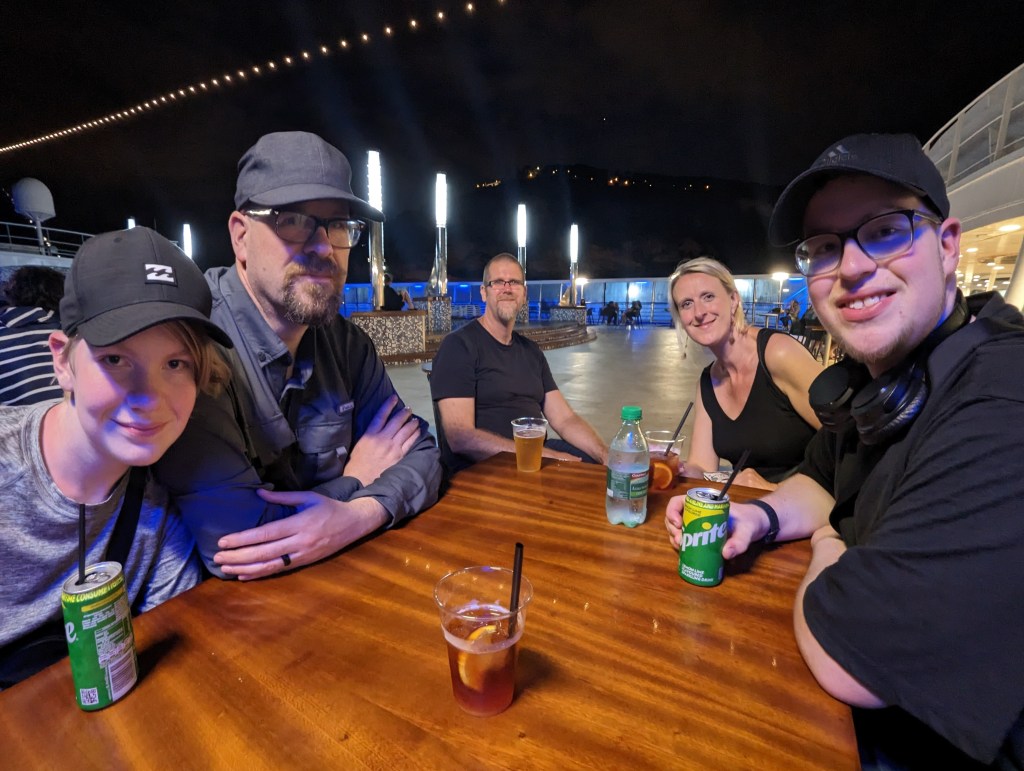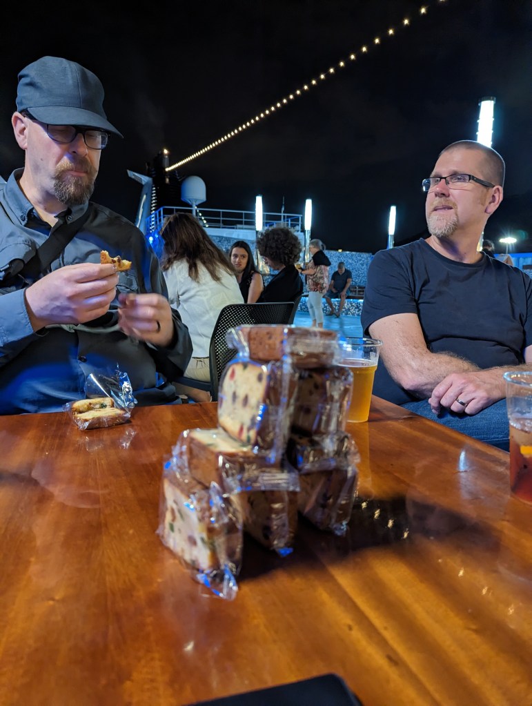 We headed out to explore the ship. Had a look at the disco, the casino, the arcade, and the restaurants. We were due to leave at 11 pm. We went to the deck bar and G&B bought us drinks. B and I had Negronis. Italian classics. Super strong and bitter, not terrible, but not easy to drink. We also ate our stolen cakes.