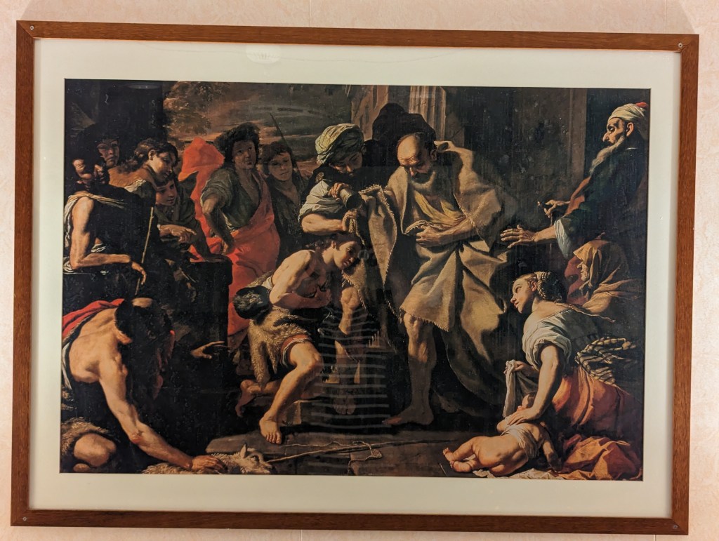 Checked in at the terminal and then went to the waiting room. They said boarding would begin at 830 pm. There were X Ray machines in the room, so we thought someone would come and open that up and tell us to start boarding, but then we saw that people were just heading out of the building and on to the gangway and into the ship, so we did the same. We got on board and went to find our rooms. Our room was so hard to find and far from G&Bs room, and when we got into the room, it hadn’t been cleaned! I headed down to reception leaving Colin and the boys in the room only to find that G&B were there too and their room hadn’t been cleaned either. We ended up getting new rooms right next to each other which was brilliant. The room was great. A double bed, a pull out sofa, and a pullman bed. Table and chairs, bathroom, closet, fridge. G&Bs room had an Italian painting of a woman nursing a baby with an old man passed out nearby. Ours had a painting of Samuel anointing David – still managed to have a naked baby in it though.