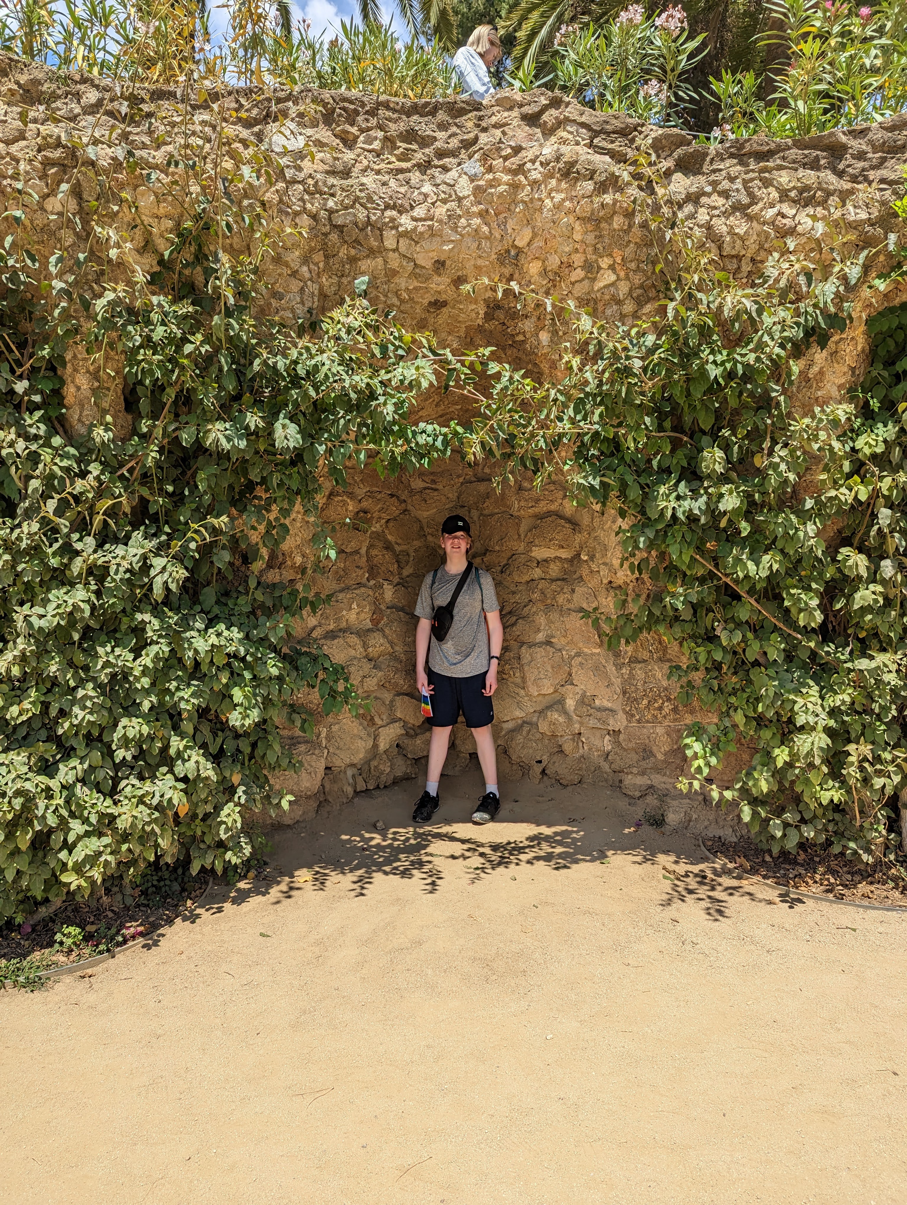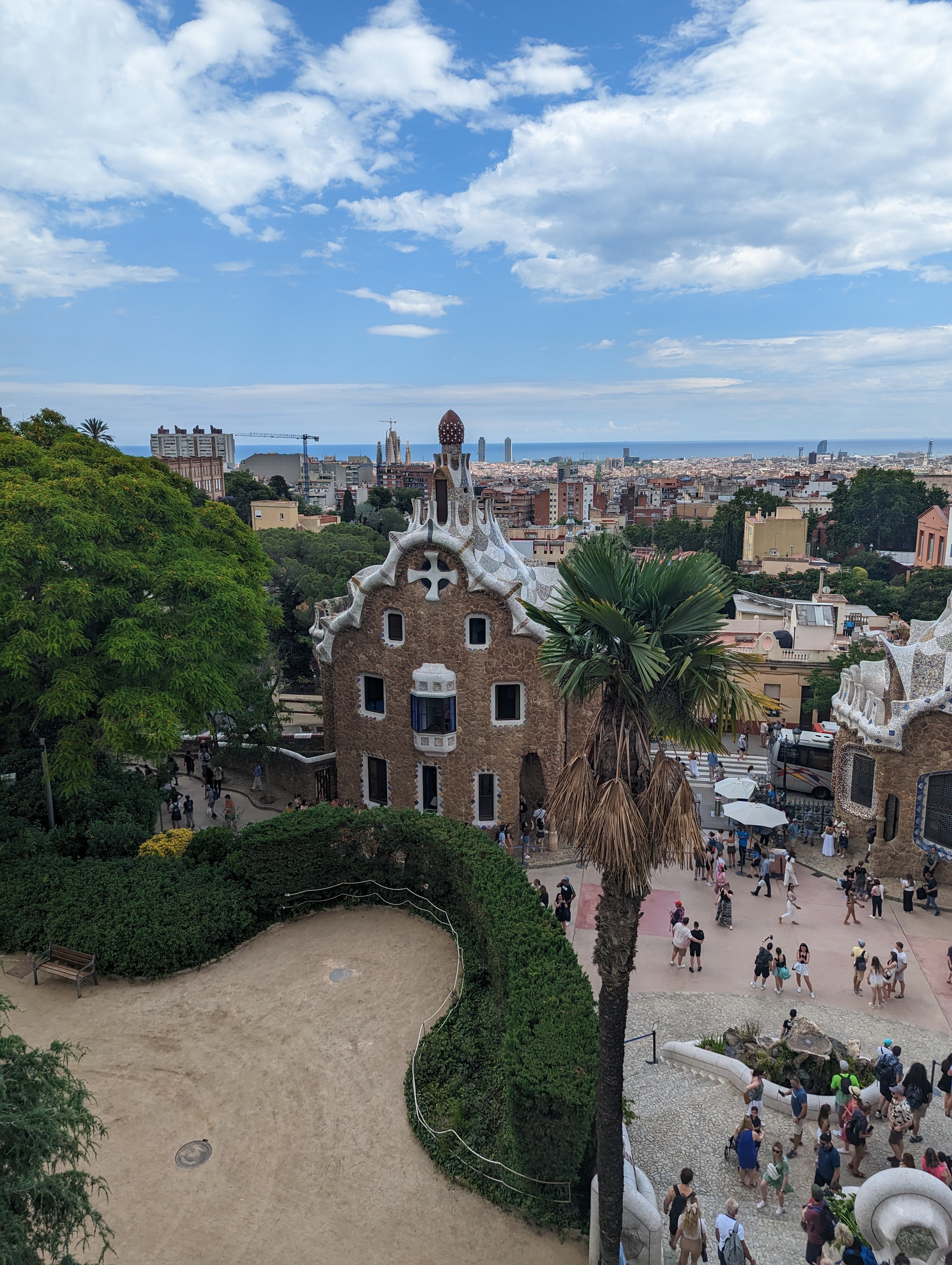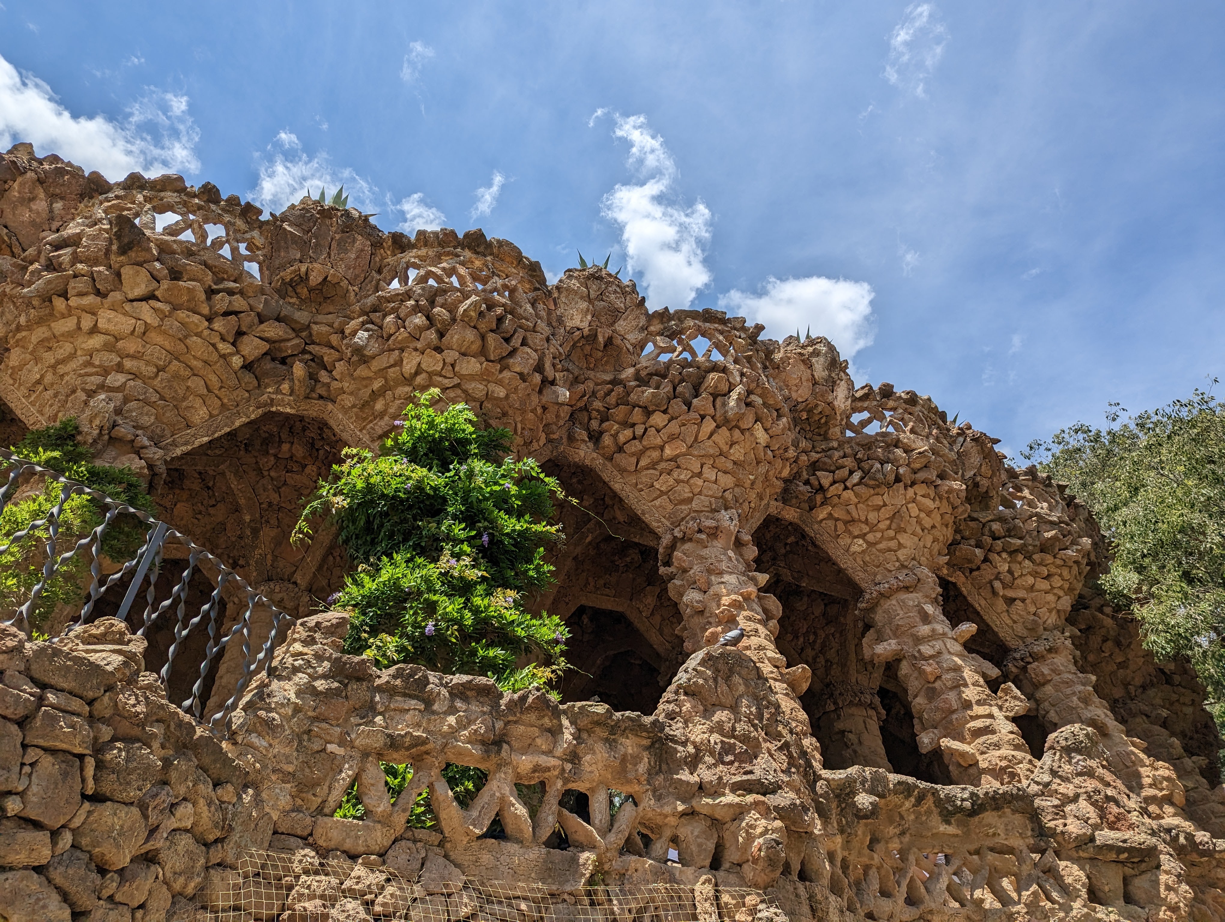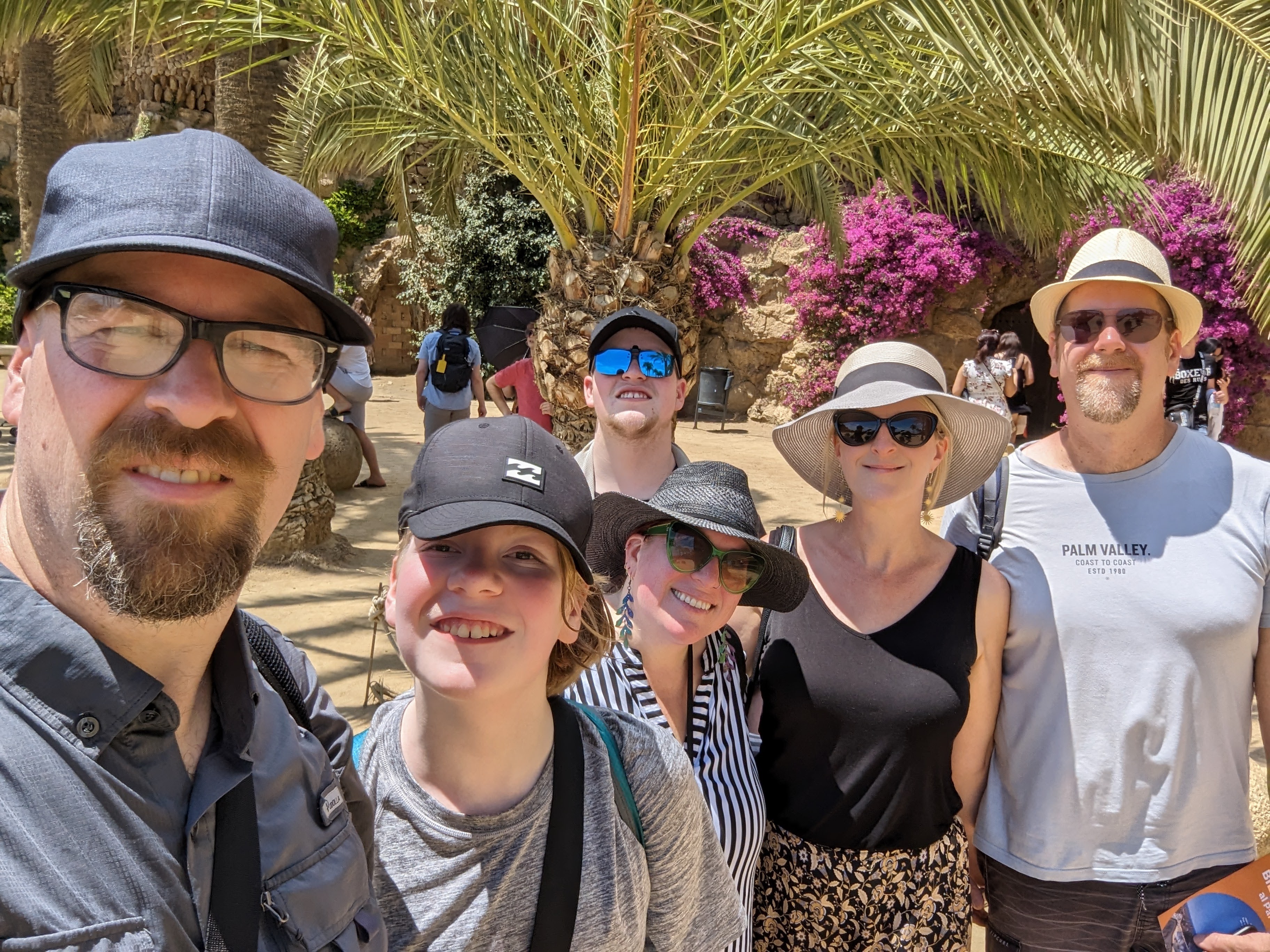 Went back and finished packing. G&B accidentally booked their room for an extra night so we left all our things in their room. We headed back to Park Guell which we bought tickets for this time. When we came off the mountain yesterday, we found a way that had escalators going up, so we were hoping to find those, but ended up hiking up the hill again through the neighborhoods, and seemingly endless staircases. So hot and sweaty when we finally made it. The Park is beautiful – amazing views of the City. Flora and Fauna. Gaudi’s hand can be seen throughout. Found a water source and we all got a bit wet, drank a lot, refilled our bottles, and had a tiny water fight. We saw a lot of parakeets and their nests in the palms. The flowers were so bright and beautiful. Gaudi’s mosaics, rolling benches, colonnades, pillars, fountains, buildings.