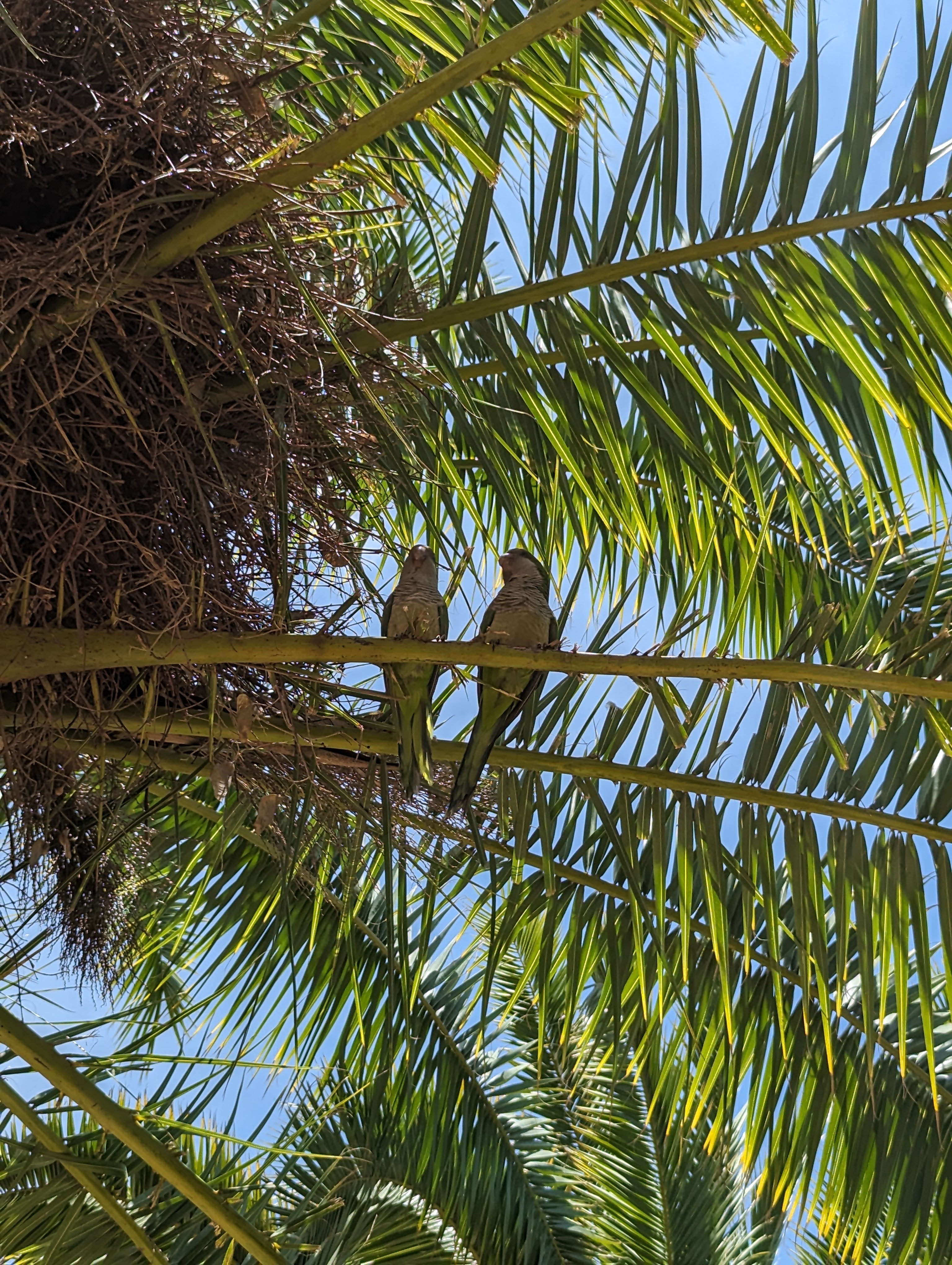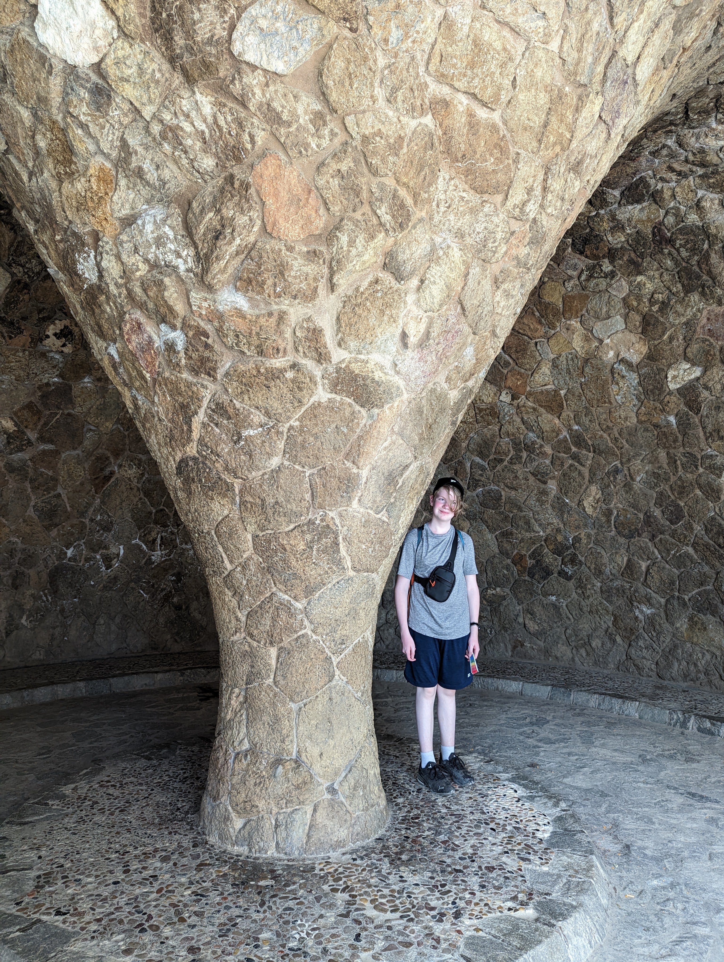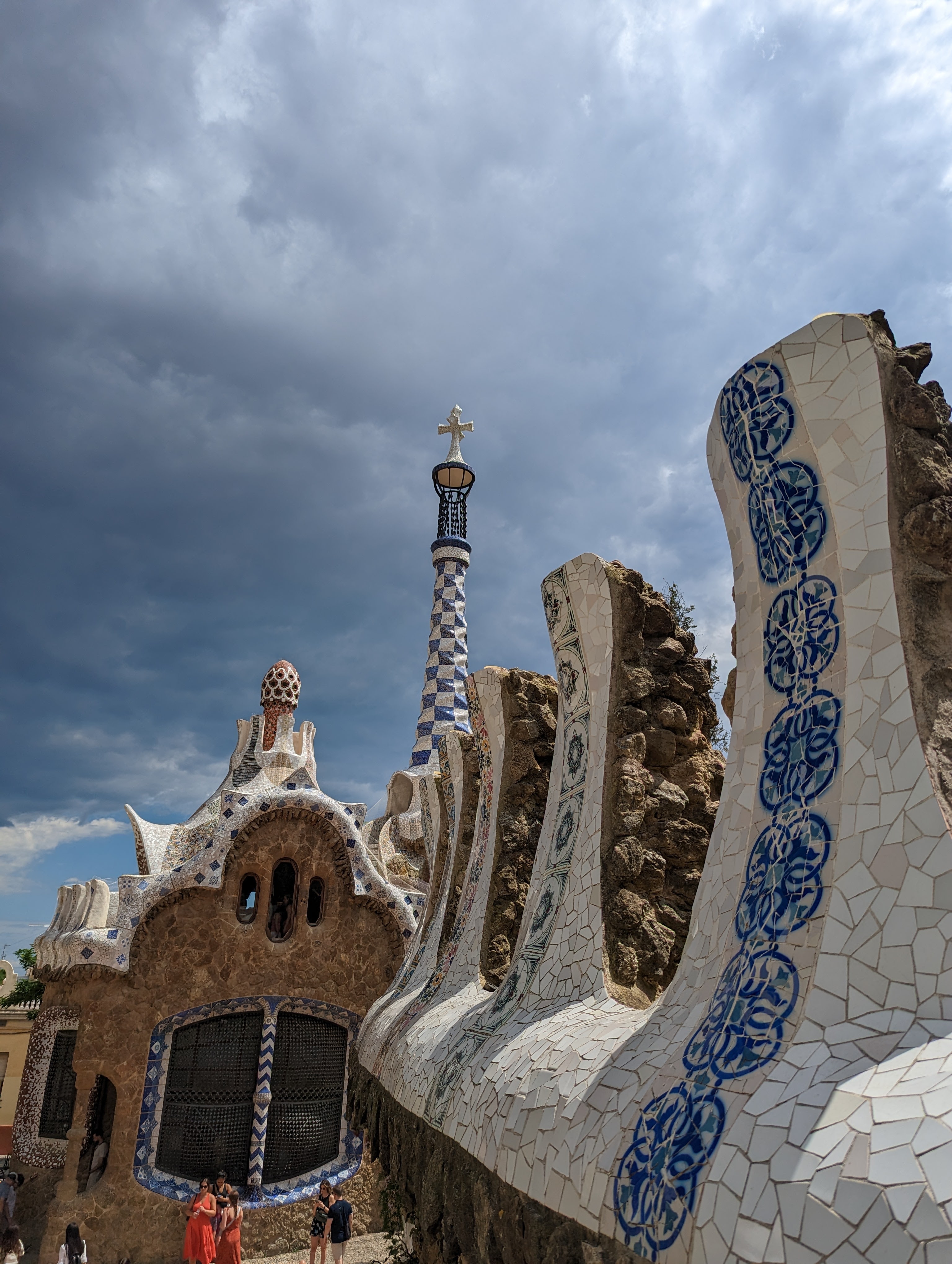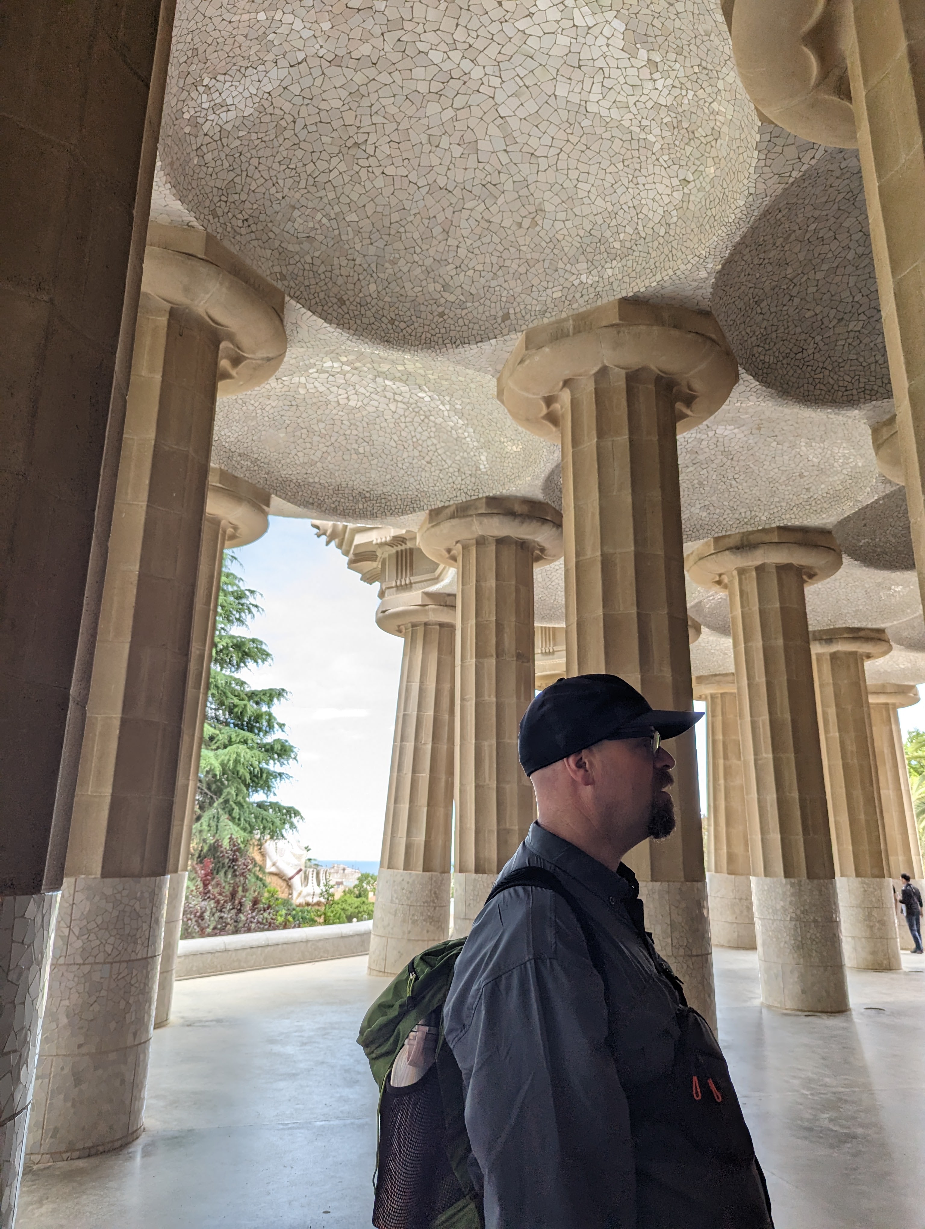 Went back and finished packing. G&B accidentally booked their room for an extra night so we left all our things in their room. We headed back to Park Guell which we bought tickets for this time. When we came off the mountain yesterday, we found a way that had escalators going up, so we were hoping to find those, but ended up hiking up the hill again through the neighborhoods, and seemingly endless staircases. So hot and sweaty when we finally made it. The Park is beautiful – amazing views of the City. Flora and Fauna. Gaudi’s hand can be seen throughout. Found a water source and we all got a bit wet, drank a lot, refilled our bottles, and had a tiny water fight. We saw a lot of parakeets and their nests in the palms. The flowers were so bright and beautiful. Gaudi’s mosaics, rolling benches, colonnades, pillars, fountains, buildings.
