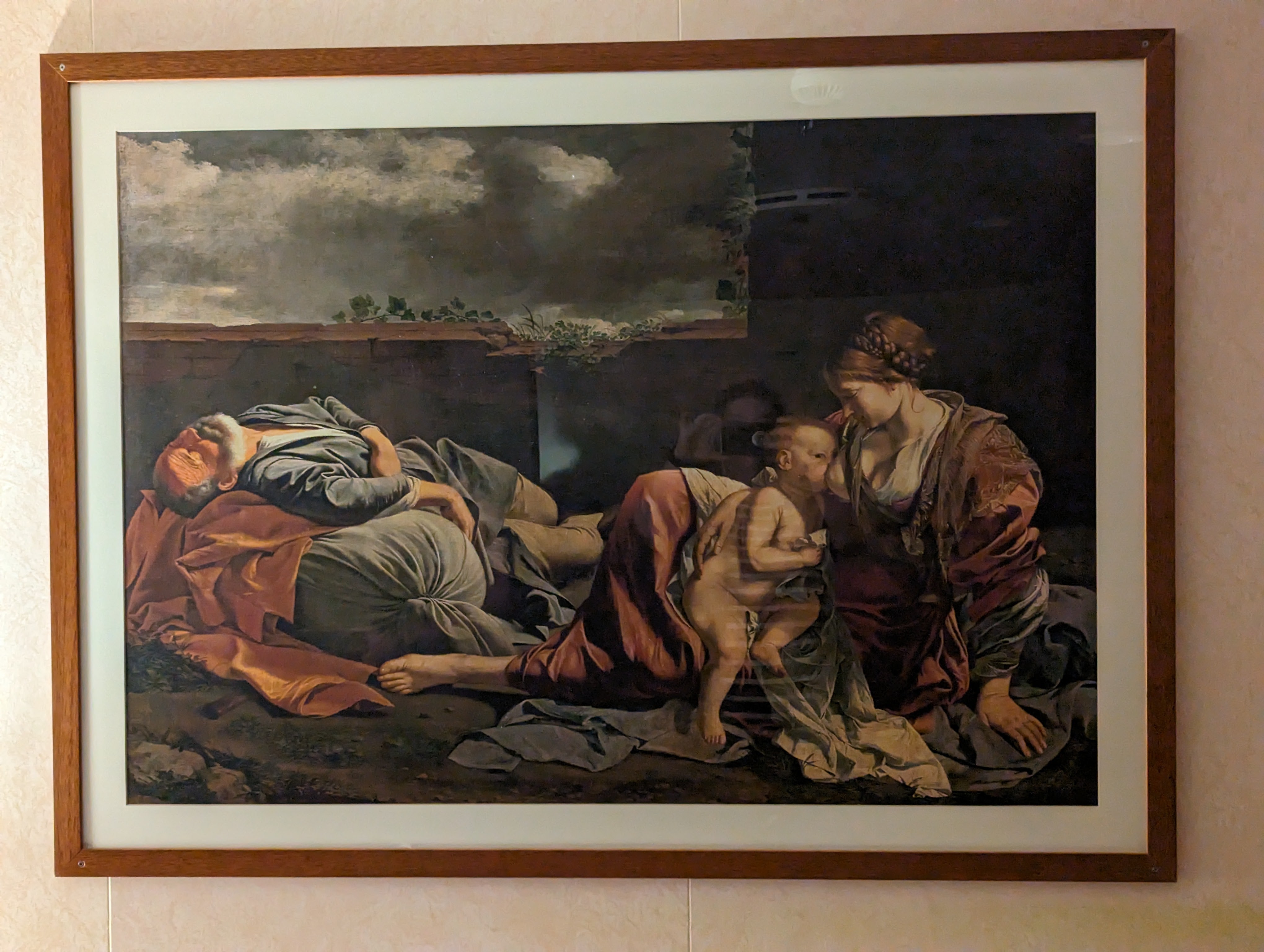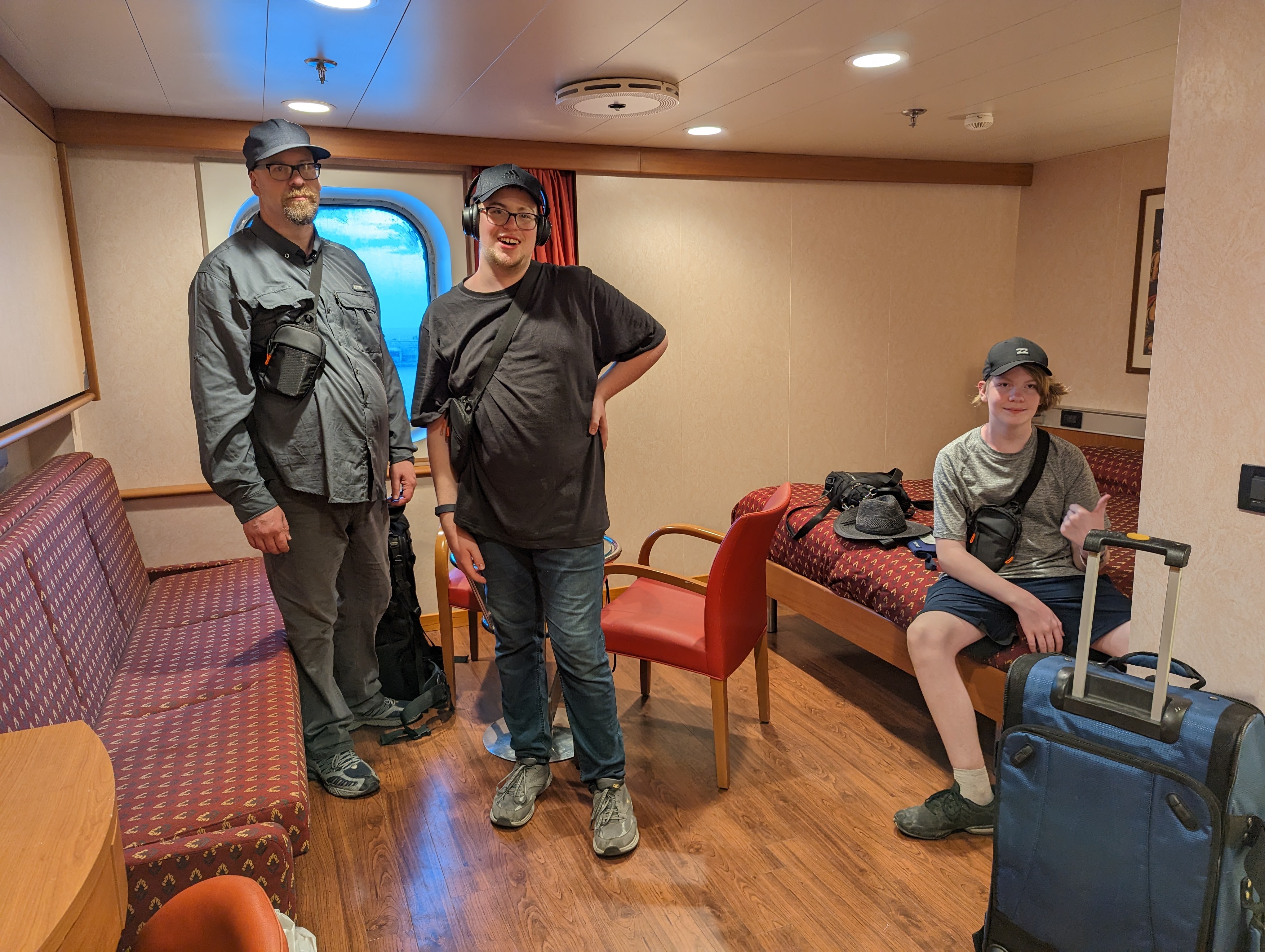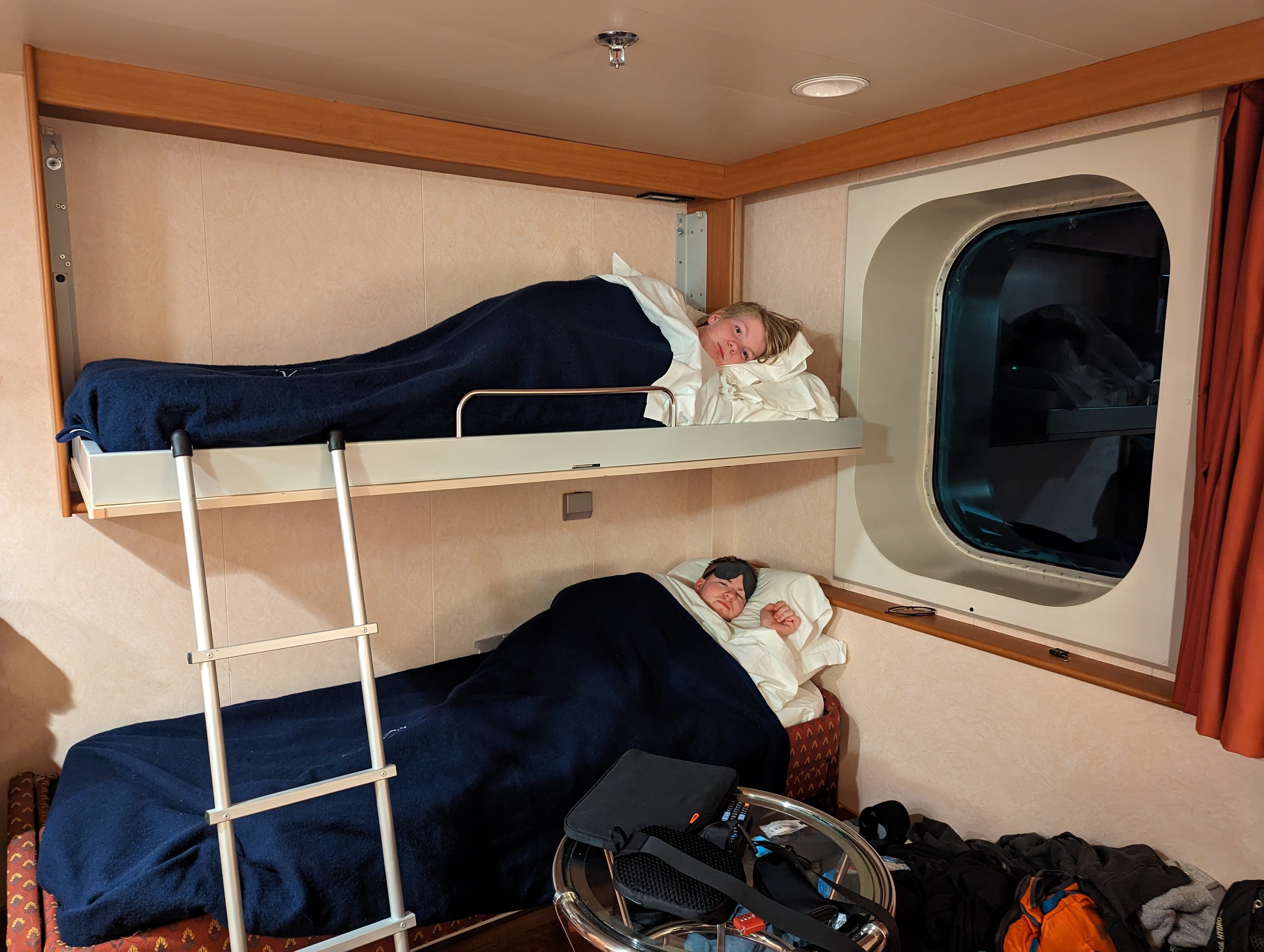 Checked in at the terminal and then went to the waiting room. They said boarding would begin at 830 pm. There were X Ray machines in the room, so we thought someone would come and open that up and tell us to start boarding, but then we saw that people were just heading out of the building and on to the gangway and into the ship, so we did the same. We got on board and went to find our rooms. Our room was so hard to find and far from G&Bs room, and when we got into the room, it hadn’t been cleaned! I headed down to reception leaving Colin and the boys in the room only to find that G&B were there too and their room hadn’t been cleaned either. We ended up getting new rooms right next to each other which was brilliant. The room was great. A double bed, a pull out sofa, and a pullman bed. Table and chairs, bathroom, closet, fridge. G&Bs room had an Italian painting of a woman nursing a baby with an old man passed out nearby. Ours had a painting of Samuel anointing David – still managed to have a naked baby in it though.