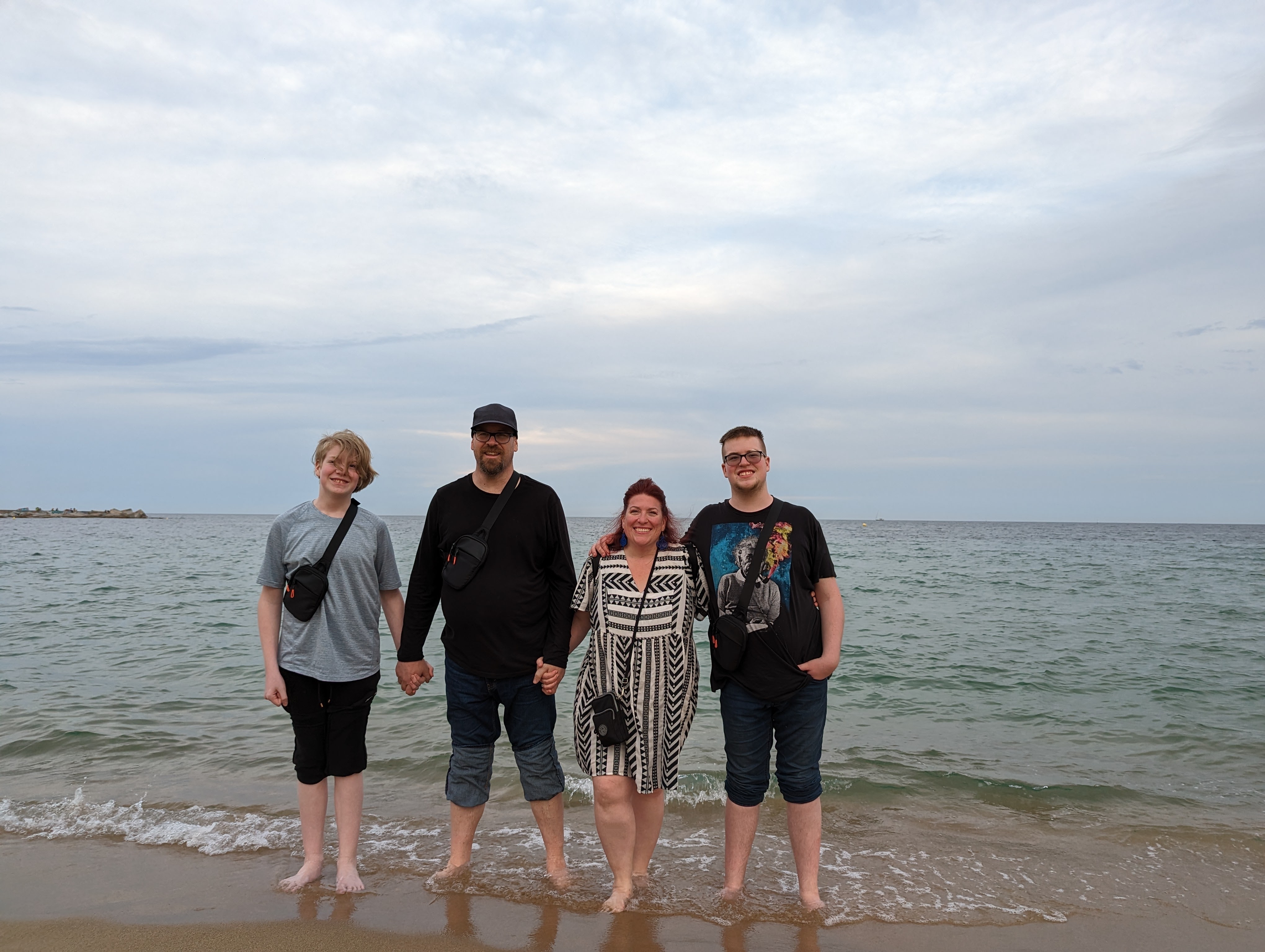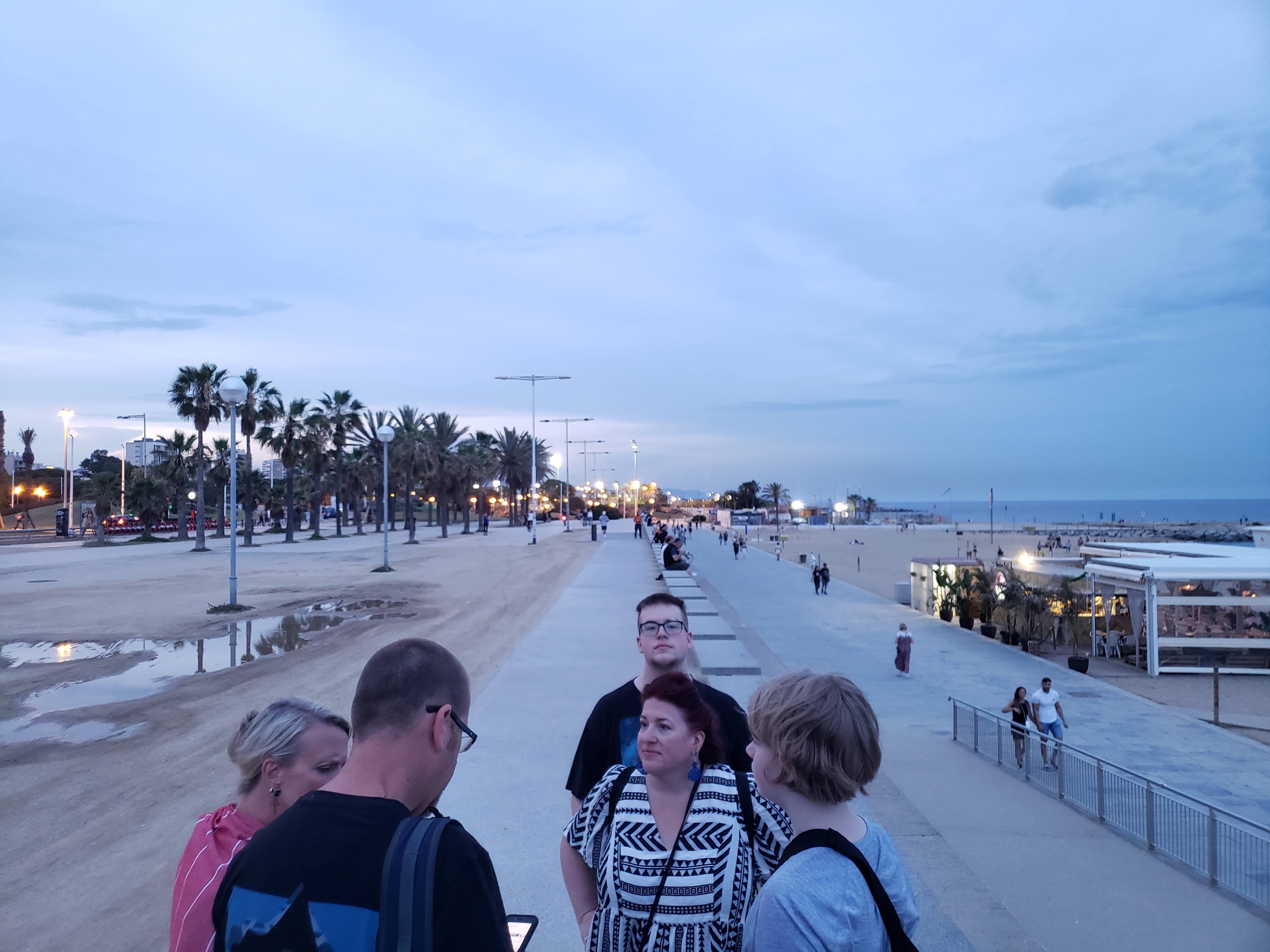 Headed back to the hotel. The Metro is great. Went to our rooms and had a 45 minute rest, before heading back out to go to the beach. Sat at the beach; overlooking the beach on benches and then sitting in the sand chatting for a couple of hours, people watching, digging holes, refreshing our souls. Everyone put their feet in the Baleariac/Mediterranean Sea.
