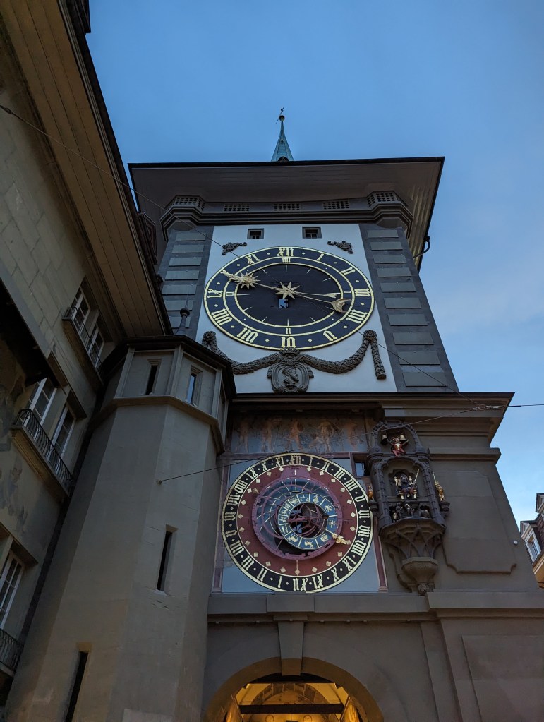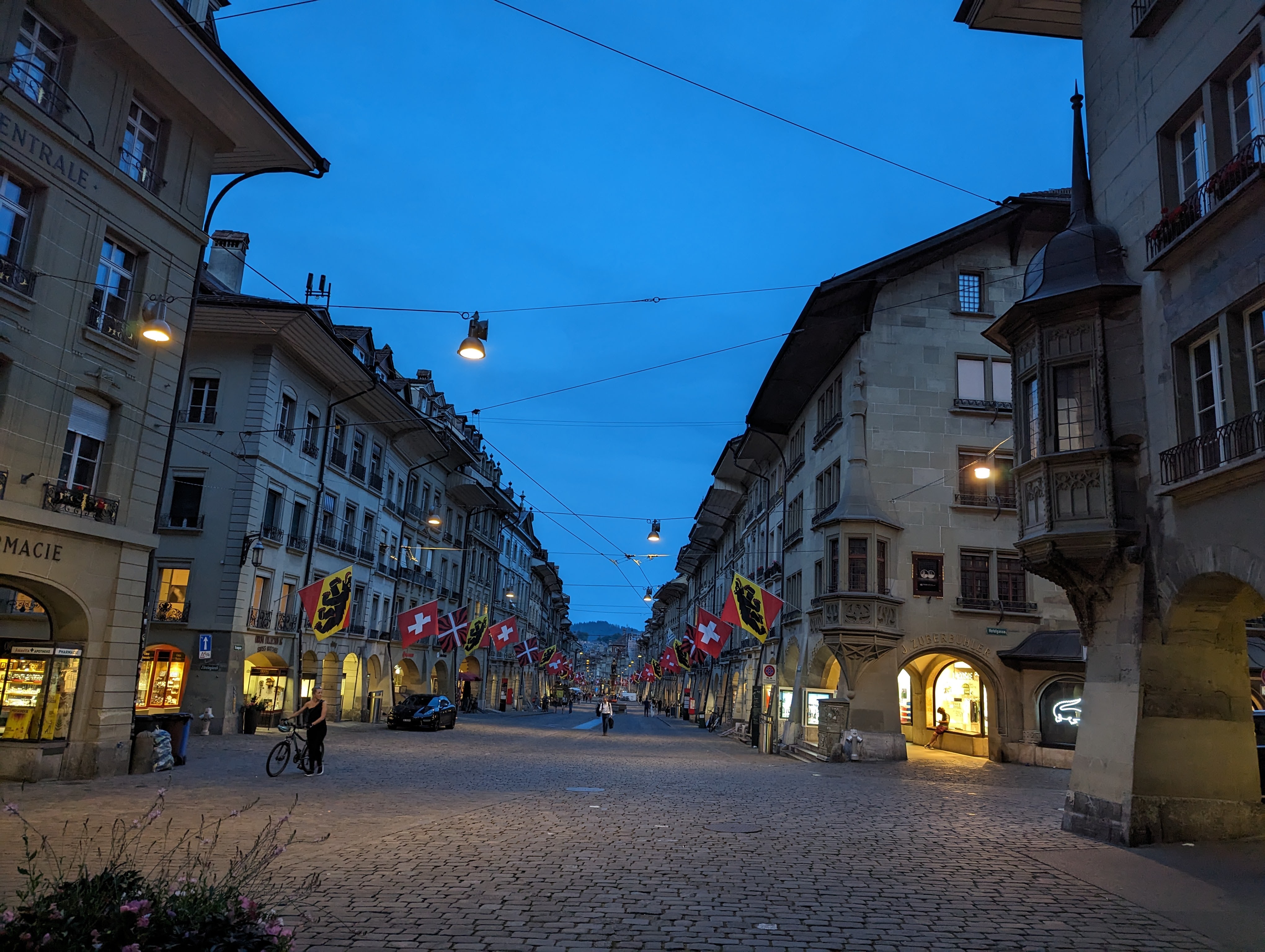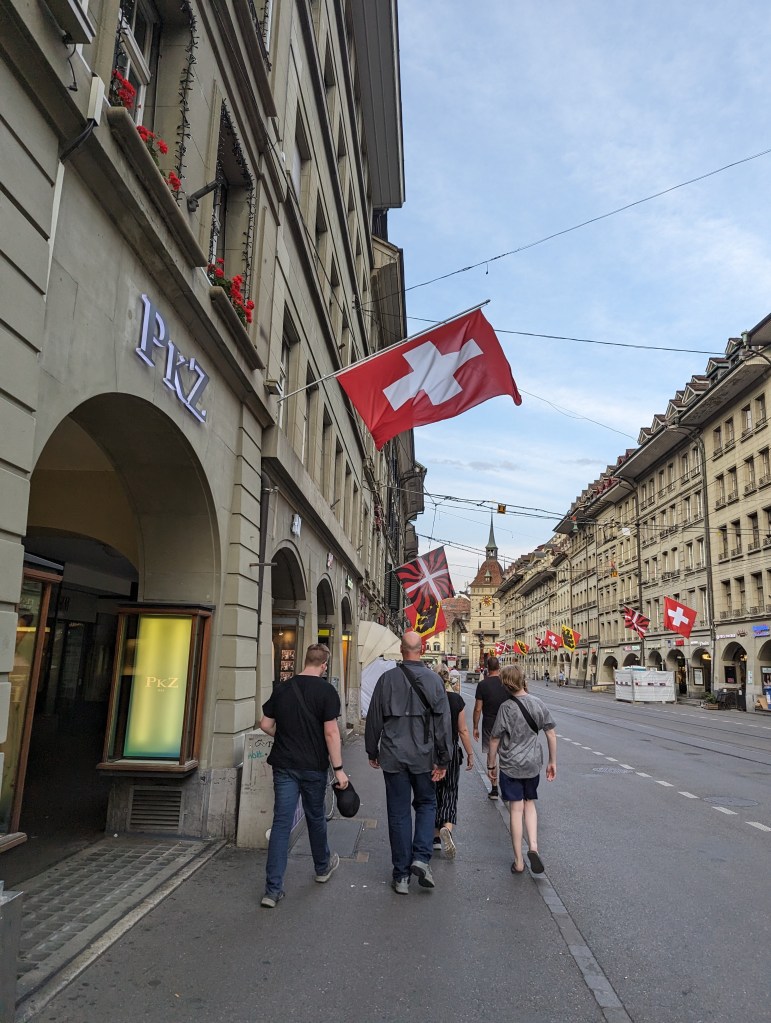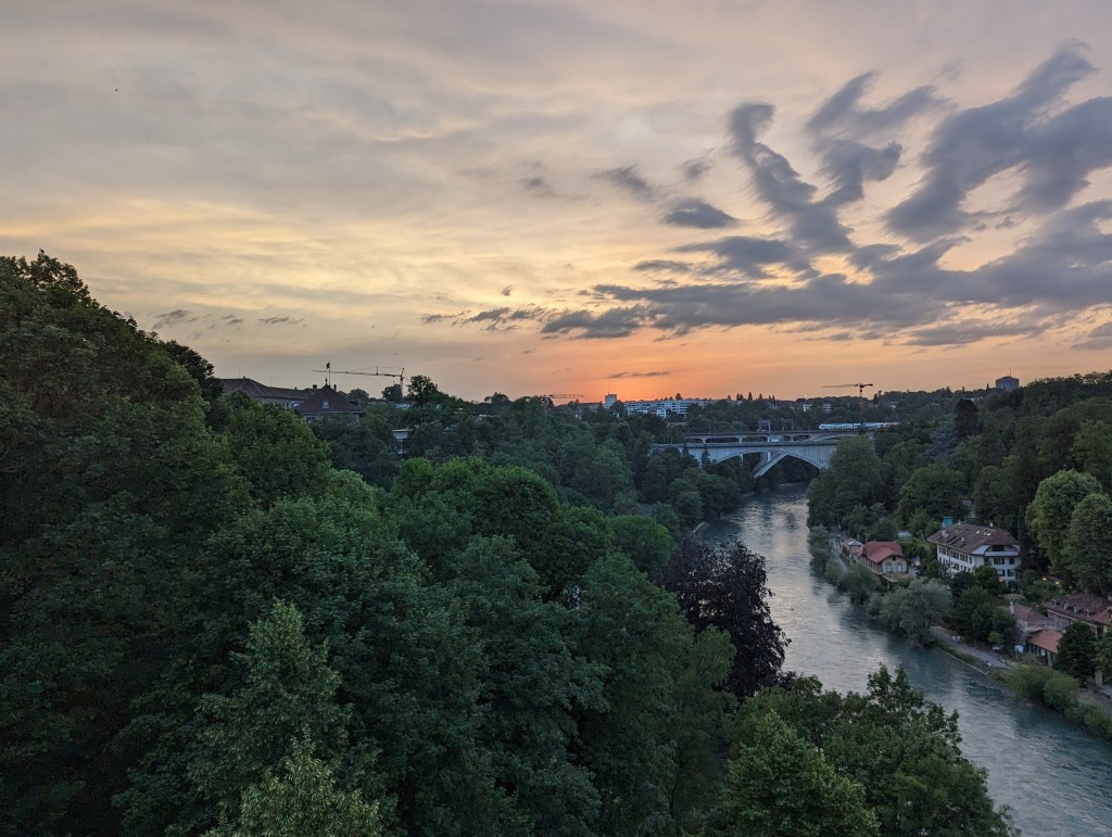 Then we headed off to explore a bit. Had a wander around Old Town, ended up on a bridge, Kornhausbrücke, at sunset. Such a beautiful city. It looks like a fairy tale. Lots of greenery. The River Aare is a beautiful turquoise blue/green. There are lots of fountains with lovely, drinkable water. Lots of strange statues that depict odd things – including a monster/man eating babies. There were flags everywhere – Swiss, Bern, The Canton, and many others. Everything is written in German which is kind of jarring when you’ve only really seen it in movies about Nazis. Combined, it was quite militant at times, overall though it was so lovely, ordered, great public transport (free for visitors), lots of parks and green spaces, people were very relaxed. After being in Mediterranean places, it was strange to be out in the evening and have all the shops closed. It also stayed light quite late.