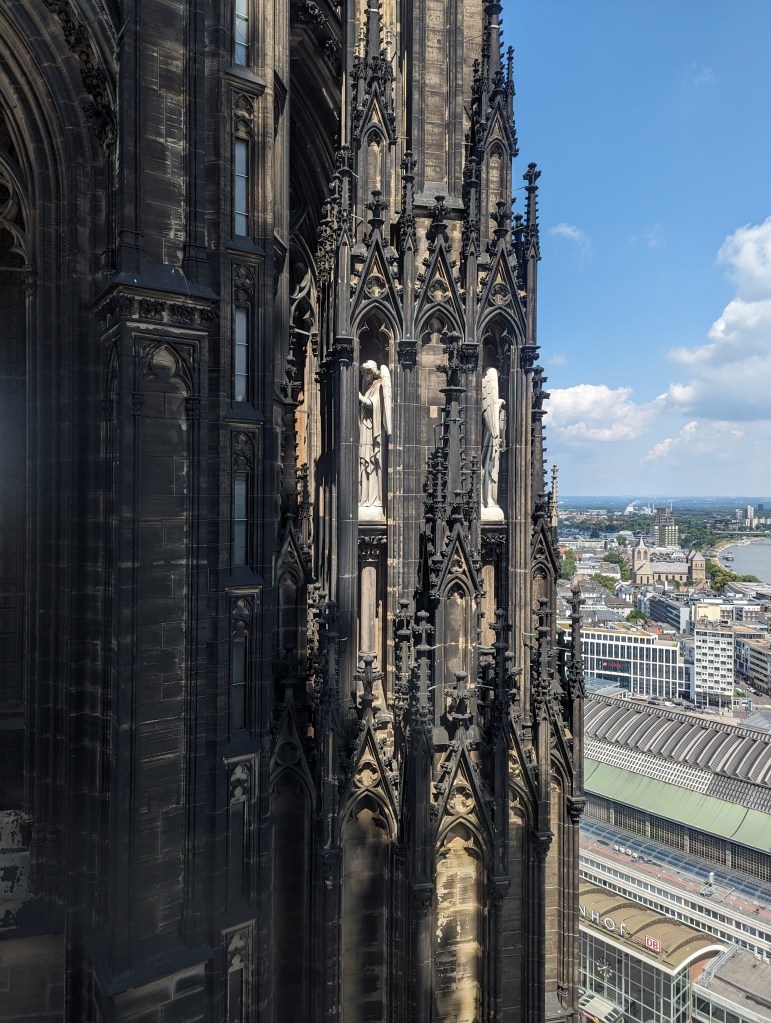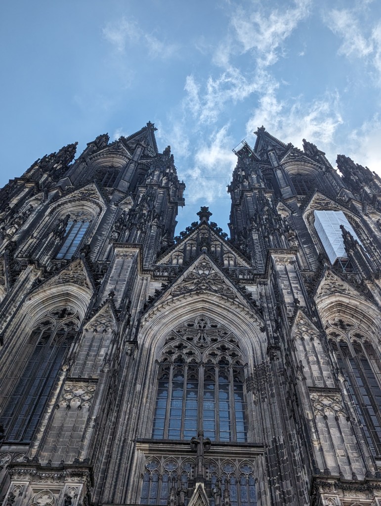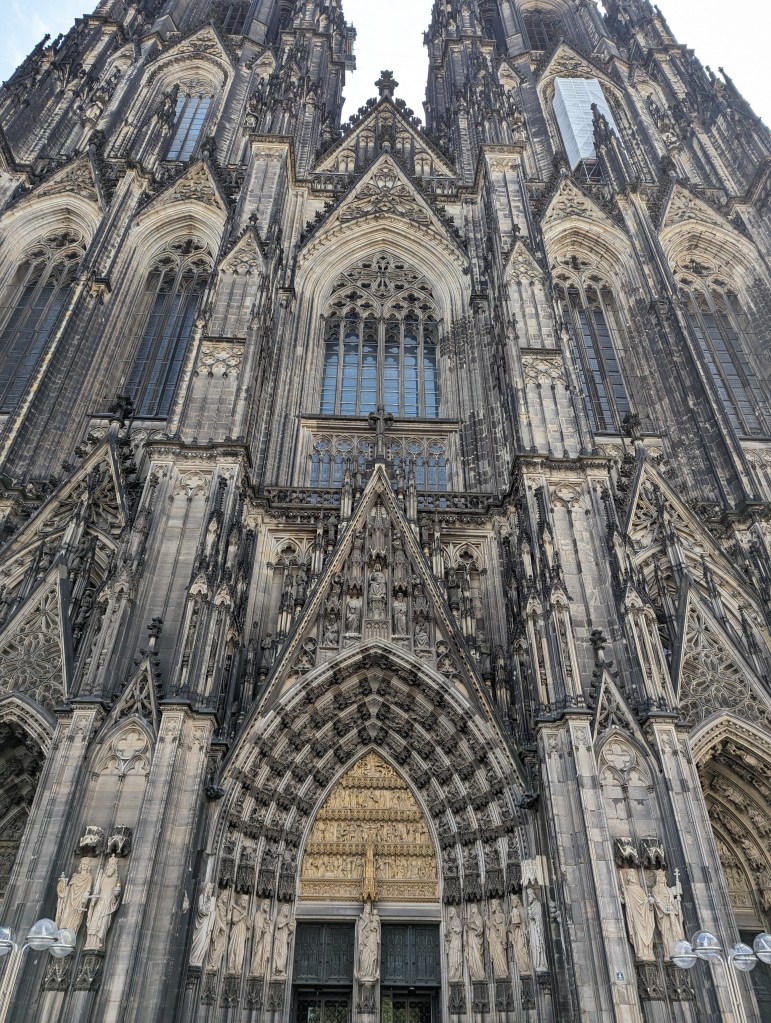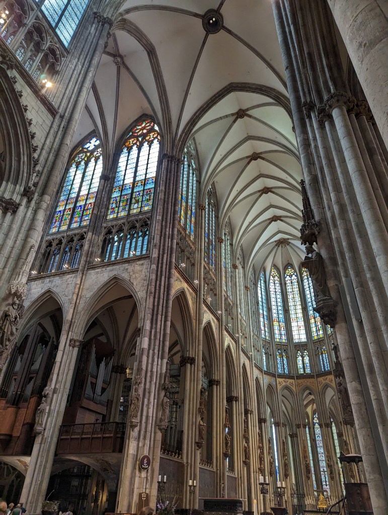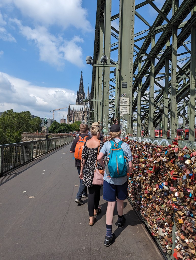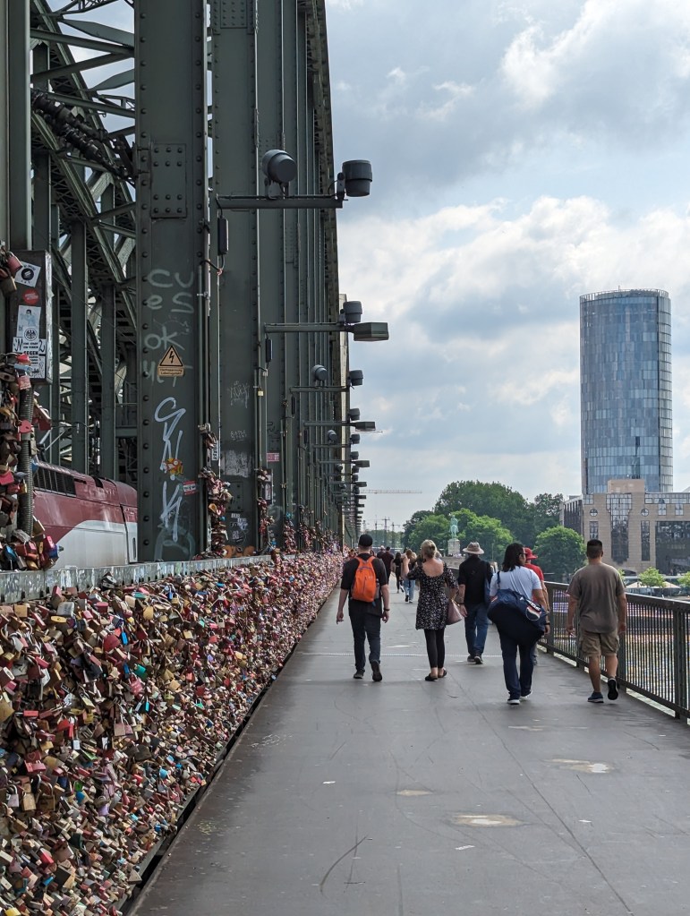 We got up and found a lovely coffee shop/bakery right outside. Fueled up with pastries and coffee, we headed to the Cathedral. We looked around the outside of the Cathedral for a while. A fine example of a Gothic cathedral with lots of flying buttresses and and elaborate sculptures and fun gargoyles. Before we went into the Cathedral, we went out onto the Hohenzollern Bridge, Hohenzollernbrücke. It is absolutely covered in locks of love. It’s a cool bridge too.