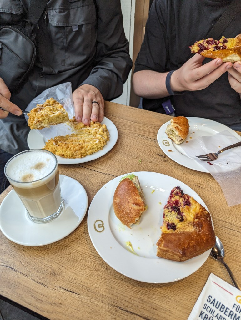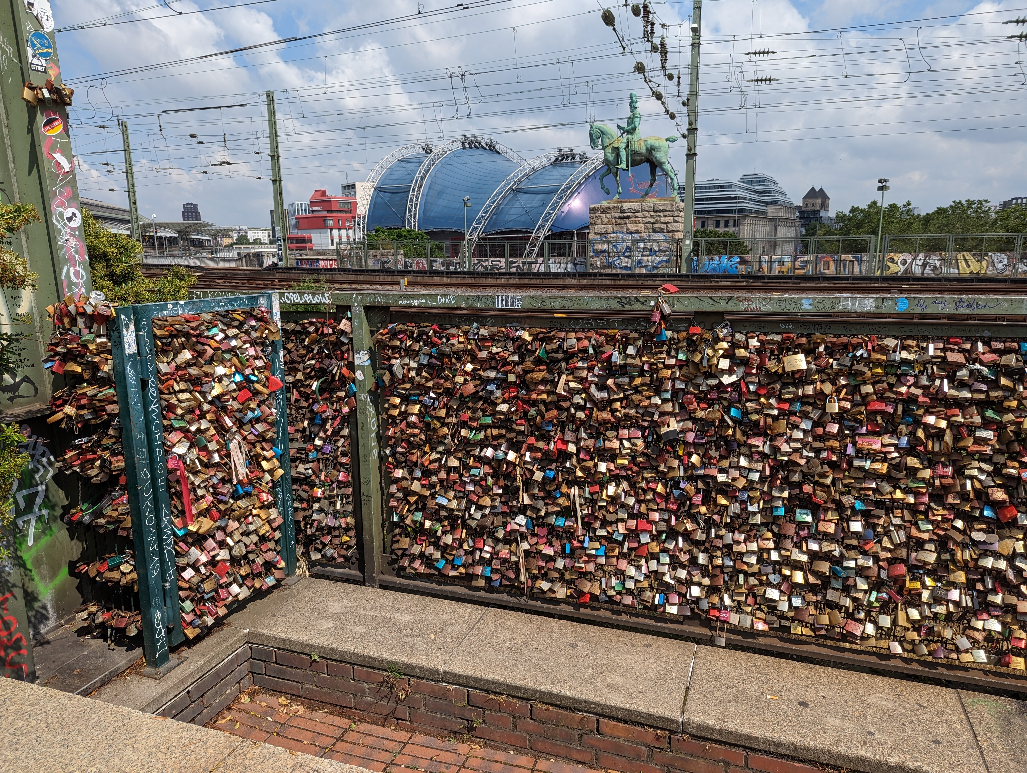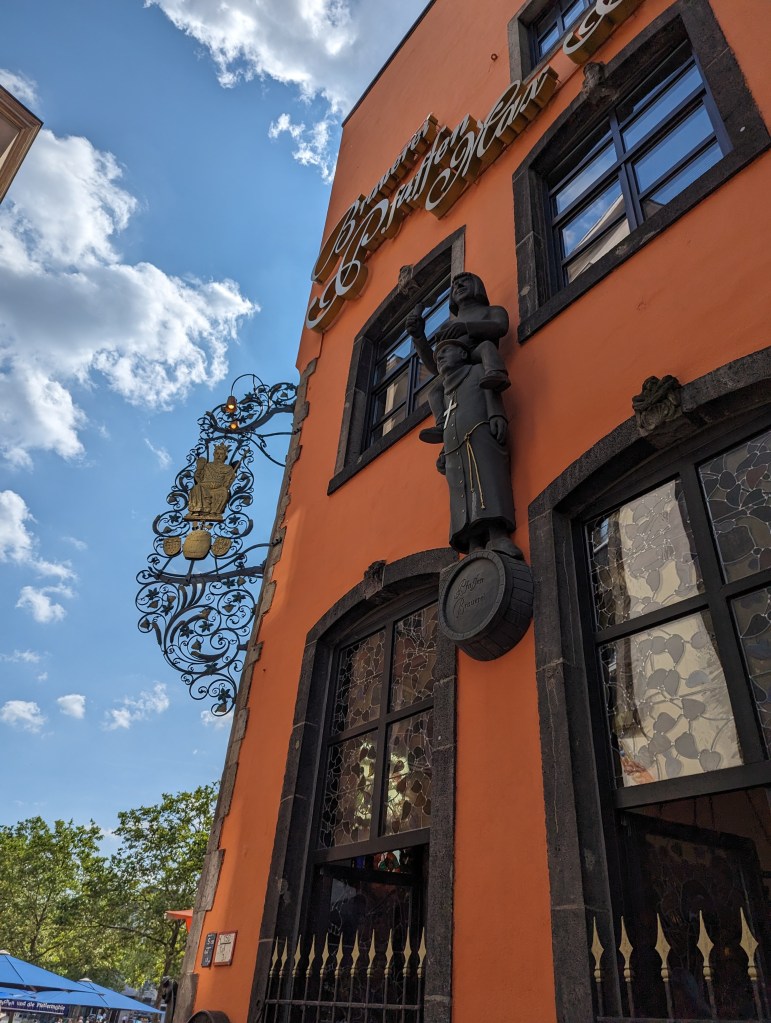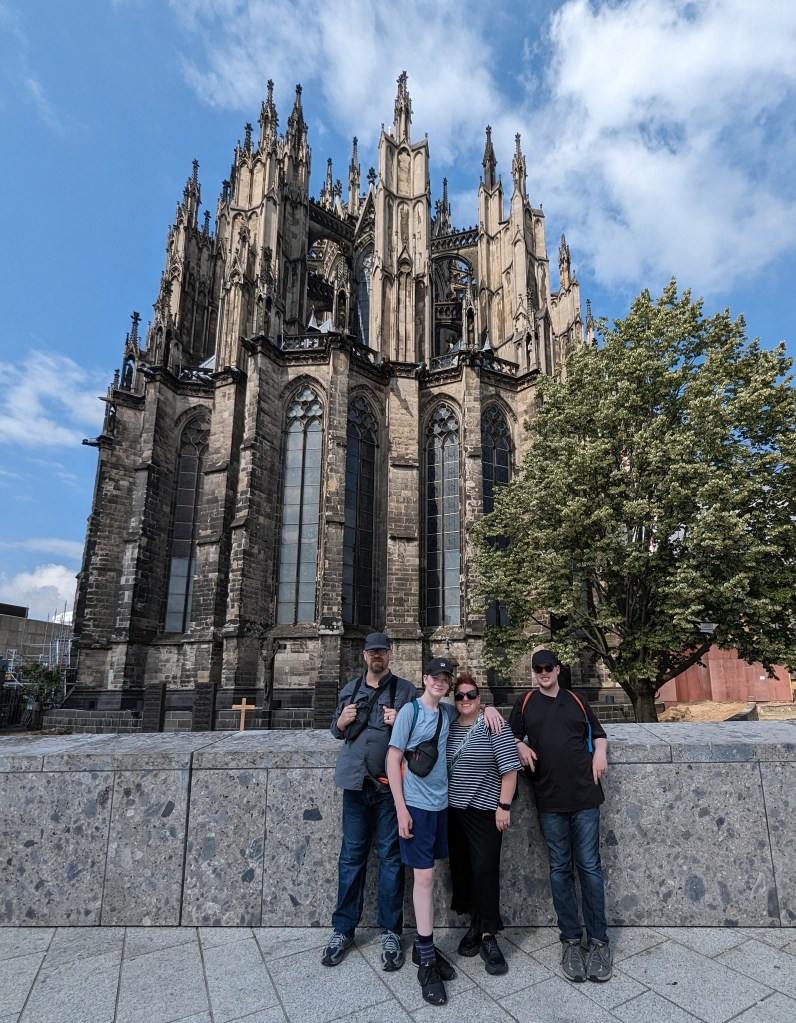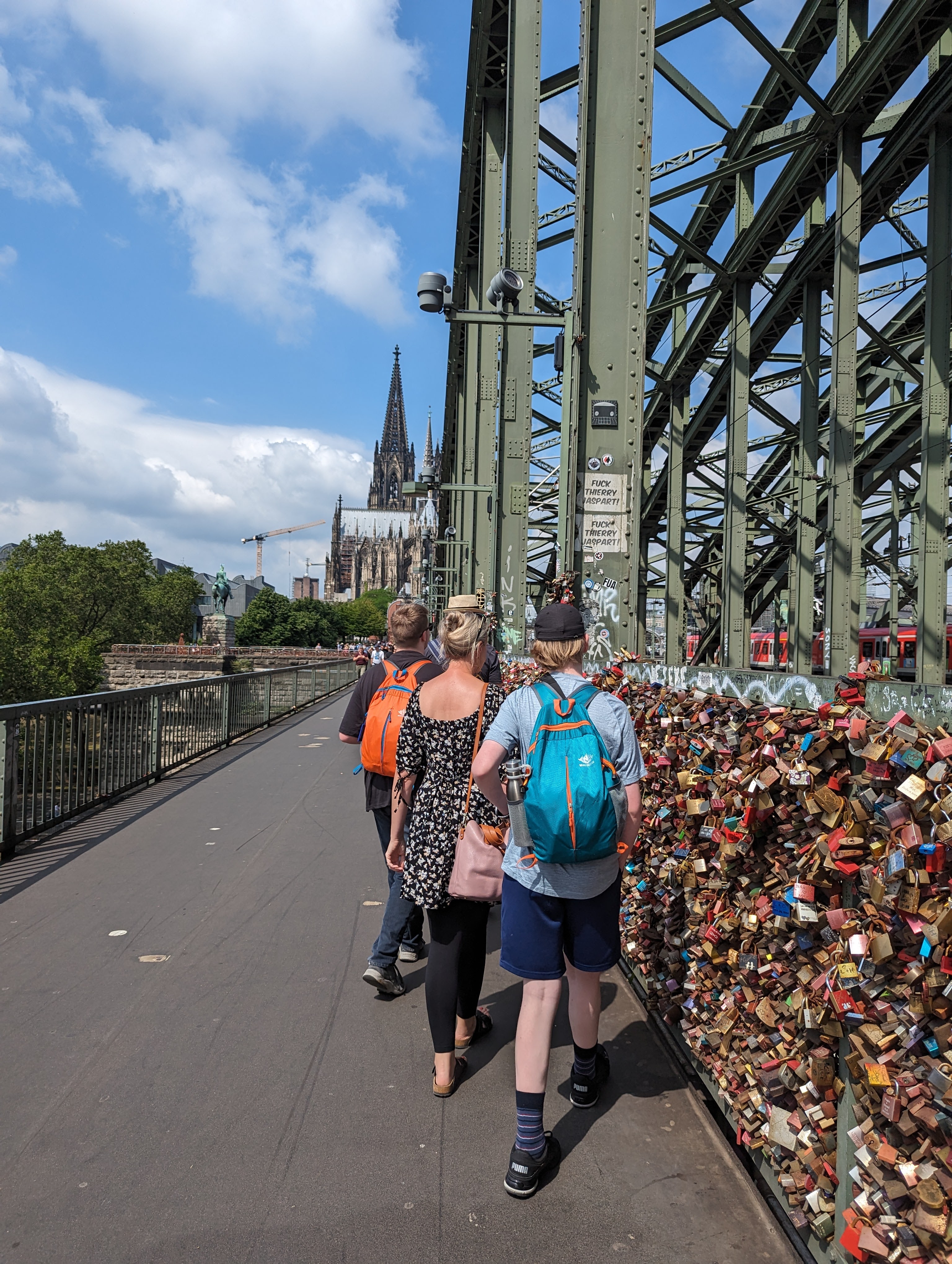 We got up and found a lovely coffee shop/bakery right outside. Fueled up with pastries and coffee, we headed to the Cathedral. We looked around the outside of the Cathedral for a while. A fine example of a Gothic cathedral with lots of flying buttresses and and elaborate sculptures and fun gargoyles. Before we went into the Cathedral, we went out onto the Hohenzollern Bridge, Hohenzollernbrücke. It is absolutely covered in locks of love. It’s a cool bridge too.