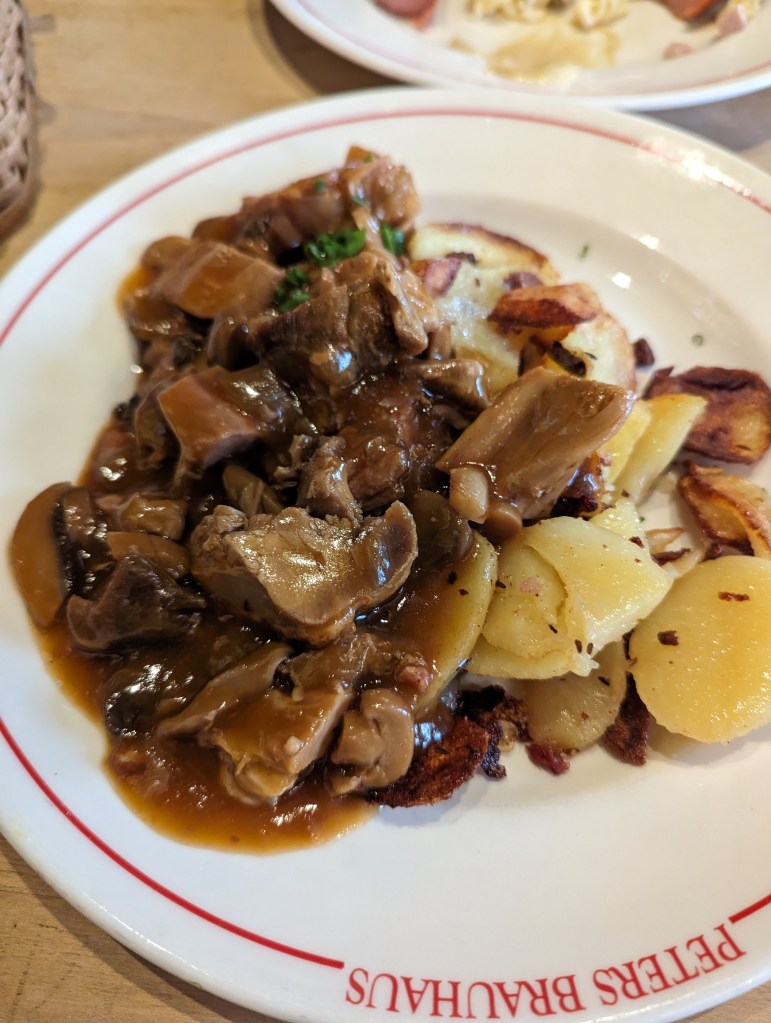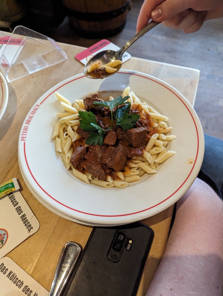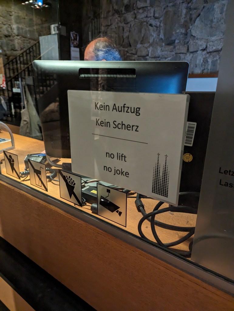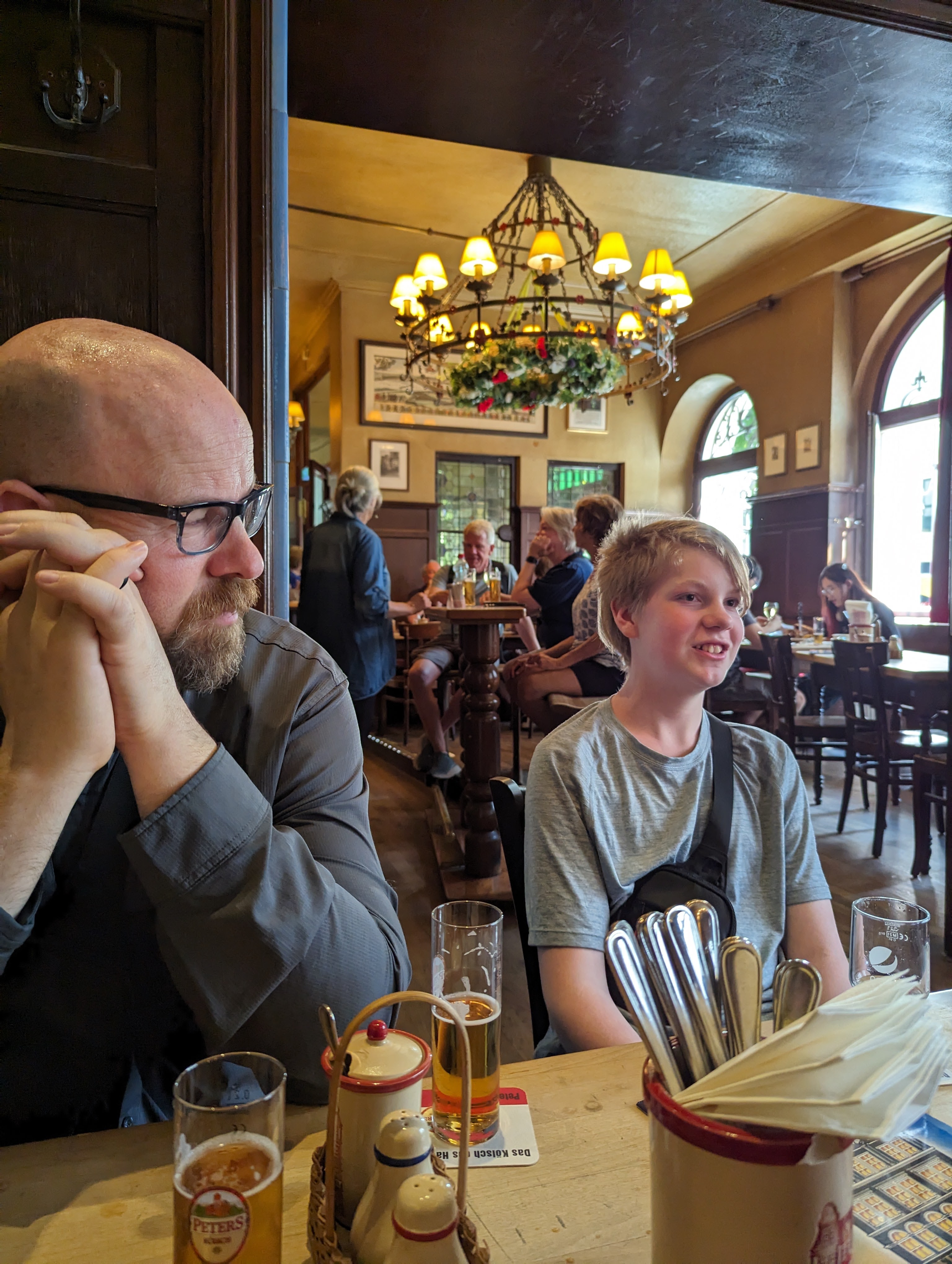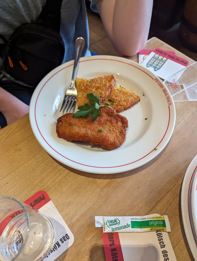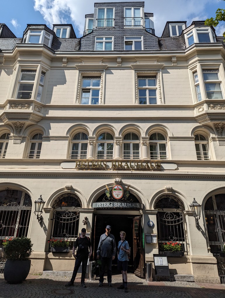 We headed off to the original Eau de Cologne store to have a smell and ended up buying some – it’s lovely. Then we wandered through Old Town and found a great German Beer House to have lunch – Peters Brauhaus. We had sausage, escalope, goulash, and ragout – all very tasty. The waiter/owner brought beers for everyone at the table, including Jude, except Zane. Zane had a Sprite. Drinking or buying beer and wine is legal at age 16. Turns out the beer was cheaper than the soda.
