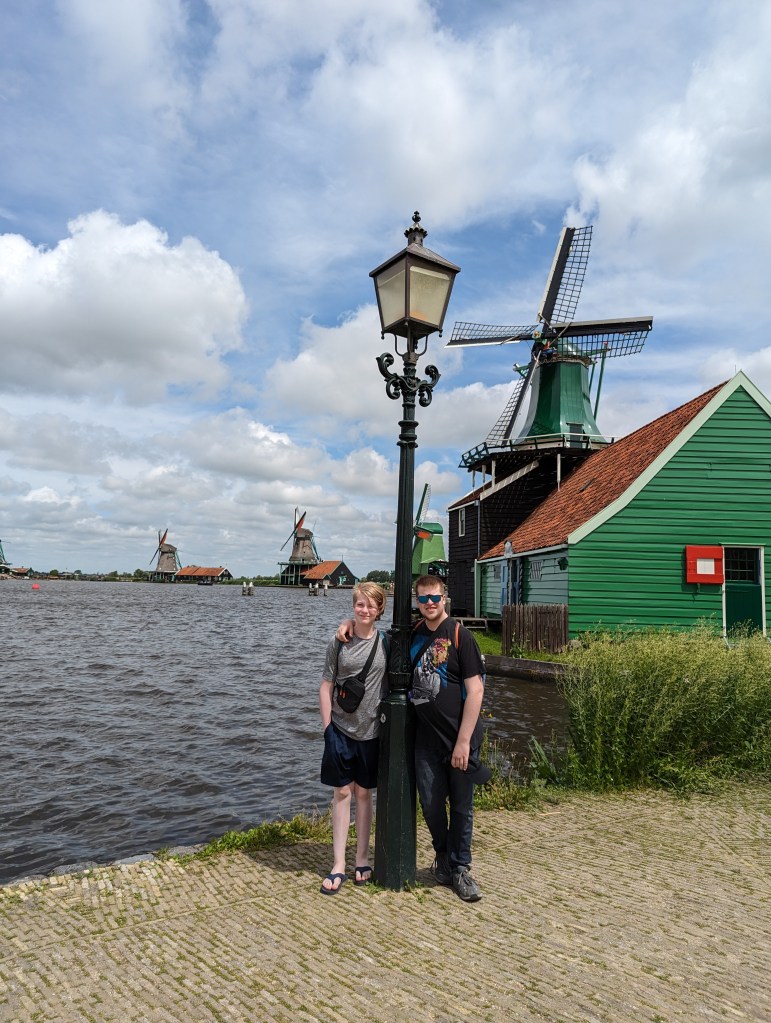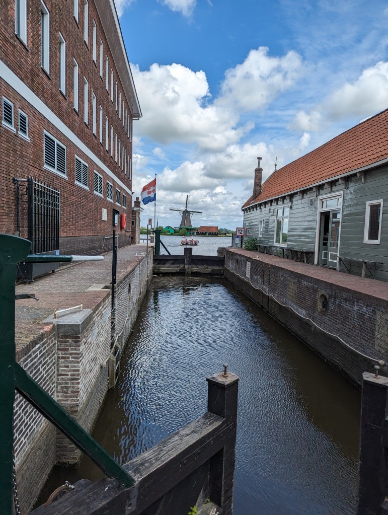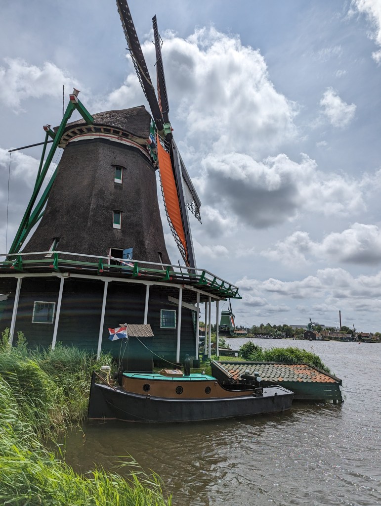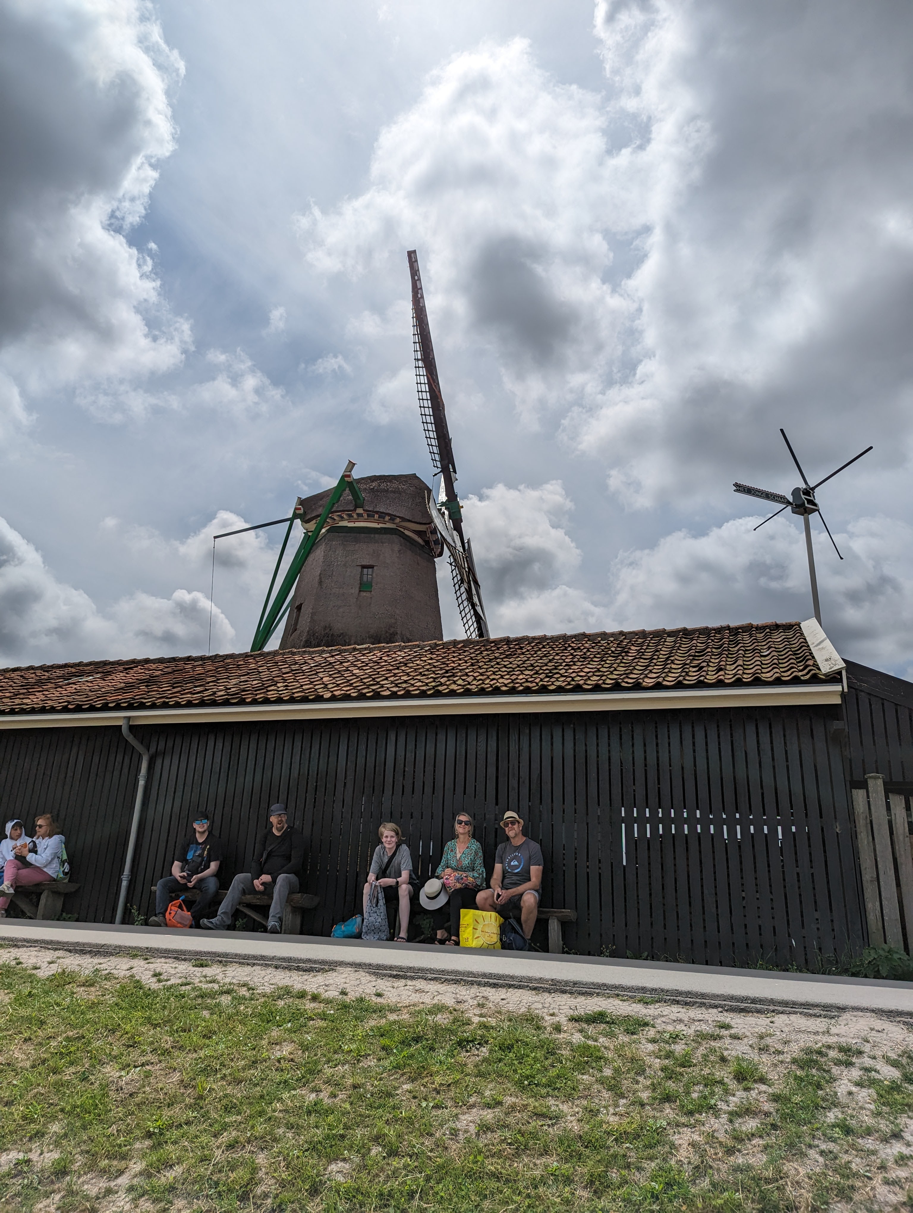 Woke up and went to our lovely breakfast again. Jude is feeling rough. We were trying to decide what to do – options: canal paddle boat, war museum, Van Gogh Museum. Graeme discovered a little town outside of Amsterdam that has windmills – Zaandijk. Everyone was a bit weary of cities, so we hopped on a train and headed out. It was lovely and cool. When we got off the train and walked toward the town, we began to smell chocolate. Then we saw a sign that said, Smells Like Chocolate. Turns out there’s an actual chocolate factory there, so there air actually smells like chocolate. The town was quaint with lots of windmills along a canal. We got some groceries and had a windy picnic. Then we got a volunteer-run ferry, Voetveer Zaandijk – Zaanse Schans, to the other side of the river and had a little self guided tour thru the town. Turns out all the tourist stuff is pretty much closed on Mondays, but that was ok.