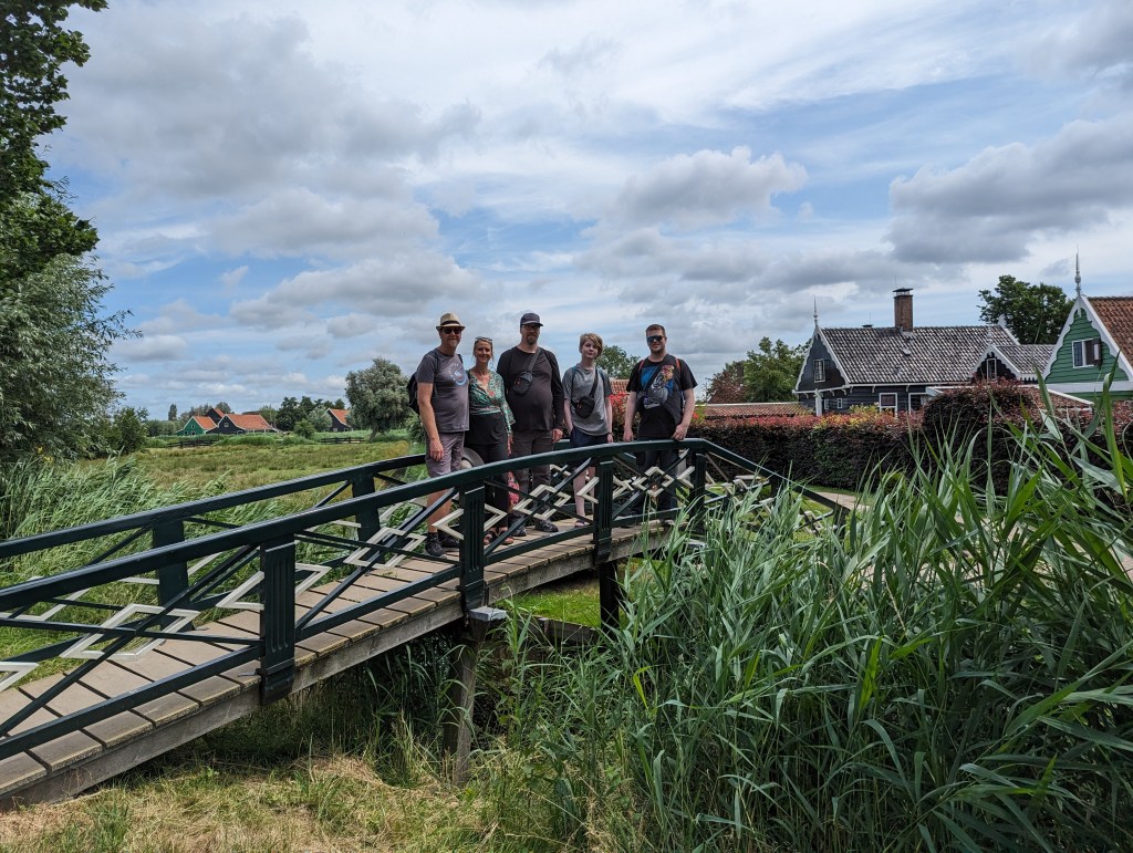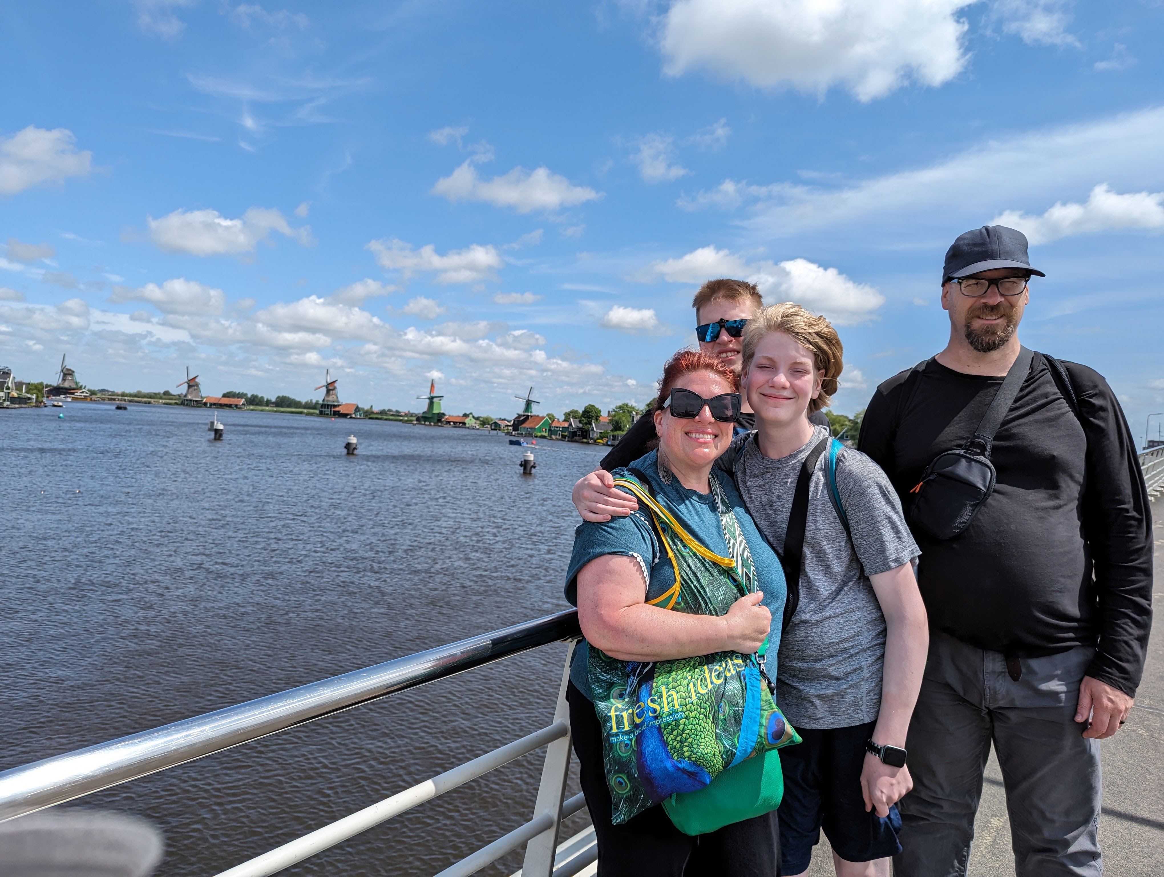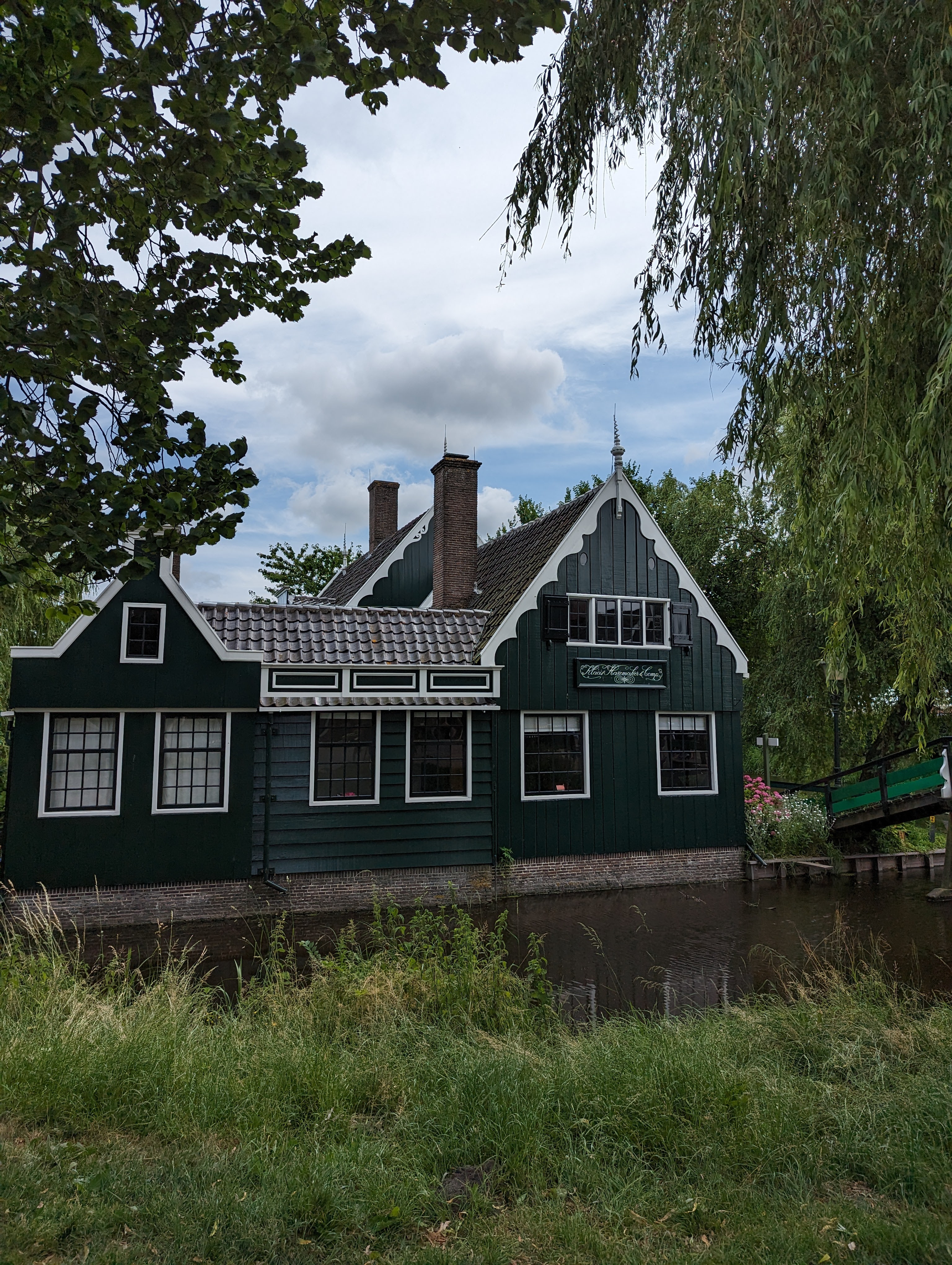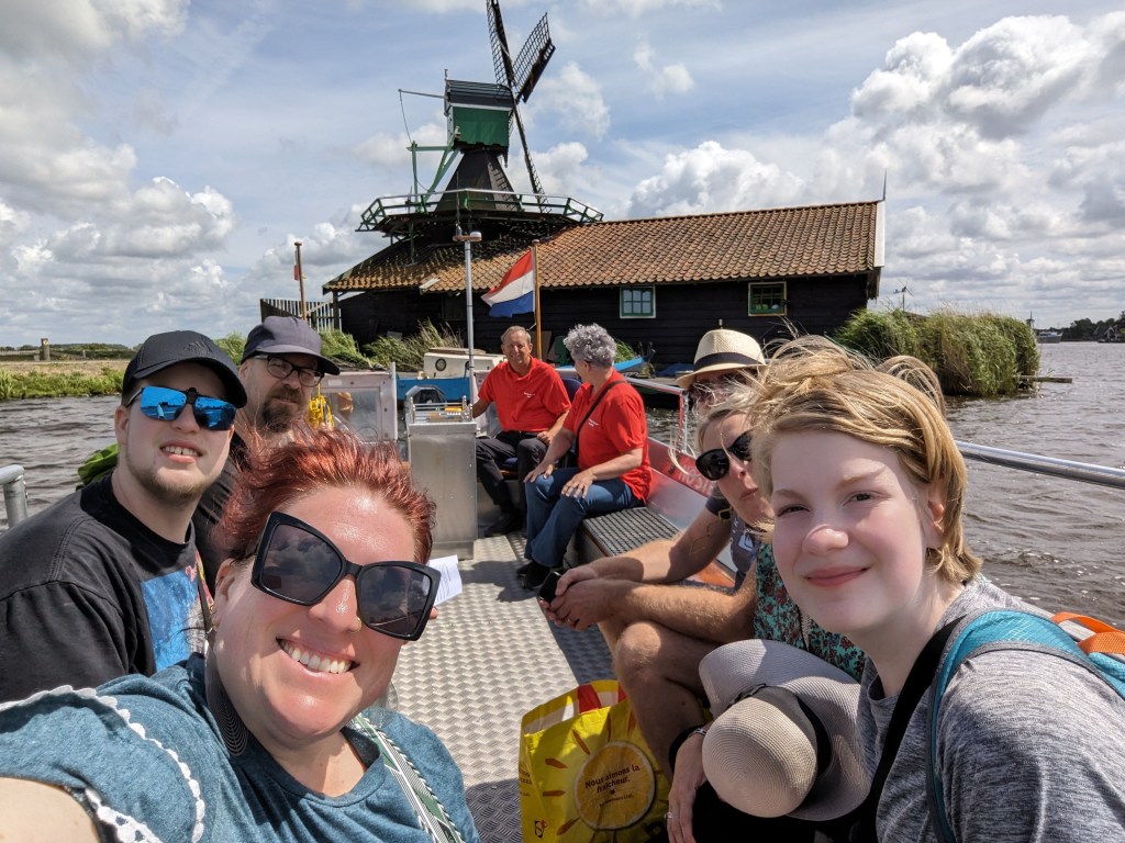 Woke up and went to our lovely breakfast again. Jude is feeling rough. We were trying to decide what to do – options: canal paddle boat, war museum, Van Gogh Museum. Graeme discovered a little town outside of Amsterdam that has windmills – Zaandijk. Everyone was a bit weary of cities, so we hopped on a train and headed out. It was lovely and cool. When we got off the train and walked toward the town, we began to smell chocolate. Then we saw a sign that said, Smells Like Chocolate. Turns out there’s an actual chocolate factory there, so there air actually smells like chocolate. The town was quaint with lots of windmills along a canal. We got some groceries and had a windy picnic. Then we got a volunteer-run ferry, Voetveer Zaandijk – Zaanse Schans, to the other side of the river and had a little self guided tour thru the town. Turns out all the tourist stuff is pretty much closed on Mondays, but that was ok.