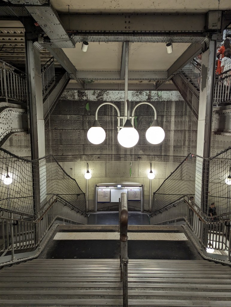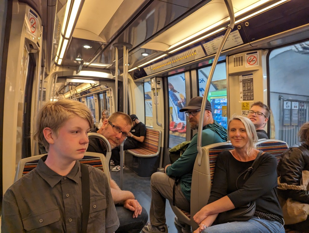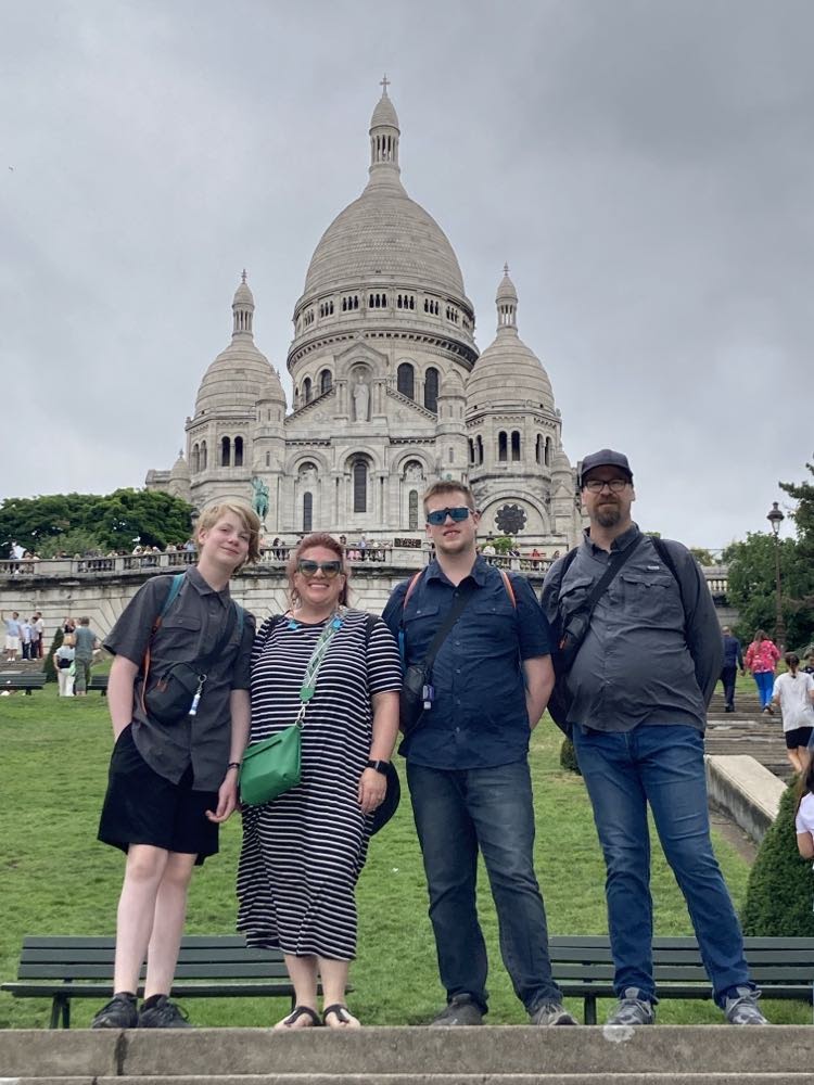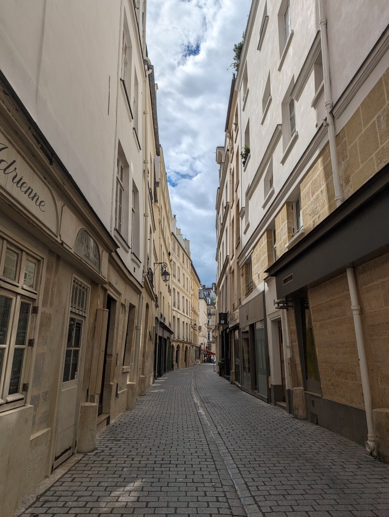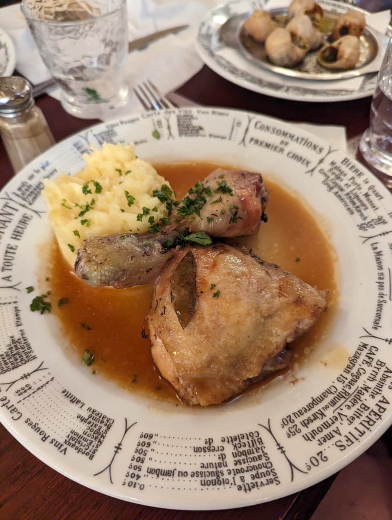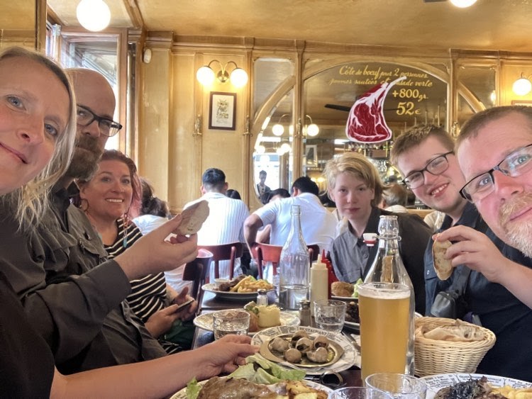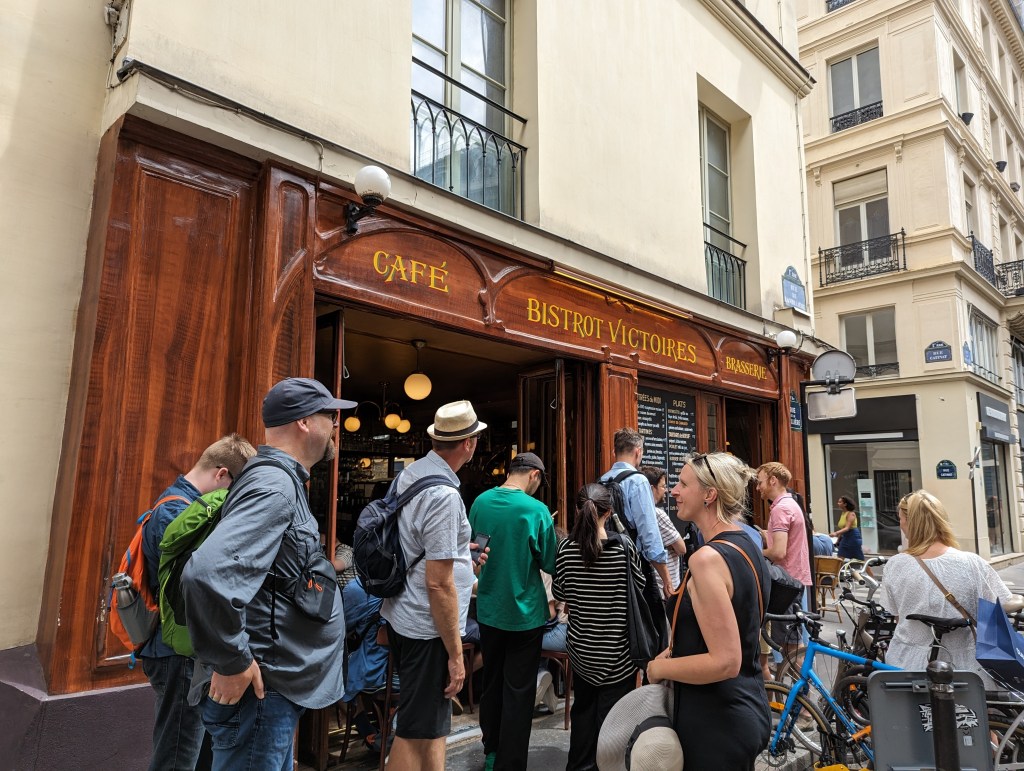 We continued on our way through Paris to a restaurant called Bistrot Victoires. It is a French place that has reasonable prices. Obviously popular as we had to wait a while – particularly since there were 6 of us. Made do in the rain before we were seated. It was so cool. We had 2 kinds of steak, duck confit, and chicken. All of it was super tasty. Graeme ordered escargot and everyone had one, even Colin and Zane. Took Zane a while, but once he tried it, he said he liked it apart from the fact that he knew he was eating a snail.