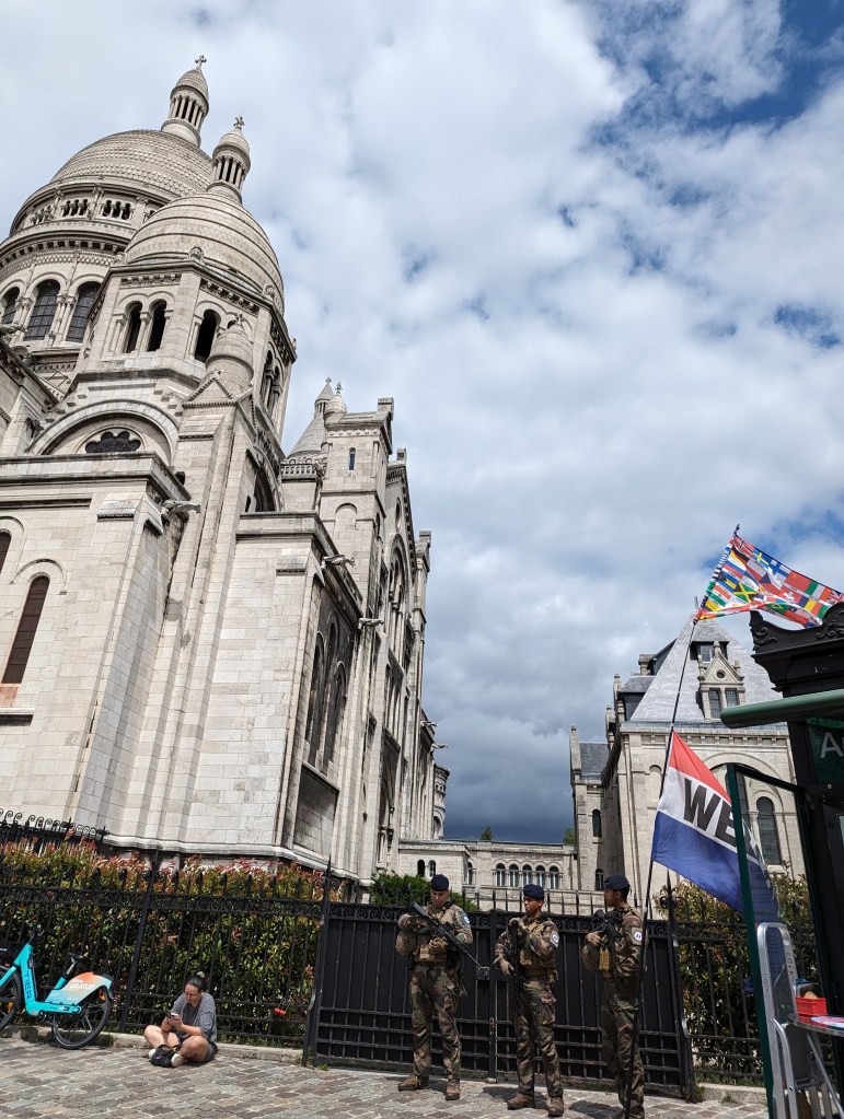 Another yummy bakery breakfast and coffee before heading off to Monte Marte and the Sacre Coeur. The church itself is just stunning and quite unusual looking with its 3 domes and white stone. Outside the church is an absolute circus. Vendors, street performers, lines to get in. It really affected Becky and she was just about ready to start flipping tables. There were also soldiers armed with assault rifles.