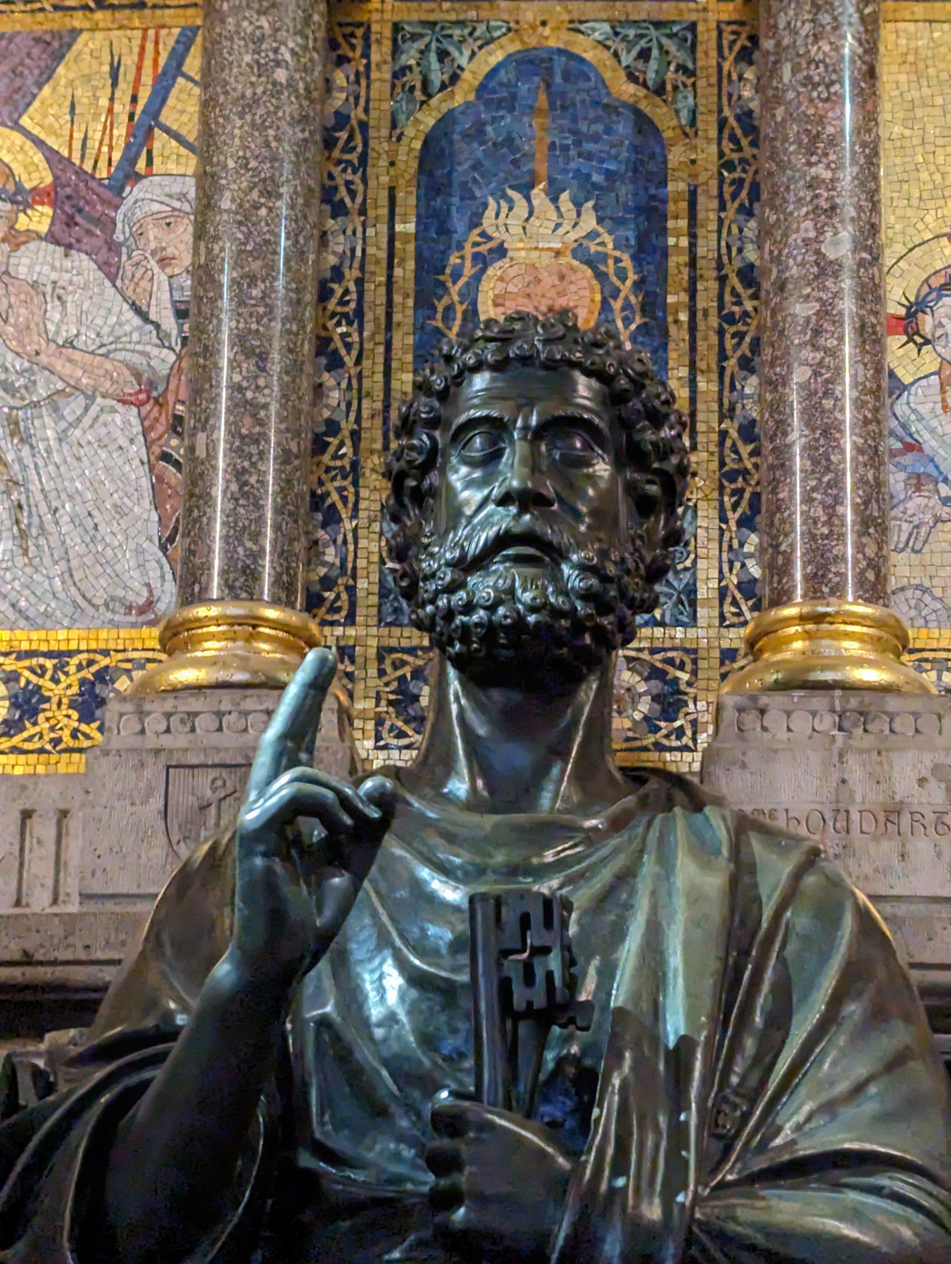 Inside, the church takes your breath away with the many incredible mosaics, stained glass, statues. There’s a solid silver Jesus, a statue of St Peter that looks like Will Farrell, a stained glass dedicated to St Dracula (actually St Vincent, but the likeness is uncanny), a golden Mary. The mosaic over the altar is incredible – it shows everyone coming and bowing before Jesus – soldiers, priests, business people, the rich, the poor, adults, children, people from other countries. It’s powerful.