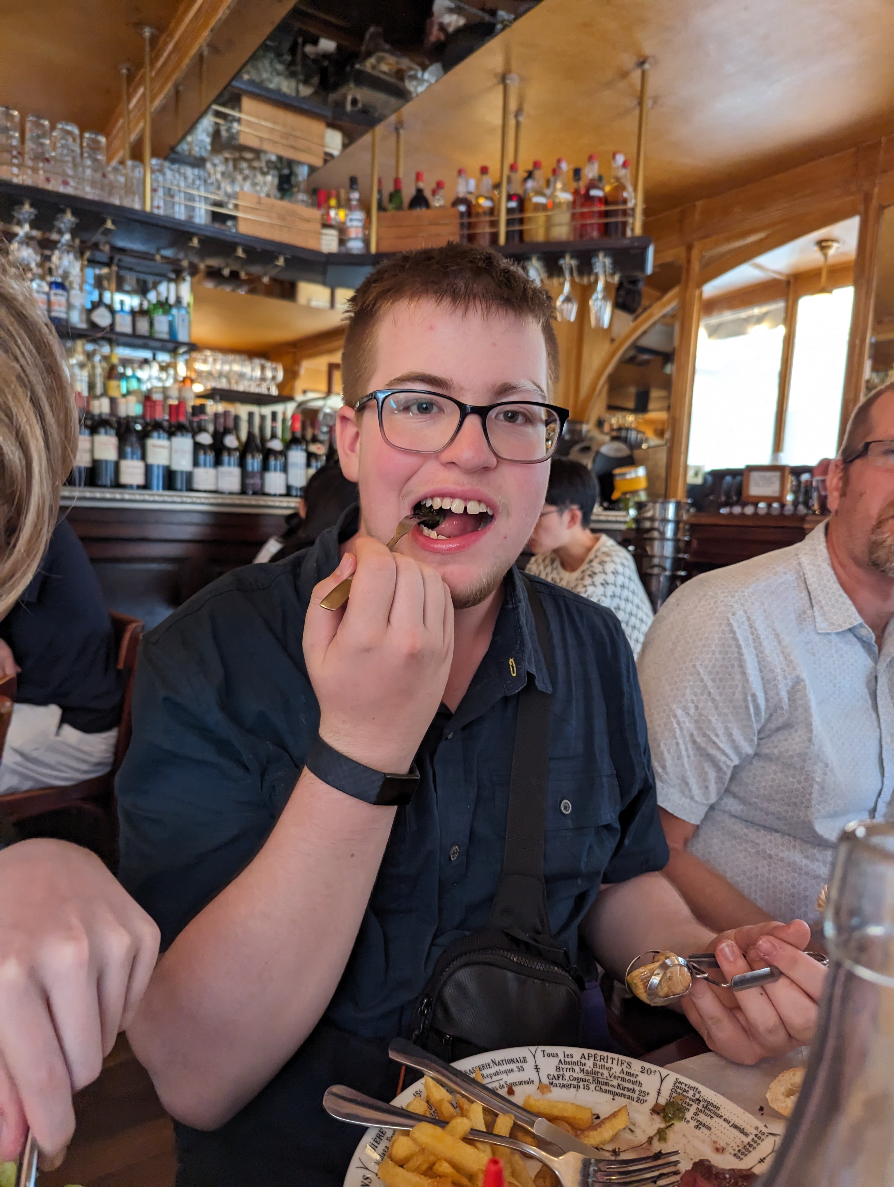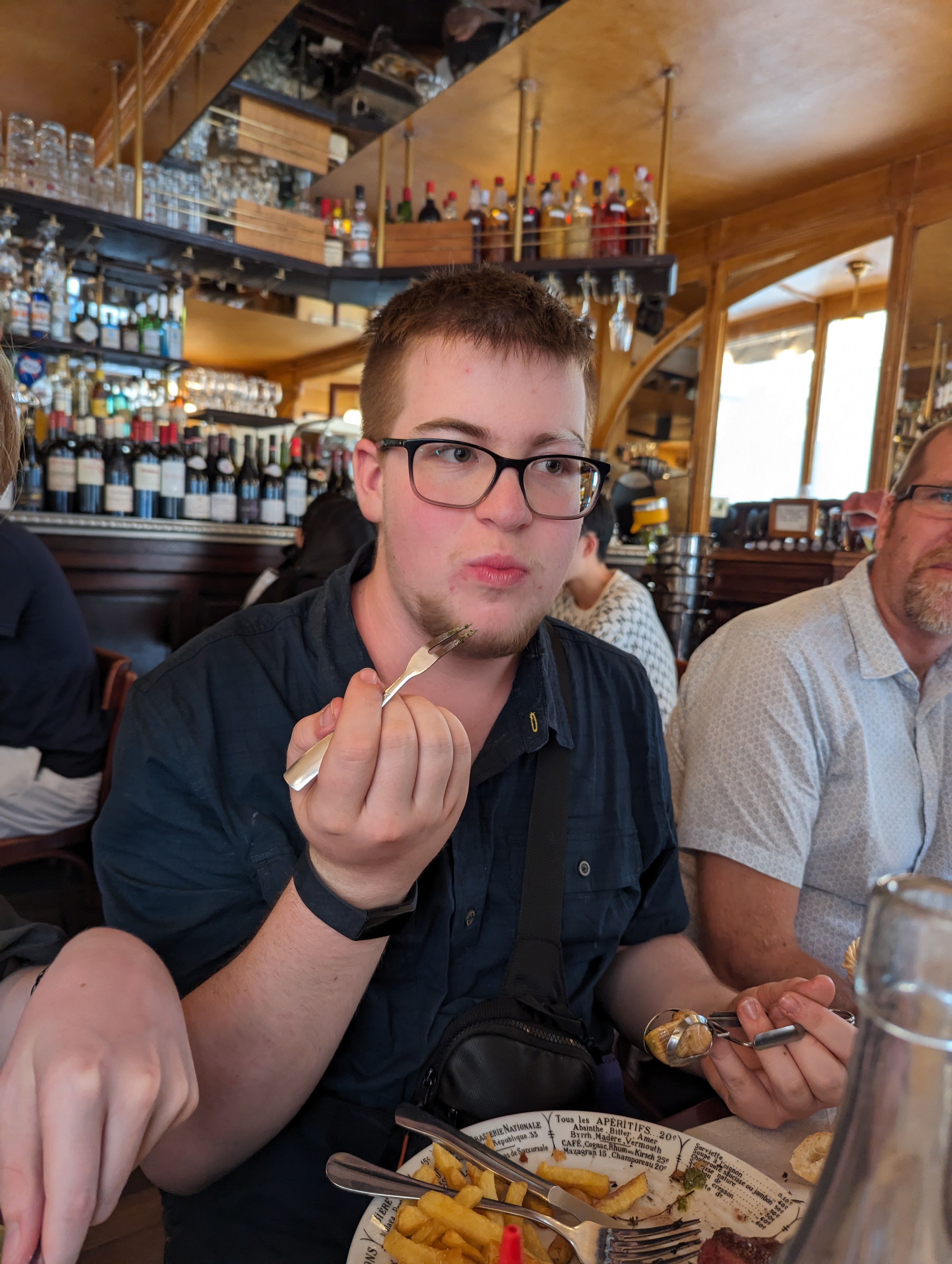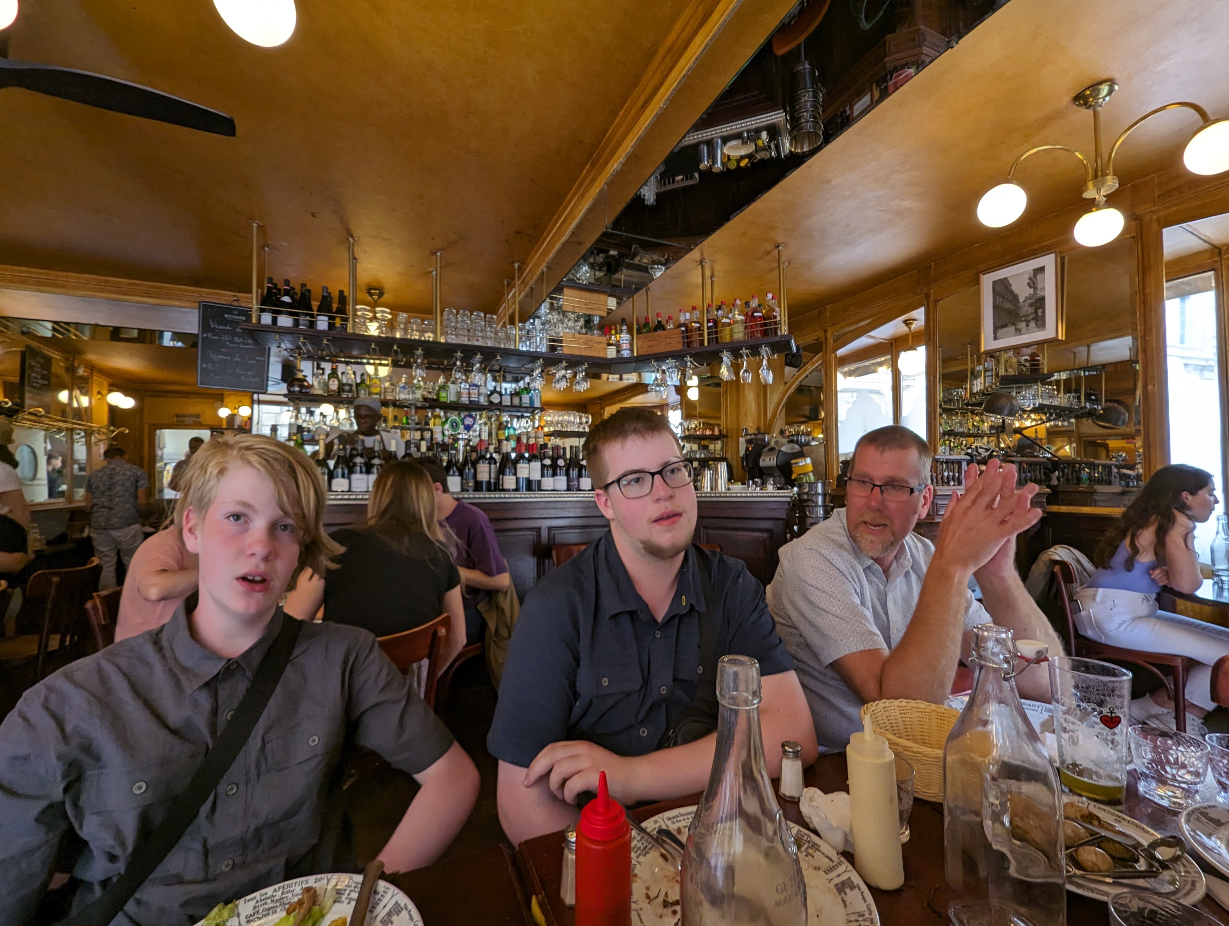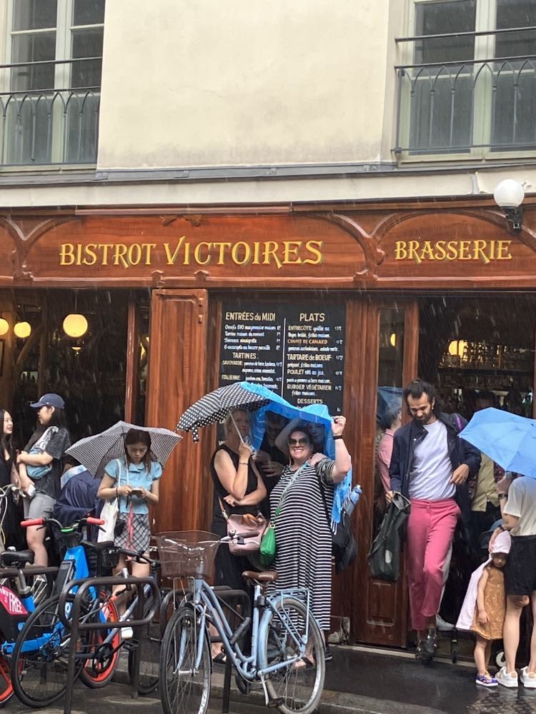 We continued on our way through Paris to a restaurant called Bistrot Victoires. It is a French place that has reasonable prices. Obviously popular as we had to wait a while – particularly since there were 6 of us. Made do in the rain before we were seated. It was so cool. We had 2 kinds of steak, duck confit, and chicken. All of it was super tasty. Graeme ordered escargot and everyone had one, even Colin and Zane. Took Zane a while, but once he tried it, he said he liked it apart from the fact that he knew he was eating a snail.